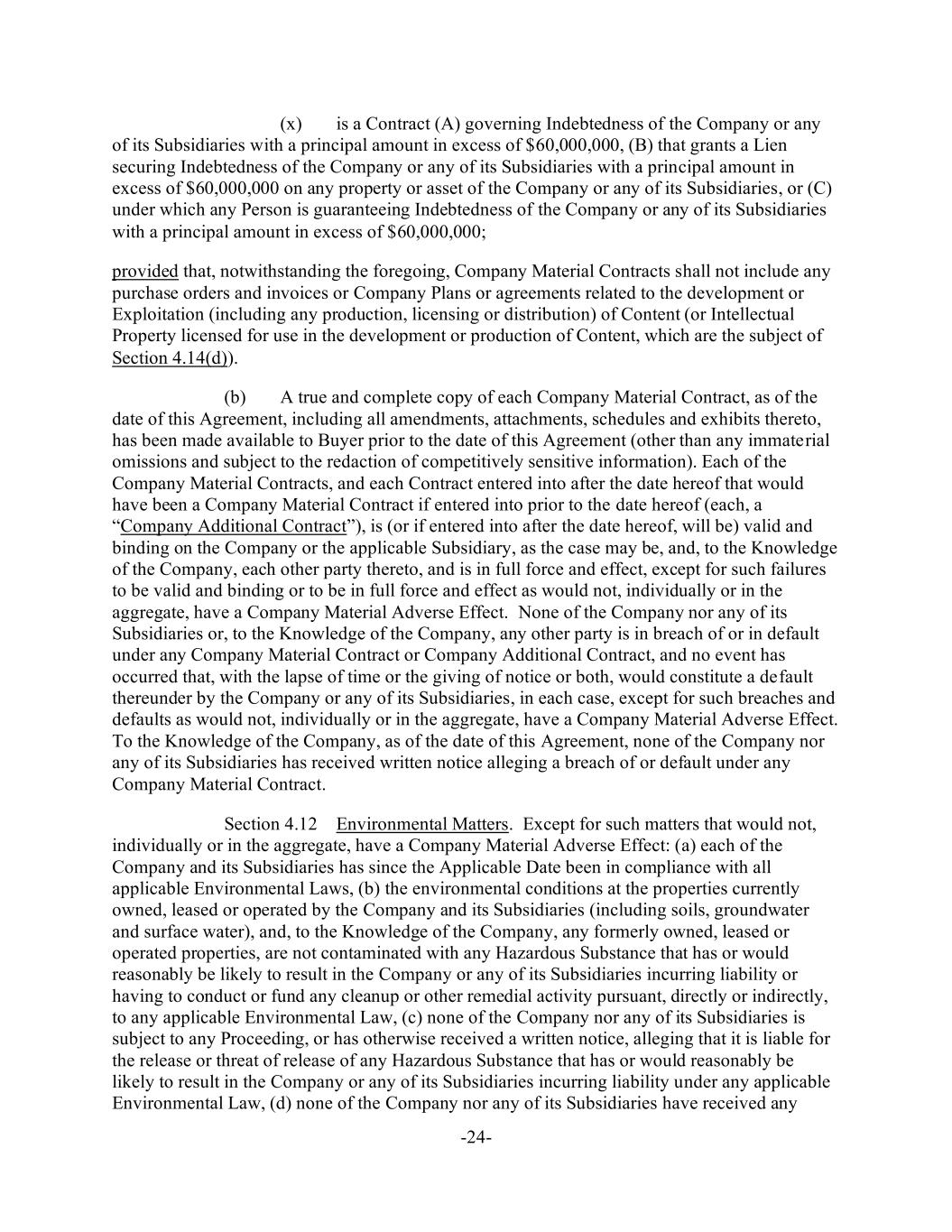 -24- (x) is a Contract (A) governing Indebtedness of the Company or any of its Subsidiaries with a principal amount in excess of $60,000,000, (B) that grants a Lien securing Indebtedness of the Company or any of its Subsidiaries with a principal amount in excess of $60,000,000 on any property or asset of the Company or any of its Subsidiaries, or (C) under which any Person is guaranteeing Indebtedness of the Company or any of its Subsidiaries with a principal amount in excess of $60,000,000; provided that, notwithstanding the foregoing, Company Material Contracts shall not include any purchase orders and invoices or Company Plans or agreements related to the development or Exploitation (including any production, licensing or distribution) of Content (or Intellectual Property licensed for use in the development or production of Content, which are the subject of Section 4.14(d)). (b) A true and complete copy of each Company Material Contract, as of the date of this Agreement, including all amendments, attachments, schedules and exhibits thereto, has been made available to Buyer prior to the date of this Agreement (other than any immaterial omissions and subject to the redaction of competitively sensitive information). Each of the Company Material Contracts, and each Contract entered into after the date hereof that would have been a Company Material Contract if entered into prior to the date hereof (each, a “Company Additional Contract”), is (or if entered into after the date hereof, will be) valid and binding on the Company or the applicable Subsidiary, as the case may be, and, to the Knowledge of the Company, each other party thereto, and is in full force and effect, except for such failures to be valid and binding or to be in full force and effect as would not, individually or in the aggregate, have a Company Material Adverse Effect. None of the Company nor any of its Subsidiaries or, to the Knowledge of the Company, any other party is in breach of or in default under any Company Material Contract or Company Additional Contract, and no event has occurred that, with the lapse of time or the giving of notice or both, would constitute a default thereunder by the Company or any of its Subsidiaries, in each case, except for such breaches and defaults as would not, individually or in the aggregate, have a Company Material Adverse Effect. To the Knowledge of the Company, as of the date of this Agreement, none of the Company nor any of its Subsidiaries has received written notice alleging a breach of or default under any Company Material Contract. Section 4.12 Environmental Matters. Except for such matters that would not, individually or in the aggregate, have a Company Material Adverse Effect: (a) each of the Company and its Subsidiaries has since the Applicable Date been in compliance with all applicable Environmental Laws, (b) the environmental conditions at the properties currently owned, leased or operated by the Company and its Subsidiaries (including soils, groundwater and surface water), and, to the Knowledge of the Company, any formerly owned, leased or operated properties, are not contaminated with any Hazardous Substance that has or would reasonably be likely to result in the Company or any of its Subsidiaries incurring liability or having to conduct or fund any cleanup or other remedial activity pursuant, directly or indirectly, to any applicable Environmental Law, (c) none of the Company nor any of its Subsidiaries is subject to any Proceeding, or has otherwise received a written notice, alleging that it is liable for the release or threat of release of any Hazardous Substance that has or would reasonably be likely to result in the Company or any of its Subsidiaries incurring liability under any applicable Environmental Law, (d) none of the Company nor any of its Subsidiaries have received any