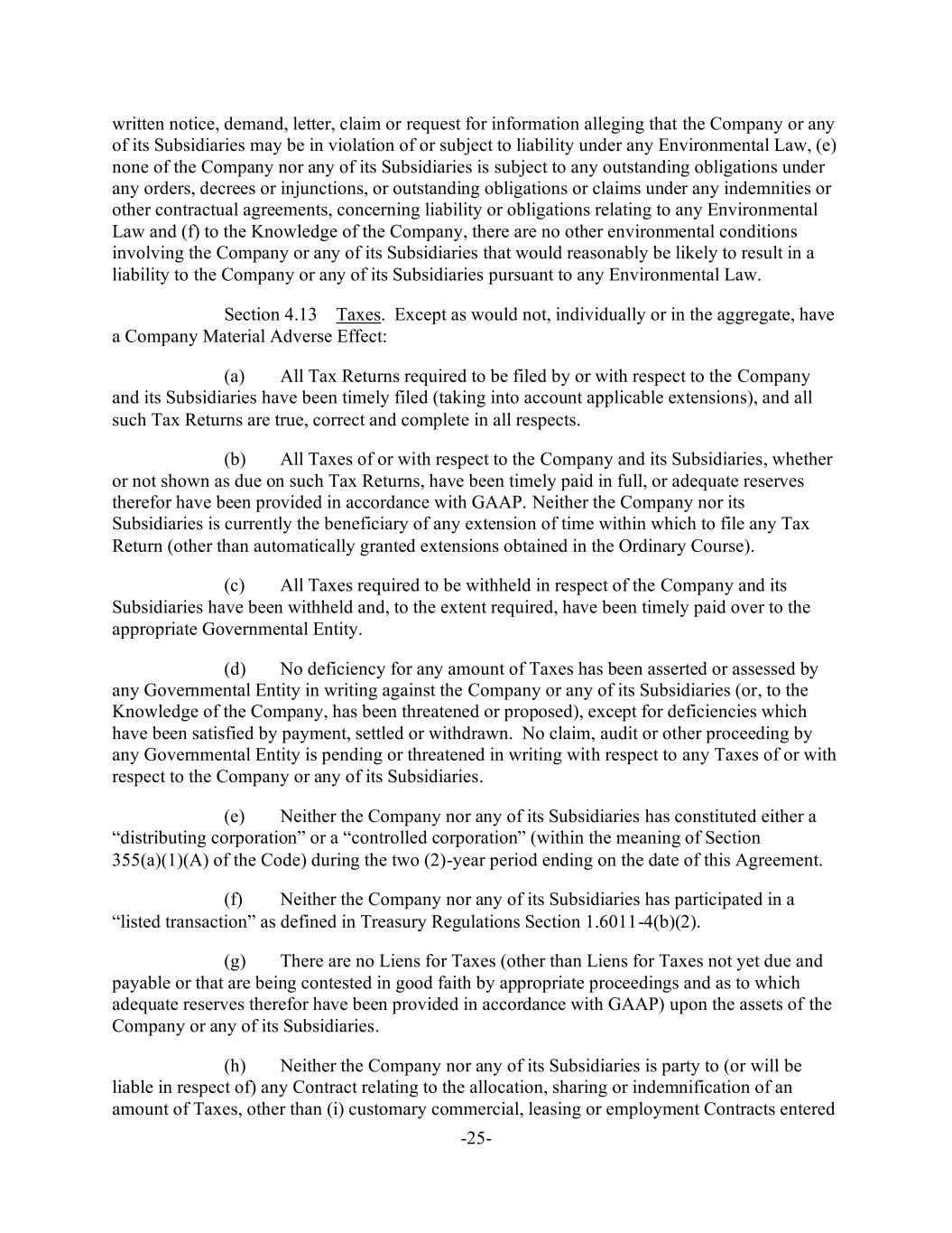 -25- written notice, demand, letter, claim or request for information alleging that the Company or any of its Subsidiaries may be in violation of or subject to liability under any Environmental Law, (e) none of the Company nor any of its Subsidiaries is subject to any outstanding obligations under any orders, decrees or injunctions, or outstanding obligations or claims under any indemnities or other contractual agreements, concerning liability or obligations relating to any Environmental Law and (f) to the Knowledge of the Company, there are no other environmental conditions involving the Company or any of its Subsidiaries that would reasonably be likely to result in a liability to the Company or any of its Subsidiaries pursuant to any Environmental Law. Section 4.13 Taxes. Except as would not, individually or in the aggregate, have a Company Material Adverse Effect: (a) All Tax Returns required to be filed by or with respect to the Company and its Subsidiaries have been timely filed (taking into account applicable extensions), and all such Tax Returns are true, correct and complete in all respects. (b) All Taxes of or with respect to the Company and its Subsidiaries, whether or not shown as due on such Tax Returns, have been timely paid in full, or adequate reserves therefor have been provided in accordance with GAAP. Neither the Company nor its Subsidiaries is currently the beneficiary of any extension of time within which to file any Tax Return (other than automatically granted extensions obtained in the Ordinary Course). (c) All Taxes required to be withheld in respect of the Company and its Subsidiaries have been withheld and, to the extent required, have been timely paid over to the appropriate Governmental Entity. (d) No deficiency for any amount of Taxes has been asserted or assessed by any Governmental Entity in writing against the Company or any of its Subsidiaries (or, to the Knowledge of the Company, has been threatened or proposed), except for deficiencies which have been satisfied by payment, settled or withdrawn. No claim, audit or other proceeding by any Governmental Entity is pending or threatened in writing with respect to any Taxes of or with respect to the Company or any of its Subsidiaries. (e) Neither the Company nor any of its Subsidiaries has constituted either a “distributing corporation” or a “controlled corporation” (within the meaning of Section 355(a)(1)(A) of the Code) during the two (2)-year period ending on the date of this Agreement. (f) Neither the Company nor any of its Subsidiaries has participated in a “listed transaction” as defined in Treasury Regulations Section 1.6011-4(b)(2). (g) There are no Liens for Taxes (other than Liens for Taxes not yet due and payable or that are being contested in good faith by appropriate proceedings and as to which adequate reserves therefor have been provided in accordance with GAAP) upon the assets of the Company or any of its Subsidiaries. (h) Neither the Company nor any of its Subsidiaries is party to (or will be liable in respect of) any Contract relating to the allocation, sharing or indemnification of an amount of Taxes, other than (i) customary commercial, leasing or employment Contracts entered