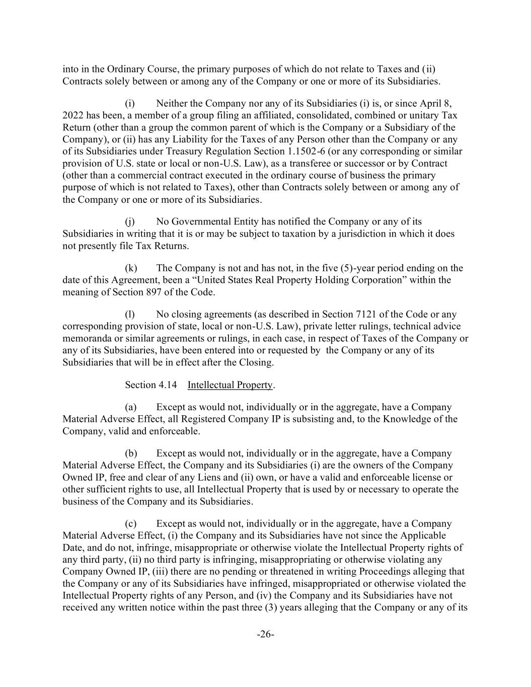 -26- into in the Ordinary Course, the primary purposes of which do not relate to Taxes and (ii) Contracts solely between or among any of the Company or one or more of its Subsidiaries. (i) Neither the Company nor any of its Subsidiaries (i) is, or since April 8, 2022 has been, a member of a group filing an affiliated, consolidated, combined or unitary Tax Return (other than a group the common parent of which is the Company or a Subsidiary of the Company), or (ii) has any Liability for the Taxes of any Person other than the Company or any of its Subsidiaries under Treasury Regulation Section 1.1502-6 (or any corresponding or similar provision of U.S. state or local or non-U.S. Law), as a transferee or successor or by Contract (other than a commercial contract executed in the ordinary course of business the primary purpose of which is not related to Taxes), other than Contracts solely between or among any of the Company or one or more of its Subsidiaries. (j) No Governmental Entity has notified the Company or any of its Subsidiaries in writing that it is or may be subject to taxation by a jurisdiction in which it does not presently file Tax Returns. (k) The Company is not and has not, in the five (5)-year period ending on the date of this Agreement, been a “United States Real Property Holding Corporation” within the meaning of Section 897 of the Code. (l) No closing agreements (as described in Section 7121 of the Code or any corresponding provision of state, local or non-U.S. Law), private letter rulings, technical advice memoranda or similar agreements or rulings, in each case, in respect of Taxes of the Company or any of its Subsidiaries, have been entered into or requested by the Company or any of its Subsidiaries that will be in effect after the Closing. Section 4.14 Intellectual Property. (a) Except as would not, individually or in the aggregate, have a Company Material Adverse Effect, all Registered Company IP is subsisting and, to the Knowledge of the Company, valid and enforceable. (b) Except as would not, individually or in the aggregate, have a Company Material Adverse Effect, the Company and its Subsidiaries (i) are the owners of the Company Owned IP, free and clear of any Liens and (ii) own, or have a valid and enforceable license or other sufficient rights to use, all Intellectual Property that is used by or necessary to operate the business of the Company and its Subsidiaries. (c) Except as would not, individually or in the aggregate, have a Company Material Adverse Effect, (i) the Company and its Subsidiaries have not since the Applicable Date, and do not, infringe, misappropriate or otherwise violate the Intellectual Property rights of any third party, (ii) no third party is infringing, misappropriating or otherwise violating any Company Owned IP, (iii) there are no pending or threatened in writing Proceedings alleging that the Company or any of its Subsidiaries have infringed, misappropriated or otherwise violated the Intellectual Property rights of any Person, and (iv) the Company and its Subsidiaries have not received any written notice within the past three (3) years alleging that the Company or any of its