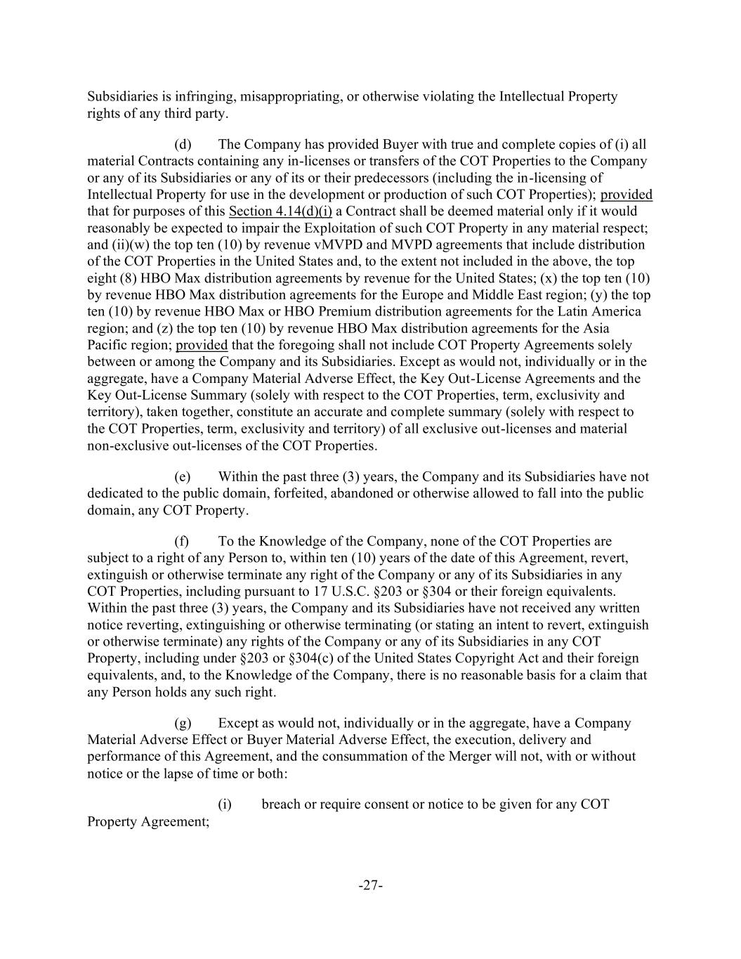 -27- Subsidiaries is infringing, misappropriating, or otherwise violating the Intellectual Property rights of any third party. (d) The Company has provided Buyer with true and complete copies of (i) all material Contracts containing any in-licenses or transfers of the COT Properties to the Company or any of its Subsidiaries or any of its or their predecessors (including the in-licensing of Intellectual Property for use in the development or production of such COT Properties); provided that for purposes of this Section 4.14(d)(i) a Contract shall be deemed material only if it would reasonably be expected to impair the Exploitation of such COT Property in any material respect; and (ii)(w) the top ten (10) by revenue vMVPD and MVPD agreements that include distribution of the COT Properties in the United States and, to the extent not included in the above, the top eight (8) HBO Max distribution agreements by revenue for the United States; (x) the top ten (10) by revenue HBO Max distribution agreements for the Europe and Middle East region; (y) the top ten (10) by revenue HBO Max or HBO Premium distribution agreements for the Latin America region; and (z) the top ten (10) by revenue HBO Max distribution agreements for the Asia Pacific region; provided that the foregoing shall not include COT Property Agreements solely between or among the Company and its Subsidiaries. Except as would not, individually or in the aggregate, have a Company Material Adverse Effect, the Key Out-License Agreements and the Key Out-License Summary (solely with respect to the COT Properties, term, exclusivity and territory), taken together, constitute an accurate and complete summary (solely with respect to the COT Properties, term, exclusivity and territory) of all exclusive out-licenses and material non-exclusive out-licenses of the COT Properties. (e) Within the past three (3) years, the Company and its Subsidiaries have not dedicated to the public domain, forfeited, abandoned or otherwise allowed to fall into the public domain, any COT Property. (f) To the Knowledge of the Company, none of the COT Properties are subject to a right of any Person to, within ten (10) years of the date of this Agreement, revert, extinguish or otherwise terminate any right of the Company or any of its Subsidiaries in any COT Properties, including pursuant to 17 U.S.C. §203 or §304 or their foreign equivalents. Within the past three (3) years, the Company and its Subsidiaries have not received any written notice reverting, extinguishing or otherwise terminating (or stating an intent to revert, extinguish or otherwise terminate) any rights of the Company or any of its Subsidiaries in any COT Property, including under §203 or §304(c) of the United States Copyright Act and their foreign equivalents, and, to the Knowledge of the Company, there is no reasonable basis for a claim that any Person holds any such right. (g) Except as would not, individually or in the aggregate, have a Company Material Adverse Effect or Buyer Material Adverse Effect, the execution, delivery and performance of this Agreement, and the consummation of the Merger will not, with or without notice or the lapse of time or both: (i) breach or require consent or notice to be given for any COT Property Agreement;