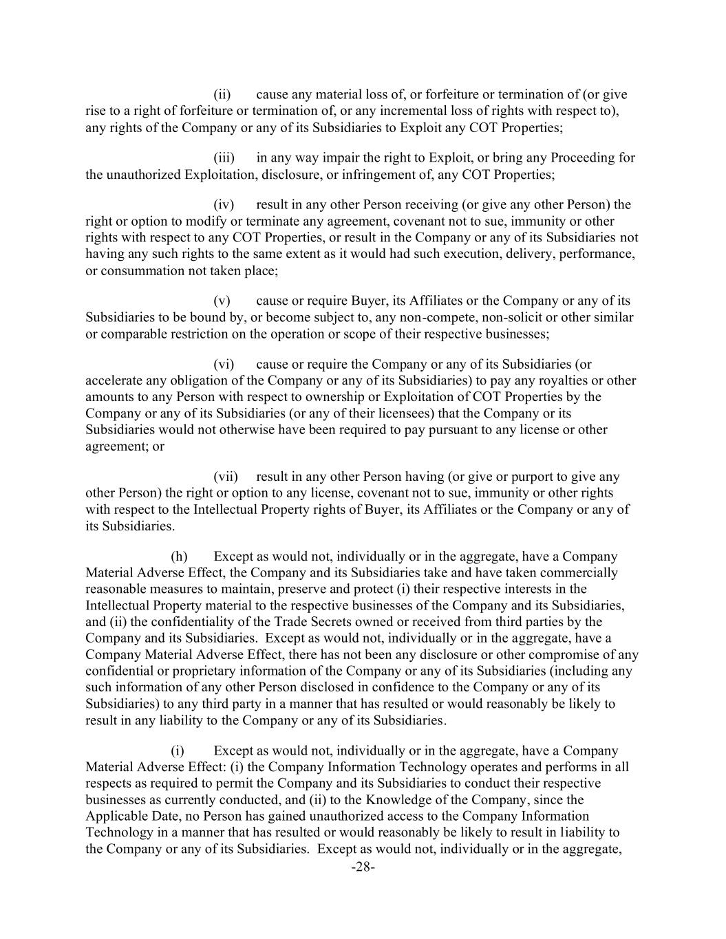 -28- (ii) cause any material loss of, or forfeiture or termination of (or give rise to a right of forfeiture or termination of, or any incremental loss of rights with respect to), any rights of the Company or any of its Subsidiaries to Exploit any COT Properties; (iii) in any way impair the right to Exploit, or bring any Proceeding for the unauthorized Exploitation, disclosure, or infringement of, any COT Properties; (iv) result in any other Person receiving (or give any other Person) the right or option to modify or terminate any agreement, covenant not to sue, immunity or other rights with respect to any COT Properties, or result in the Company or any of its Subsidiaries not having any such rights to the same extent as it would had such execution, delivery, performance, or consummation not taken place; (v) cause or require Buyer, its Affiliates or the Company or any of its Subsidiaries to be bound by, or become subject to, any non-compete, non-solicit or other similar or comparable restriction on the operation or scope of their respective businesses; (vi) cause or require the Company or any of its Subsidiaries (or accelerate any obligation of the Company or any of its Subsidiaries) to pay any royalties or other amounts to any Person with respect to ownership or Exploitation of COT Properties by the Company or any of its Subsidiaries (or any of their licensees) that the Company or its Subsidiaries would not otherwise have been required to pay pursuant to any license or other agreement; or (vii) result in any other Person having (or give or purport to give any other Person) the right or option to any license, covenant not to sue, immunity or other rights with respect to the Intellectual Property rights of Buyer, its Affiliates or the Company or any of its Subsidiaries. (h) Except as would not, individually or in the aggregate, have a Company Material Adverse Effect, the Company and its Subsidiaries take and have taken commercially reasonable measures to maintain, preserve and protect (i) their respective interests in the Intellectual Property material to the respective businesses of the Company and its Subsidiaries, and (ii) the confidentiality of the Trade Secrets owned or received from third parties by the Company and its Subsidiaries. Except as would not, individually or in the aggregate, have a Company Material Adverse Effect, there has not been any disclosure or other compromise of any confidential or proprietary information of the Company or any of its Subsidiaries (including any such information of any other Person disclosed in confidence to the Company or any of its Subsidiaries) to any third party in a manner that has resulted or would reasonably be likely to result in any liability to the Company or any of its Subsidiaries. (i) Except as would not, individually or in the aggregate, have a Company Material Adverse Effect: (i) the Company Information Technology operates and performs in all respects as required to permit the Company and its Subsidiaries to conduct their respective businesses as currently conducted, and (ii) to the Knowledge of the Company, since the Applicable Date, no Person has gained unauthorized access to the Company Information Technology in a manner that has resulted or would reasonably be likely to result in liability to the Company or any of its Subsidiaries. Except as would not, individually or in the aggregate,