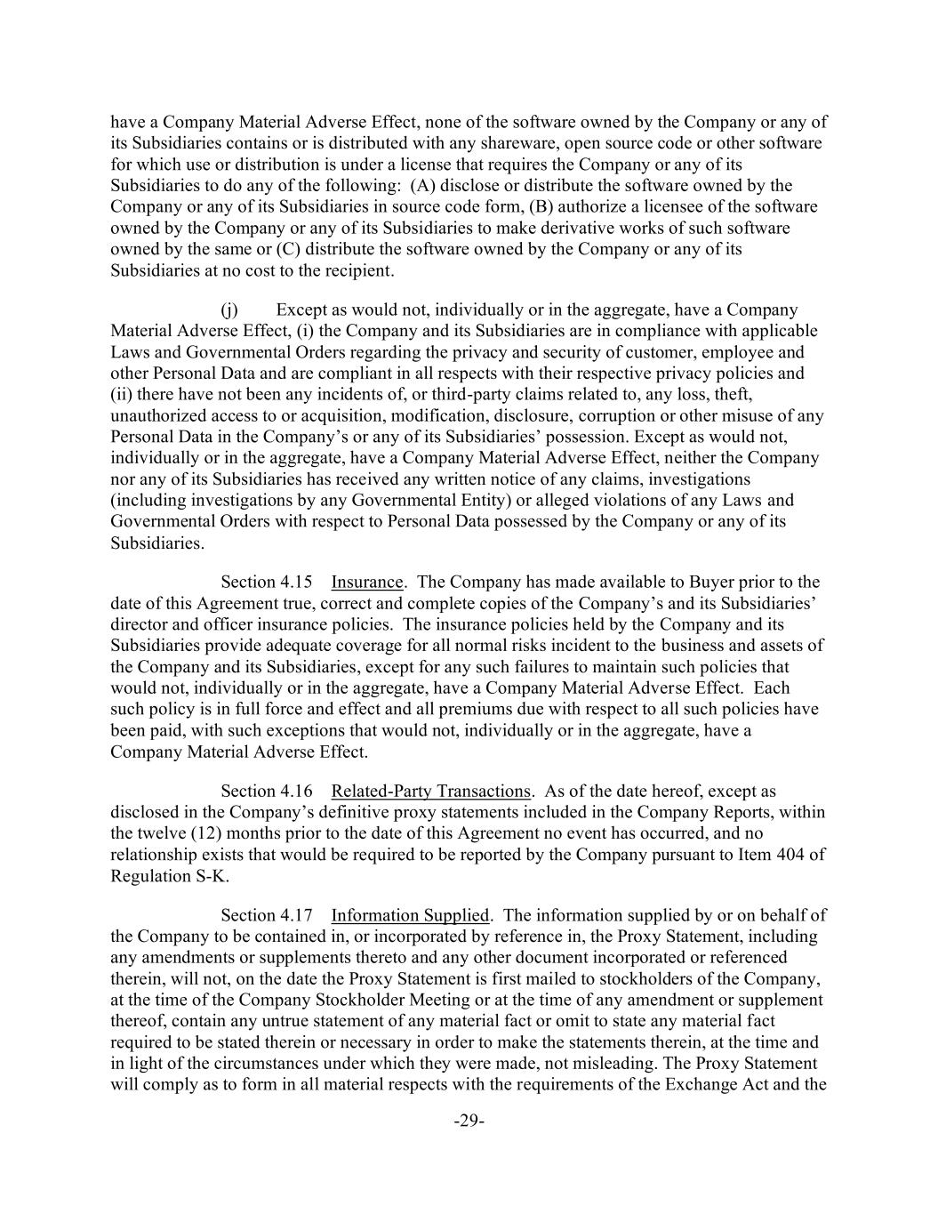 -29- have a Company Material Adverse Effect, none of the software owned by the Company or any of its Subsidiaries contains or is distributed with any shareware, open source code or other software for which use or distribution is under a license that requires the Company or any of its Subsidiaries to do any of the following: (A) disclose or distribute the software owned by the Company or any of its Subsidiaries in source code form, (B) authorize a licensee of the software owned by the Company or any of its Subsidiaries to make derivative works of such software owned by the same or (C) distribute the software owned by the Company or any of its Subsidiaries at no cost to the recipient. (j) Except as would not, individually or in the aggregate, have a Company Material Adverse Effect, (i) the Company and its Subsidiaries are in compliance with applicable Laws and Governmental Orders regarding the privacy and security of customer, employee and other Personal Data and are compliant in all respects with their respective privacy policies and (ii) there have not been any incidents of, or third-party claims related to, any loss, theft, unauthorized access to or acquisition, modification, disclosure, corruption or other misuse of any Personal Data in the Company’s or any of its Subsidiaries’ possession. Except as would not, individually or in the aggregate, have a Company Material Adverse Effect, neither the Company nor any of its Subsidiaries has received any written notice of any claims, investigations (including investigations by any Governmental Entity) or alleged violations of any Laws and Governmental Orders with respect to Personal Data possessed by the Company or any of its Subsidiaries. Section 4.15 Insurance. The Company has made available to Buyer prior to the date of this Agreement true, correct and complete copies of the Company’s and its Subsidiaries’ director and officer insurance policies. The insurance policies held by the Company and its Subsidiaries provide adequate coverage for all normal risks incident to the business and assets of the Company and its Subsidiaries, except for any such failures to maintain such policies that would not, individually or in the aggregate, have a Company Material Adverse Effect. Each such policy is in full force and effect and all premiums due with respect to all such policies have been paid, with such exceptions that would not, individually or in the aggregate, have a Company Material Adverse Effect. Section 4.16 Related-Party Transactions. As of the date hereof, except as disclosed in the Company’s definitive proxy statements included in the Company Reports, within the twelve (12) months prior to the date of this Agreement no event has occurred, and no relationship exists that would be required to be reported by the Company pursuant to Item 404 of Regulation S-K. Section 4.17 Information Supplied. The information supplied by or on behalf of the Company to be contained in, or incorporated by reference in, the Proxy Statement, including any amendments or supplements thereto and any other document incorporated or referenced therein, will not, on the date the Proxy Statement is first mailed to stockholders of the Company, at the time of the Company Stockholder Meeting or at the time of any amendment or supplement thereof, contain any untrue statement of any material fact or omit to state any material fact required to be stated therein or necessary in order to make the statements therein, at the time and in light of the circumstances under which they were made, not misleading. The Proxy Statement will comply as to form in all material respects with the requirements of the Exchange Act and the