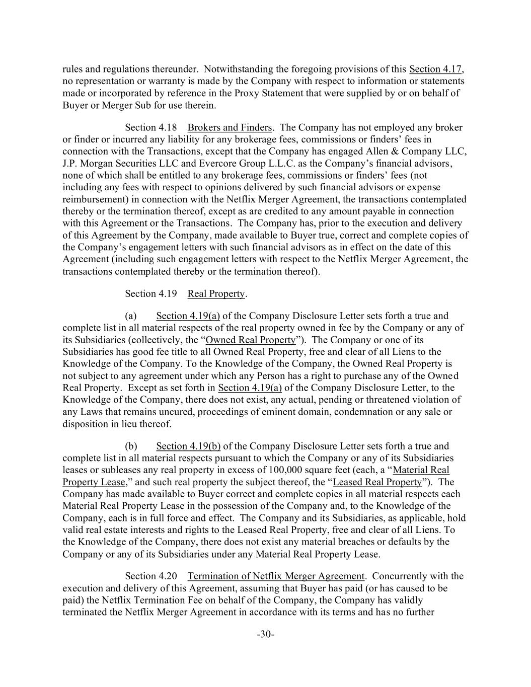 -30- rules and regulations thereunder. Notwithstanding the foregoing provisions of this Section 4.17, no representation or warranty is made by the Company with respect to information or statements made or incorporated by reference in the Proxy Statement that were supplied by or on behalf of Buyer or Merger Sub for use therein. Section 4.18 Brokers and Finders. The Company has not employed any broker or finder or incurred any liability for any brokerage fees, commissions or finders’ fees in connection with the Transactions, except that the Company has engaged Allen & Company LLC, J.P. Morgan Securities LLC and Evercore Group L.L.C. as the Company’s financial advisors , none of which shall be entitled to any brokerage fees, commissions or finders’ fees (not including any fees with respect to opinions delivered by such financial advisors or expense reimbursement) in connection with the Netflix Merger Agreement, the transactions contemplated thereby or the termination thereof, except as are credited to any amount payable in connection with this Agreement or the Transactions. The Company has, prior to the execution and delivery of this Agreement by the Company, made available to Buyer true, correct and complete copies of the Company’s engagement letters with such financial advisors as in effect on the date of this Agreement (including such engagement letters with respect to the Netflix Merger Agreement, the transactions contemplated thereby or the termination thereof). Section 4.19 Real Property. (a) Section 4.19(a) of the Company Disclosure Letter sets forth a true and complete list in all material respects of the real property owned in fee by the Company or any of its Subsidiaries (collectively, the “Owned Real Property”). The Company or one of its Subsidiaries has good fee title to all Owned Real Property, free and clear of all Liens to the Knowledge of the Company. To the Knowledge of the Company, the Owned Real Property is not subject to any agreement under which any Person has a right to purchase any of the Owned Real Property. Except as set forth in Section 4.19(a) of the Company Disclosure Letter, to the Knowledge of the Company, there does not exist, any actual, pending or threatened violation of any Laws that remains uncured, proceedings of eminent domain, condemnation or any sale or disposition in lieu thereof. (b) Section 4.19(b) of the Company Disclosure Letter sets forth a true and complete list in all material respects pursuant to which the Company or any of its Subsidiaries leases or subleases any real property in excess of 100,000 square feet (each, a “Material Real Property Lease,” and such real property the subject thereof, the “Leased Real Property”). The Company has made available to Buyer correct and complete copies in all material respects each Material Real Property Lease in the possession of the Company and, to the Knowledge of the Company, each is in full force and effect. The Company and its Subsidiaries, as applicable, hold valid real estate interests and rights to the Leased Real Property, free and clear of all Liens. To the Knowledge of the Company, there does not exist any material breaches or defaults by the Company or any of its Subsidiaries under any Material Real Property Lease. Section 4.20 Termination of Netflix Merger Agreement. Concurrently with the execution and delivery of this Agreement, assuming that Buyer has paid (or has caused to be paid) the Netflix Termination Fee on behalf of the Company, the Company has validly terminated the Netflix Merger Agreement in accordance with its terms and has no further
