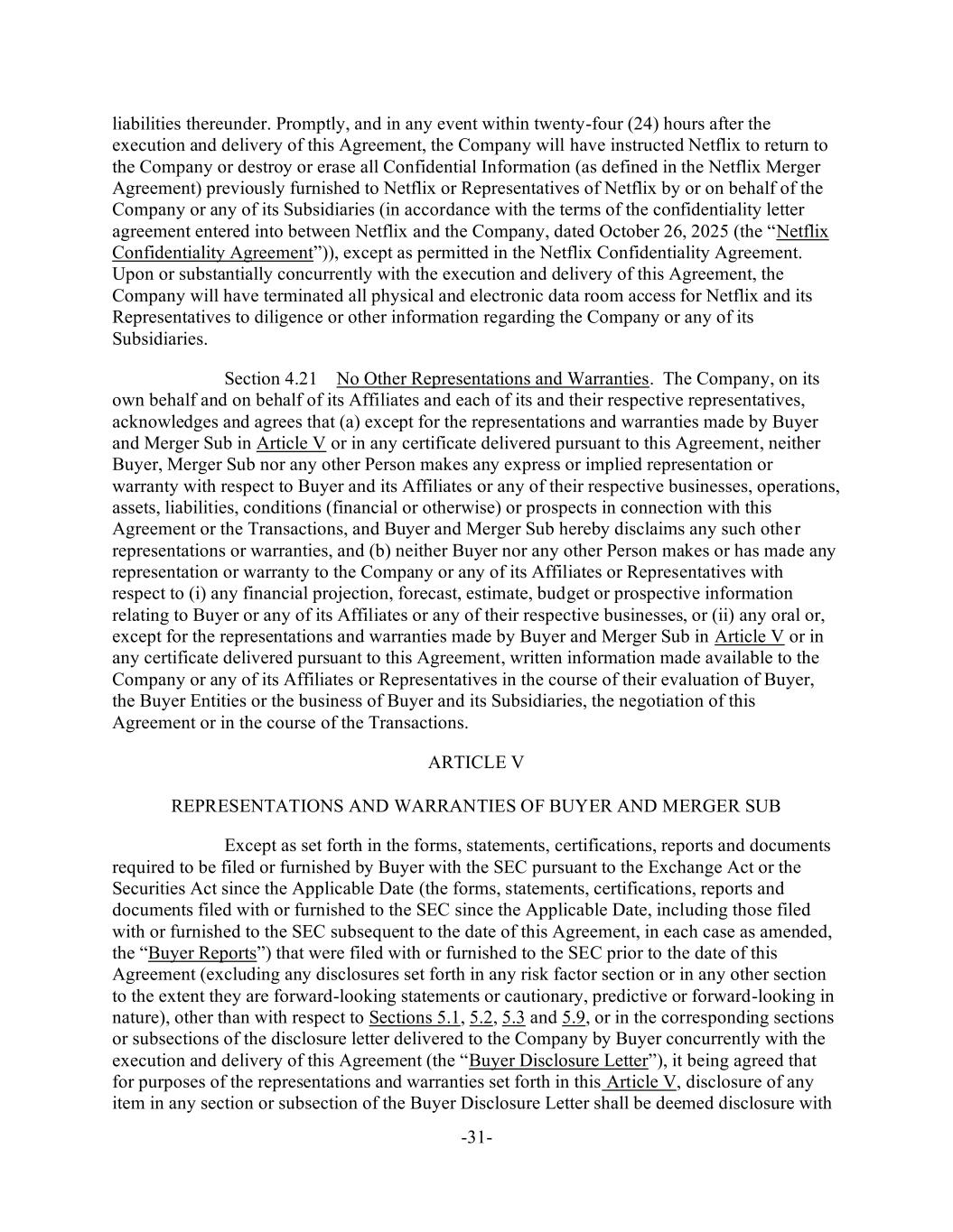 -31- liabilities thereunder. Promptly, and in any event within twenty-four (24) hours after the execution and delivery of this Agreement, the Company will have instructed Netflix to return to the Company or destroy or erase all Confidential Information (as defined in the Netflix Merger Agreement) previously furnished to Netflix or Representatives of Netflix by or on behalf of the Company or any of its Subsidiaries (in accordance with the terms of the confidentiality letter agreement entered into between Netflix and the Company, dated October 26, 2025 (the “Netflix Confidentiality Agreement”)), except as permitted in the Netflix Confidentiality Agreement. Upon or substantially concurrently with the execution and delivery of this Agreement, the Company will have terminated all physical and electronic data room access for Netflix and its Representatives to diligence or other information regarding the Company or any of its Subsidiaries. Section 4.21 No Other Representations and Warranties. The Company, on its own behalf and on behalf of its Affiliates and each of its and their respective representatives, acknowledges and agrees that (a) except for the representations and warranties made by Buyer and Merger Sub in Article V or in any certificate delivered pursuant to this Agreement, neither Buyer, Merger Sub nor any other Person makes any express or implied representation or warranty with respect to Buyer and its Affiliates or any of their respective businesses, operations, assets, liabilities, conditions (financial or otherwise) or prospects in connection with this Agreement or the Transactions, and Buyer and Merger Sub hereby disclaims any such other representations or warranties, and (b) neither Buyer nor any other Person makes or has made any representation or warranty to the Company or any of its Affiliates or Representatives with respect to (i) any financial projection, forecast, estimate, budget or prospective information relating to Buyer or any of its Affiliates or any of their respective businesses, or (ii) any oral or, except for the representations and warranties made by Buyer and Merger Sub in Article V or in any certificate delivered pursuant to this Agreement, written information made available to the Company or any of its Affiliates or Representatives in the course of their evaluation of Buyer, the Buyer Entities or the business of Buyer and its Subsidiaries, the negotiation of this Agreement or in the course of the Transactions. ARTICLE V REPRESENTATIONS AND WARRANTIES OF BUYER AND MERGER SUB Except as set forth in the forms, statements, certifications, reports and documents required to be filed or furnished by Buyer with the SEC pursuant to the Exchange Act or the Securities Act since the Applicable Date (the forms, statements, certifications, reports and documents filed with or furnished to the SEC since the Applicable Date, including those filed with or furnished to the SEC subsequent to the date of this Agreement, in each case as amended, the “Buyer Reports”) that were filed with or furnished to the SEC prior to the date of this Agreement (excluding any disclosures set forth in any risk factor section or in any other section to the extent they are forward-looking statements or cautionary, predictive or forward-looking in nature), other than with respect to Sections 5.1, 5.2, 5.3 and 5.9, or in the corresponding sections or subsections of the disclosure letter delivered to the Company by Buyer concurrently with the execution and delivery of this Agreement (the “Buyer Disclosure Letter”), it being agreed that for purposes of the representations and warranties set forth in this Article V, disclosure of any item in any section or subsection of the Buyer Disclosure Letter shall be deemed disclosure with
