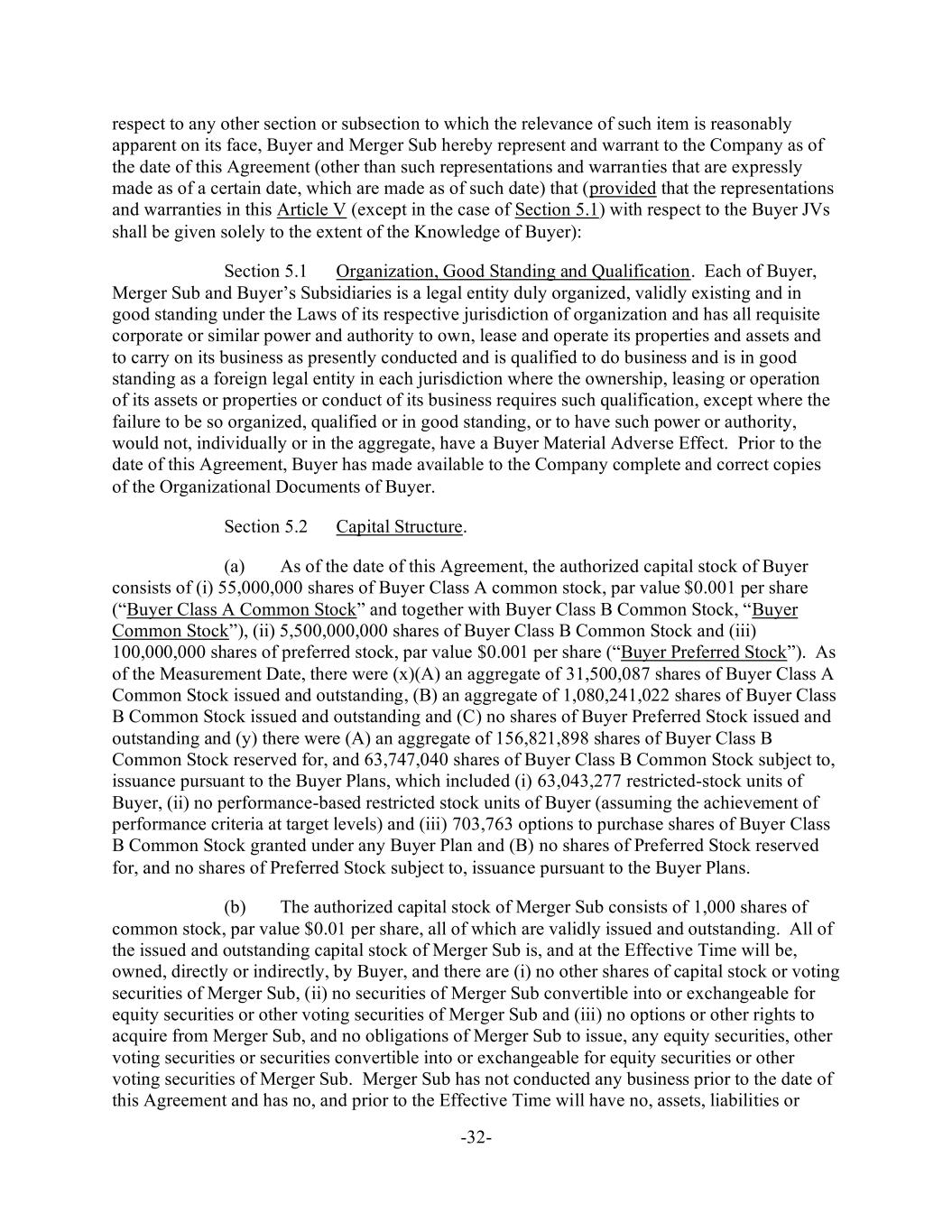 -32- respect to any other section or subsection to which the relevance of such item is reasonably apparent on its face, Buyer and Merger Sub hereby represent and warrant to the Company as of the date of this Agreement (other than such representations and warranties that are expressly made as of a certain date, which are made as of such date) that (provided that the representations and warranties in this Article V (except in the case of Section 5.1) with respect to the Buyer JVs shall be given solely to the extent of the Knowledge of Buyer): Section 5.1 Organization, Good Standing and Qualification. Each of Buyer, Merger Sub and Buyer’s Subsidiaries is a legal entity duly organized, validly existing and in good standing under the Laws of its respective jurisdiction of organization and has all requisite corporate or similar power and authority to own, lease and operate its properties and assets and to carry on its business as presently conducted and is qualified to do business and is in good standing as a foreign legal entity in each jurisdiction where the ownership, leasing or operation of its assets or properties or conduct of its business requires such qualification, except where the failure to be so organized, qualified or in good standing, or to have such power or authority, would not, individually or in the aggregate, have a Buyer Material Adverse Effect. Prior to the date of this Agreement, Buyer has made available to the Company complete and correct copies of the Organizational Documents of Buyer. Section 5.2 Capital Structure. (a) As of the date of this Agreement, the authorized capital stock of Buyer consists of (i) 55,000,000 shares of Buyer Class A common stock, par value $0.001 per share (“Buyer Class A Common Stock” and together with Buyer Class B Common Stock, “Buyer Common Stock”), (ii) 5,500,000,000 shares of Buyer Class B Common Stock and (iii) 100,000,000 shares of preferred stock, par value $0.001 per share (“Buyer Preferred Stock”). As of the Measurement Date, there were (x)(A) an aggregate of 31,500,087 shares of Buyer Class A Common Stock issued and outstanding, (B) an aggregate of 1,080,241,022 shares of Buyer Class B Common Stock issued and outstanding and (C) no shares of Buyer Preferred Stock issued and outstanding and (y) there were (A) an aggregate of 156,821,898 shares of Buyer Class B Common Stock reserved for, and 63,747,040 shares of Buyer Class B Common Stock subject to, issuance pursuant to the Buyer Plans, which included (i) 63,043,277 restricted-stock units of Buyer, (ii) no performance-based restricted stock units of Buyer (assuming the achievement of performance criteria at target levels) and (iii) 703,763 options to purchase shares of Buyer Class B Common Stock granted under any Buyer Plan and (B) no shares of Preferred Stock reserved for, and no shares of Preferred Stock subject to, issuance pursuant to the Buyer Plans. (b) The authorized capital stock of Merger Sub consists of 1,000 shares of common stock, par value $0.01 per share, all of which are validly issued and outstanding. All of the issued and outstanding capital stock of Merger Sub is, and at the Effective Time will be, owned, directly or indirectly, by Buyer, and there are (i) no other shares of capital stock or voting securities of Merger Sub, (ii) no securities of Merger Sub convertible into or exchangeable for equity securities or other voting securities of Merger Sub and (iii) no options or other rights to acquire from Merger Sub, and no obligations of Merger Sub to issue, any equity securities, other voting securities or securities convertible into or exchangeable for equity securities or other voting securities of Merger Sub. Merger Sub has not conducted any business prior to the date of this Agreement and has no, and prior to the Effective Time will have no, assets, liabilities or