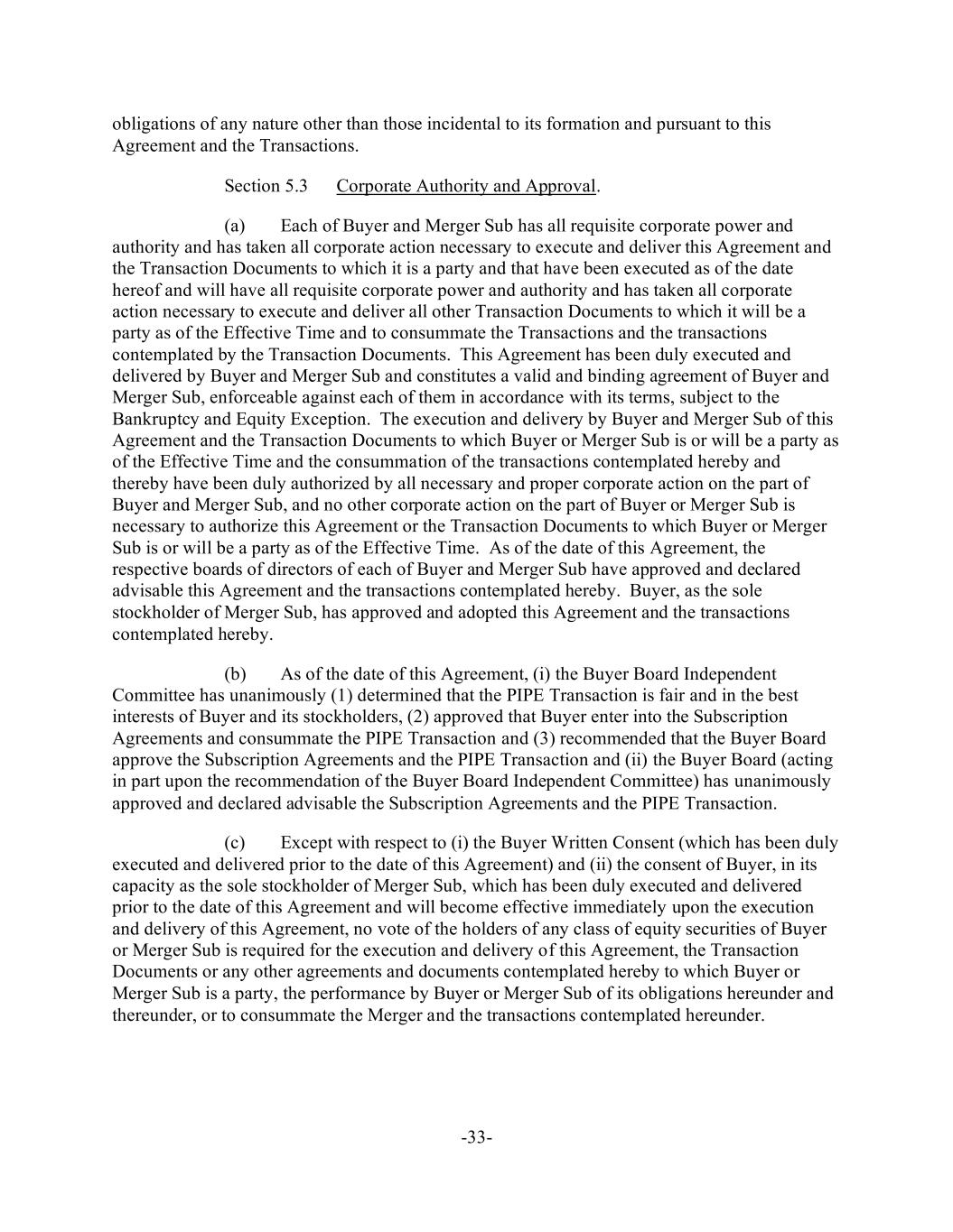 -33- obligations of any nature other than those incidental to its formation and pursuant to this Agreement and the Transactions. Section 5.3 Corporate Authority and Approval. (a) Each of Buyer and Merger Sub has all requisite corporate power and authority and has taken all corporate action necessary to execute and deliver this Agreement and the Transaction Documents to which it is a party and that have been executed as of the date hereof and will have all requisite corporate power and authority and has taken all corporate action necessary to execute and deliver all other Transaction Documents to which it will be a party as of the Effective Time and to consummate the Transactions and the transactions contemplated by the Transaction Documents. This Agreement has been duly executed and delivered by Buyer and Merger Sub and constitutes a valid and binding agreement of Buyer and Merger Sub, enforceable against each of them in accordance with its terms, subject to the Bankruptcy and Equity Exception. The execution and delivery by Buyer and Merger Sub of this Agreement and the Transaction Documents to which Buyer or Merger Sub is or will be a party as of the Effective Time and the consummation of the transactions contemplated hereby and thereby have been duly authorized by all necessary and proper corporate action on the part of Buyer and Merger Sub, and no other corporate action on the part of Buyer or Merger Sub is necessary to authorize this Agreement or the Transaction Documents to which Buyer or Merger Sub is or will be a party as of the Effective Time. As of the date of this Agreement, the respective boards of directors of each of Buyer and Merger Sub have approved and declared advisable this Agreement and the transactions contemplated hereby. Buyer, as the sole stockholder of Merger Sub, has approved and adopted this Agreement and the transactions contemplated hereby. (b) As of the date of this Agreement, (i) the Buyer Board Independent Committee has unanimously (1) determined that the PIPE Transaction is fair and in the best interests of Buyer and its stockholders, (2) approved that Buyer enter into the Subscription Agreements and consummate the PIPE Transaction and (3) recommended that the Buyer Board approve the Subscription Agreements and the PIPE Transaction and (ii) the Buyer Board (acting in part upon the recommendation of the Buyer Board Independent Committee) has unanimously approved and declared advisable the Subscription Agreements and the PIPE Transaction. (c) Except with respect to (i) the Buyer Written Consent (which has been duly executed and delivered prior to the date of this Agreement) and (ii) the consent of Buyer, in its capacity as the sole stockholder of Merger Sub, which has been duly executed and delivered prior to the date of this Agreement and will become effective immediately upon the execution and delivery of this Agreement, no vote of the holders of any class of equity securities of Buyer or Merger Sub is required for the execution and delivery of this Agreement, the Transaction Documents or any other agreements and documents contemplated hereby to which Buyer or Merger Sub is a party, the performance by Buyer or Merger Sub of its obligations hereunder and thereunder, or to consummate the Merger and the transactions contemplated hereunder.