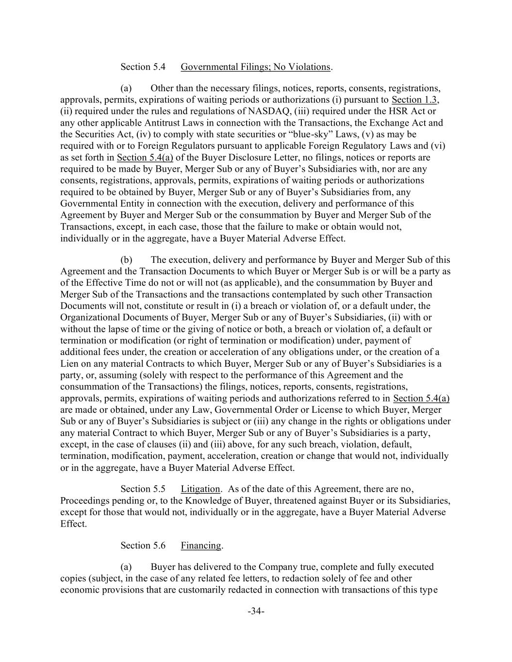 -34- Section 5.4 Governmental Filings; No Violations. (a) Other than the necessary filings, notices, reports, consents, registrations, approvals, permits, expirations of waiting periods or authorizations (i) pursuant to Section 1.3, (ii) required under the rules and regulations of NASDAQ, (iii) required under the HSR Act or any other applicable Antitrust Laws in connection with the Transactions, the Exchange Act and the Securities Act, (iv) to comply with state securities or “blue-sky” Laws, (v) as may be required with or to Foreign Regulators pursuant to applicable Foreign Regulatory Laws and (vi) as set forth in Section 5.4(a) of the Buyer Disclosure Letter, no filings, notices or reports are required to be made by Buyer, Merger Sub or any of Buyer’s Subsidiaries with, nor are any consents, registrations, approvals, permits, expirations of waiting periods or authorizations required to be obtained by Buyer, Merger Sub or any of Buyer’s Subsidiaries from, any Governmental Entity in connection with the execution, delivery and performance of this Agreement by Buyer and Merger Sub or the consummation by Buyer and Merger Sub of the Transactions, except, in each case, those that the failure to make or obtain would not, individually or in the aggregate, have a Buyer Material Adverse Effect. (b) The execution, delivery and performance by Buyer and Merger Sub of this Agreement and the Transaction Documents to which Buyer or Merger Sub is or will be a party as of the Effective Time do not or will not (as applicable), and the consummation by Buyer and Merger Sub of the Transactions and the transactions contemplated by such other Transaction Documents will not, constitute or result in (i) a breach or violation of, or a default under, the Organizational Documents of Buyer, Merger Sub or any of Buyer’s Subsidiaries, (ii) with or without the lapse of time or the giving of notice or both, a breach or violation of, a default or termination or modification (or right of termination or modification) under, payment of additional fees under, the creation or acceleration of any obligations under, or the creation of a Lien on any material Contracts to which Buyer, Merger Sub or any of Buyer’s Subsidiaries is a party, or, assuming (solely with respect to the performance of this Agreement and the consummation of the Transactions) the filings, notices, reports, consents, registrations, approvals, permits, expirations of waiting periods and authorizations referred to in Section 5.4(a) are made or obtained, under any Law, Governmental Order or License to which Buyer, Merger Sub or any of Buyer’s Subsidiaries is subject or (iii) any change in the rights or obligations under any material Contract to which Buyer, Merger Sub or any of Buyer’s Subsidiaries is a party, except, in the case of clauses (ii) and (iii) above, for any such breach, violation, default, termination, modification, payment, acceleration, creation or change that would not, individually or in the aggregate, have a Buyer Material Adverse Effect. Section 5.5 Litigation. As of the date of this Agreement, there are no, Proceedings pending or, to the Knowledge of Buyer, threatened against Buyer or its Subsidiaries, except for those that would not, individually or in the aggregate, have a Buyer Material Adverse Effect. Section 5.6 Financing. (a) Buyer has delivered to the Company true, complete and fully executed copies (subject, in the case of any related fee letters, to redaction solely of fee and other economic provisions that are customarily redacted in connection with transactions of this type