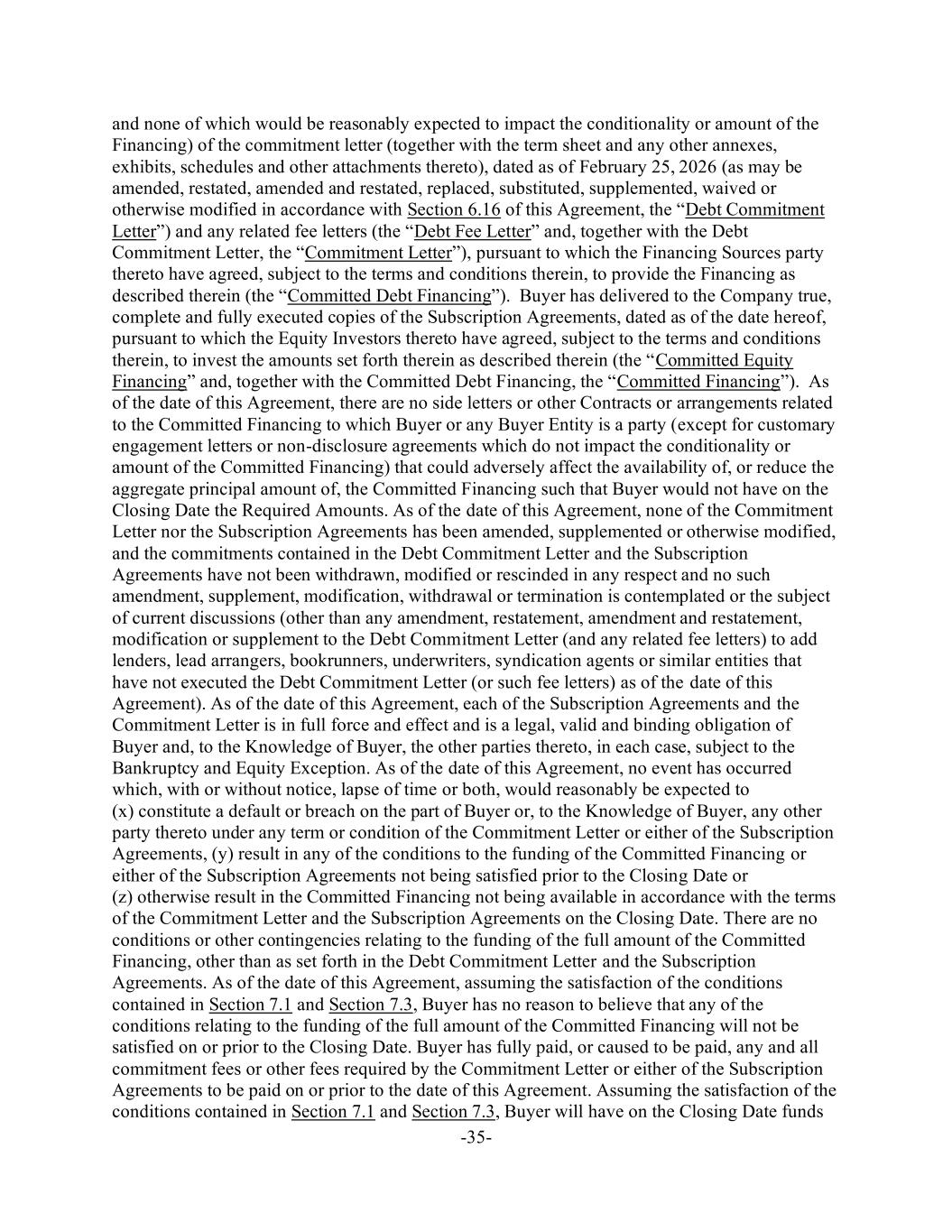 -35- and none of which would be reasonably expected to impact the conditionality or amount of the Financing) of the commitment letter (together with the term sheet and any other annexes, exhibits, schedules and other attachments thereto), dated as of February 25, 2026 (as may be amended, restated, amended and restated, replaced, substituted, supplemented, waived or otherwise modified in accordance with Section 6.16 of this Agreement, the “Debt Commitment Letter”) and any related fee letters (the “Debt Fee Letter” and, together with the Debt Commitment Letter, the “Commitment Letter”), pursuant to which the Financing Sources party thereto have agreed, subject to the terms and conditions therein, to provide the Financing as described therein (the “Committed Debt Financing”). Buyer has delivered to the Company true, complete and fully executed copies of the Subscription Agreements, dated as of the date hereof, pursuant to which the Equity Investors thereto have agreed, subject to the terms and conditions therein, to invest the amounts set forth therein as described therein (the “Committed Equity Financing” and, together with the Committed Debt Financing, the “Committed Financing”). As of the date of this Agreement, there are no side letters or other Contracts or arrangements related to the Committed Financing to which Buyer or any Buyer Entity is a party (except for customary engagement letters or non-disclosure agreements which do not impact the conditionality or amount of the Committed Financing) that could adversely affect the availability of, or reduce the aggregate principal amount of, the Committed Financing such that Buyer would not have on the Closing Date the Required Amounts. As of the date of this Agreement, none of the Commitment Letter nor the Subscription Agreements has been amended, supplemented or otherwise modified, and the commitments contained in the Debt Commitment Letter and the Subscription Agreements have not been withdrawn, modified or rescinded in any respect and no such amendment, supplement, modification, withdrawal or termination is contemplated or the subject of current discussions (other than any amendment, restatement, amendment and restatement, modification or supplement to the Debt Commitment Letter (and any related fee letters) to add lenders, lead arrangers, bookrunners, underwriters, syndication agents or similar entities that have not executed the Debt Commitment Letter (or such fee letters) as of the date of this Agreement). As of the date of this Agreement, each of the Subscription Agreements and the Commitment Letter is in full force and effect and is a legal, valid and binding obligation of Buyer and, to the Knowledge of Buyer, the other parties thereto, in each case, subject to the Bankruptcy and Equity Exception. As of the date of this Agreement, no event has occurred which, with or without notice, lapse of time or both, would reasonably be expected to (x) constitute a default or breach on the part of Buyer or, to the Knowledge of Buyer, any other party thereto under any term or condition of the Commitment Letter or either of the Subscription Agreements, (y) result in any of the conditions to the funding of the Committed Financing or either of the Subscription Agreements not being satisfied prior to the Closing Date or (z) otherwise result in the Committed Financing not being available in accordance with the terms of the Commitment Letter and the Subscription Agreements on the Closing Date. There are no conditions or other contingencies relating to the funding of the full amount of the Committed Financing, other than as set forth in the Debt Commitment Letter and the Subscription Agreements. As of the date of this Agreement, assuming the satisfaction of the conditions contained in Section 7.1 and Section 7.3, Buyer has no reason to believe that any of the conditions relating to the funding of the full amount of the Committed Financing will not be satisfied on or prior to the Closing Date. Buyer has fully paid, or caused to be paid, any and all commitment fees or other fees required by the Commitment Letter or either of the Subscription Agreements to be paid on or prior to the date of this Agreement. Assuming the satisfaction of the conditions contained in Section 7.1 and Section 7.3, Buyer will have on the Closing Date funds
