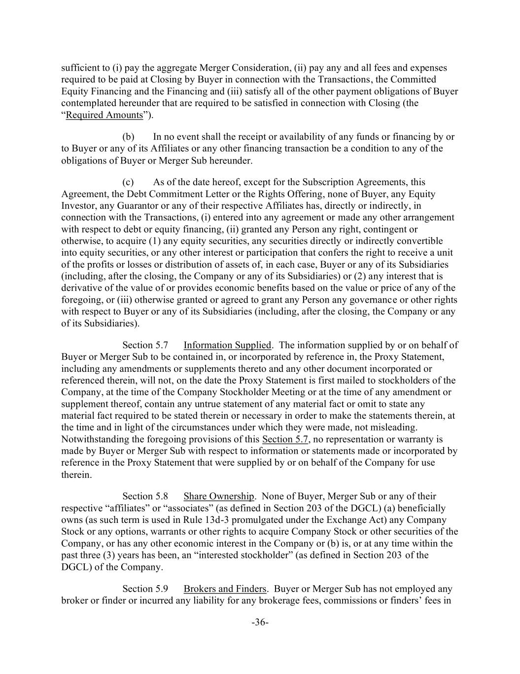 -36- sufficient to (i) pay the aggregate Merger Consideration, (ii) pay any and all fees and expenses required to be paid at Closing by Buyer in connection with the Transactions, the Committed Equity Financing and the Financing and (iii) satisfy all of the other payment obligations of Buyer contemplated hereunder that are required to be satisfied in connection with Closing (the “Required Amounts”). (b) In no event shall the receipt or availability of any funds or financing by or to Buyer or any of its Affiliates or any other financing transaction be a condition to any of the obligations of Buyer or Merger Sub hereunder. (c) As of the date hereof, except for the Subscription Agreements, this Agreement, the Debt Commitment Letter or the Rights Offering, none of Buyer, any Equity Investor, any Guarantor or any of their respective Affiliates has, directly or indirectly, in connection with the Transactions, (i) entered into any agreement or made any other arrangement with respect to debt or equity financing, (ii) granted any Person any right, contingent or otherwise, to acquire (1) any equity securities, any securities directly or indirectly convertible into equity securities, or any other interest or participation that confers the right to receive a unit of the profits or losses or distribution of assets of, in each case, Buyer or any of its Subsidiaries (including, after the closing, the Company or any of its Subsidiaries) or (2) any interest that is derivative of the value of or provides economic benefits based on the value or price of any of the foregoing, or (iii) otherwise granted or agreed to grant any Person any governance or other rights with respect to Buyer or any of its Subsidiaries (including, after the closing, the Company or any of its Subsidiaries). Section 5.7 Information Supplied. The information supplied by or on behalf of Buyer or Merger Sub to be contained in, or incorporated by reference in, the Proxy Statement, including any amendments or supplements thereto and any other document incorporated or referenced therein, will not, on the date the Proxy Statement is first mailed to stockholders of the Company, at the time of the Company Stockholder Meeting or at the time of any amendment or supplement thereof, contain any untrue statement of any material fact or omit to state any material fact required to be stated therein or necessary in order to make the statements therein, at the time and in light of the circumstances under which they were made, not misleading. Notwithstanding the foregoing provisions of this Section 5.7, no representation or warranty is made by Buyer or Merger Sub with respect to information or statements made or incorporated by reference in the Proxy Statement that were supplied by or on behalf of the Company for use therein. Section 5.8 Share Ownership. None of Buyer, Merger Sub or any of their respective “affiliates” or “associates” (as defined in Section 203 of the DGCL) (a) beneficially owns (as such term is used in Rule 13d-3 promulgated under the Exchange Act) any Company Stock or any options, warrants or other rights to acquire Company Stock or other securities of the Company, or has any other economic interest in the Company or (b) is, or at any time within the past three (3) years has been, an “interested stockholder” (as defined in Section 203 of the DGCL) of the Company. Section 5.9 Brokers and Finders. Buyer or Merger Sub has not employed any broker or finder or incurred any liability for any brokerage fees, commissions or finders’ fees in
