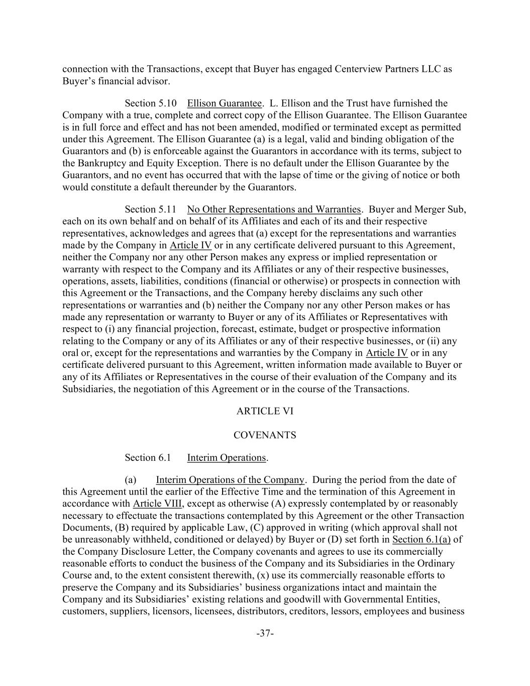 -37- connection with the Transactions, except that Buyer has engaged Centerview Partners LLC as Buyer’s financial advisor. Section 5.10 Ellison Guarantee. L. Ellison and the Trust have furnished the Company with a true, complete and correct copy of the Ellison Guarantee. The Ellison Guarantee is in full force and effect and has not been amended, modified or terminated except as permitted under this Agreement. The Ellison Guarantee (a) is a legal, valid and binding obligation of the Guarantors and (b) is enforceable against the Guarantors in accordance with its terms, subject to the Bankruptcy and Equity Exception. There is no default under the Ellison Guarantee by the Guarantors, and no event has occurred that with the lapse of time or the giving of notice or both would constitute a default thereunder by the Guarantors. Section 5.11 No Other Representations and Warranties. Buyer and Merger Sub, each on its own behalf and on behalf of its Affiliates and each of its and their respective representatives, acknowledges and agrees that (a) except for the representations and warranties made by the Company in Article IV or in any certificate delivered pursuant to this Agreement, neither the Company nor any other Person makes any express or implied representation or warranty with respect to the Company and its Affiliates or any of their respective businesses, operations, assets, liabilities, conditions (financial or otherwise) or prospects in connection with this Agreement or the Transactions, and the Company hereby disclaims any such other representations or warranties and (b) neither the Company nor any other Person makes or has made any representation or warranty to Buyer or any of its Affiliates or Representatives with respect to (i) any financial projection, forecast, estimate, budget or prospective information relating to the Company or any of its Affiliates or any of their respective businesses, or (ii) any oral or, except for the representations and warranties by the Company in Article IV or in any certificate delivered pursuant to this Agreement, written information made available to Buyer or any of its Affiliates or Representatives in the course of their evaluation of the Company and its Subsidiaries, the negotiation of this Agreement or in the course of the Transactions. ARTICLE VI COVENANTS Section 6.1 Interim Operations. (a) Interim Operations of the Company. During the period from the date of this Agreement until the earlier of the Effective Time and the termination of this Agreement in accordance with Article VIII, except as otherwise (A) expressly contemplated by or reasonably necessary to effectuate the transactions contemplated by this Agreement or the other Transaction Documents, (B) required by applicable Law, (C) approved in writing (which approval shall not be unreasonably withheld, conditioned or delayed) by Buyer or (D) set forth in Section 6.1(a) of the Company Disclosure Letter, the Company covenants and agrees to use its commercially reasonable efforts to conduct the business of the Company and its Subsidiaries in the Ordinary Course and, to the extent consistent therewith, (x) use its commercially reasonable efforts to preserve the Company and its Subsidiaries’ business organizations intact and maintain the Company and its Subsidiaries’ existing relations and goodwill with Governmental Entities, customers, suppliers, licensors, licensees, distributors, creditors, lessors, employees and business