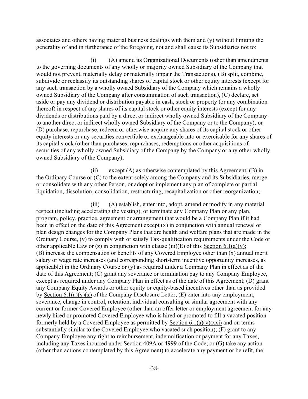 -38- associates and others having material business dealings with them and (y) without limiting the generality of and in furtherance of the foregoing, not and shall cause its Subsidiaries not to: (i) (A) amend its Organizational Documents (other than amendments to the governing documents of any wholly or majority owned Subsidiary of the Company that would not prevent, materially delay or materially impair the Transactions), (B) split, combine, subdivide or reclassify its outstanding shares of capital stock or other equity interests (except for any such transaction by a wholly owned Subsidiary of the Company which remains a wholly owned Subsidiary of the Company after consummation of such transaction), (C) declare, set aside or pay any dividend or distribution payable in cash, stock or property (or any combination thereof) in respect of any shares of its capital stock or other equity interests (except for any dividends or distributions paid by a direct or indirect wholly owned Subsidiary of the Company to another direct or indirect wholly owned Subsidiary of the Company or to the Company), or (D) purchase, repurchase, redeem or otherwise acquire any shares of its capital stock or other equity interests or any securities convertible or exchangeable into or exercisable for any shares of its capital stock (other than purchases, repurchases, redemptions or other acquisitions of securities of any wholly owned Subsidiary of the Company by the Company or any other wholly owned Subsidiary of the Company); (ii) except (A) as otherwise contemplated by this Agreement, (B) in the Ordinary Course or (C) to the extent solely among the Company and its Subsidiaries, merge or consolidate with any other Person, or adopt or implement any plan of complete or partial liquidation, dissolution, consolidation, restructuring, recapitalization or other reorganization; (iii) (A) establish, enter into, adopt, amend or modify in any material respect (including accelerating the vesting), or terminate any Company Plan or any plan, program, policy, practice, agreement or arrangement that would be a Company Plan if it had been in effect on the date of this Agreement except (x) in conjunction with annual renewal or plan design changes for the Company Plans that are health and welfare plans that are made in the Ordinary Course, (y) to comply with or satisfy Tax-qualification requirements under the Code or other applicable Law or (z) in conjunction with clause (iii)(E) of this Section 6.1(a)(y); (B) increase the compensation or benefits of any Covered Employee other than (x) annual merit salary or wage rate increases (and corresponding short-term incentive opportunity increases, as applicable) in the Ordinary Course or (y) as required under a Company Plan in effect as of the date of this Agreement; (C) grant any severance or termination pay to any Company Employee, except as required under any Company Plan in effect as of the date of this Agreement; (D) grant any Company Equity Awards or other equity or equity-based incentives other than as provided by Section 6.1(a)(y)(x) of the Company Disclosure Letter; (E) enter into any employment, severance, change in control, retention, individual consulting or similar agreement with any current or former Covered Employee (other than an offer letter or employment agreement for any newly hired or promoted Covered Employee who is hired or promoted to fill a vacated position formerly held by a Covered Employee as permitted by Section 6.1(a)(y)(xxi) and on terms substantially similar to the Covered Employee who vacated such position); (F) grant to any Company Employee any right to reimbursement, indemnification or payment for any Taxes, including any Taxes incurred under Section 409A or 4999 of the Code; or (G) take any action (other than actions contemplated by this Agreement) to accelerate any payment or benefit, the