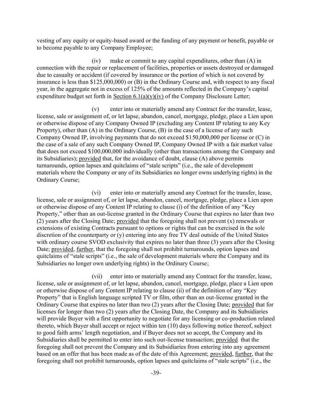 -39- vesting of any equity or equity-based award or the funding of any payment or benefit, payable or to become payable to any Company Employee; (iv) make or commit to any capital expenditures, other than (A) in connection with the repair or replacement of facilities, properties or assets destroyed or damaged due to casualty or accident (if covered by insurance or the portion of which is not covered by insurance is less than $125,000,000) or (B) in the Ordinary Course and, with respect to any fiscal year, in the aggregate not in excess of 125% of the amounts reflected in the Company’s capital expenditure budget set forth in Section 6.1(a)(y)(iv) of the Company Disclosure Letter; (v) enter into or materially amend any Contract for the transfer, lease, license, sale or assignment of, or let lapse, abandon, cancel, mortgage, pledge, place a Lien upon or otherwise dispose of any Company Owned IP (excluding any Content IP relating to any Key Property), other than (A) in the Ordinary Course, (B) in the case of a license of any such Company Owned IP, involving payments that do not exceed $150,000,000 per license or (C) in the case of a sale of any such Company Owned IP, Company Owned IP with a fair market value that does not exceed $100,000,000 individually (other than transactions among the Company and its Subsidiaries); provided that, for the avoidance of doubt, clause (A) above permits turnarounds, option lapses and quitclaims of “stale scripts” (i.e., the sale of development materials where the Company or any of its Subsidiaries no longer owns underlying rights) in the Ordinary Course; (vi) enter into or materially amend any Contract for the transfer, lease, license, sale or assignment of, or let lapse, abandon, cancel, mortgage, pledge, place a Lien upon or otherwise dispose of any Content IP relating to clause (i) of the definition of any “Key Property,” other than an out-license granted in the Ordinary Course that expires no later than two (2) years after the Closing Date; provided that the foregoing shall not prevent (x) renewals or extensions of existing Contracts pursuant to options or rights that can be exercised in the sole discretion of the counterparty or (y) entering into any free TV deal outside of the United States with ordinary course SVOD exclusivity that expires no later than three (3) years after the Closing Date; provided, further, that the foregoing shall not prohibit turnarounds, option lapses and quitclaims of “stale scripts” (i.e., the sale of development materials where the Company and its Subsidiaries no longer own underlying rights) in the Ordinary Course; (vii) enter into or materially amend any Contract for the transfer, lease, license, sale or assignment of, or let lapse, abandon, cancel, mortgage, pledge, place a Lien upon or otherwise dispose of any Content IP relating to clause (ii) of the definition of any “Key Property” that is English language scripted TV or film, other than an out-license granted in the Ordinary Course that expires no later than two (2) years after the Closing Date; provided that for licenses for longer than two (2) years after the Closing Date, the Company and its Subsidiaries will provide Buyer with a first opportunity to negotiate for any licensing or co-production related thereto, which Buyer shall accept or reject within ten (10) days following notice thereof, subject to good faith arms’ length negotiation, and if Buyer does not so accept, the Company and its Subsidiaries shall be permitted to enter into such out-license transaction; provided that the foregoing shall not prevent the Company and its Subsidiaries from entering into any agreement based on an offer that has been made as of the date of this Agreement; provided, further, that the foregoing shall not prohibit turnarounds, option lapses and quitclaims of “stale scripts” (i.e., the