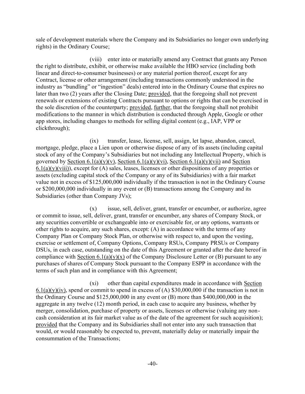-40- sale of development materials where the Company and its Subsidiaries no longer own underlying rights) in the Ordinary Course; (viii) enter into or materially amend any Contract that grants any Person the right to distribute, exhibit, or otherwise make available the HBO service (including both linear and direct-to-consumer businesses) or any material portion thereof, except for any Contract, license or other arrangement (including transactions commonly understood in the industry as “bundling” or “ingestion” deals) entered into in the Ordinary Course that expires no later than two (2) years after the Closing Date; provided, that the foregoing shall not prevent renewals or extensions of existing Contracts pursuant to options or rights that can be exercised in the sole discretion of the counterparty; provided, further, that the foregoing shall not prohibit modifications to the manner in which distribution is conducted through Apple, Google or other app stores, including changes to methods for selling digital content (e.g., IAP, VPP or clickthrough); (ix) transfer, lease, license, sell, assign, let lapse, abandon, cancel, mortgage, pledge, place a Lien upon or otherwise dispose of any of its assets (including capital stock of any of the Company’s Subsidiaries but not including any Intellectual Property, which is governed by Section 6.1(a)(y)(v), Section 6.1(a)(y)(vi), Section 6.1(a)(y)(vii) and Section 6.1(a)(y)(viii)), except for (A) sales, leases, licenses or other dispositions of any properties or assets (excluding capital stock of the Company or any of its Subsidiaries) with a fair market value not in excess of $125,000,000 individually if the transaction is not in the Ordinary Course or $200,000,000 individually in any event or (B) transactions among the Company and its Subsidiaries (other than Company JVs); (x) issue, sell, deliver, grant, transfer or encumber, or authorize, agree or commit to issue, sell, deliver, grant, transfer or encumber, any shares of Company Stock, or any securities convertible or exchangeable into or exercisable for, or any options, warrants or other rights to acquire, any such shares, except: (A) in accordance with the terms of any Company Plan or Company Stock Plan, or otherwise with respect to, and upon the vesting, exercise or settlement of, Company Options, Company RSUs, Company PRSUs or Company DSUs, in each case, outstanding on the date of this Agreement or granted after the date hereof in compliance with Section 6.1(a)(y)(x) of the Company Disclosure Letter or (B) pursuant to any purchases of shares of Company Stock pursuant to the Company ESPP in accordance with the terms of such plan and in compliance with this Agreement; (xi) other than capital expenditures made in accordance with Section 6.1(a)(y)(iv), spend or commit to spend in excess of (A) $30,000,000 if the transaction is not in the Ordinary Course and $125,000,000 in any event or (B) more than $400,000,000 in the aggregate in any twelve (12) month period, in each case to acquire any business, whether by merger, consolidation, purchase of property or assets, licenses or otherwise (valuing any non- cash consideration at its fair market value as of the date of the agreement for such acquisition); provided that the Company and its Subsidiaries shall not enter into any such transaction that would, or would reasonably be expected to, prevent, materially delay or materially impair the consummation of the Transactions;