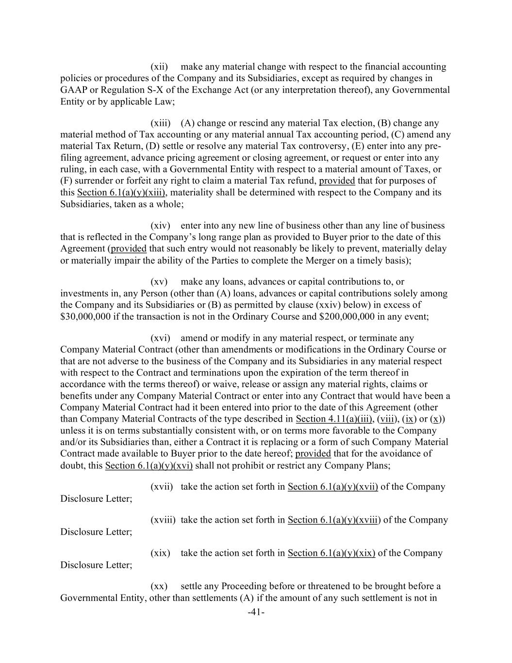 -41- (xii) make any material change with respect to the financial accounting policies or procedures of the Company and its Subsidiaries, except as required by changes in GAAP or Regulation S-X of the Exchange Act (or any interpretation thereof), any Governmental Entity or by applicable Law; (xiii) (A) change or rescind any material Tax election, (B) change any material method of Tax accounting or any material annual Tax accounting period, (C) amend any material Tax Return, (D) settle or resolve any material Tax controversy, (E) enter into any pre- filing agreement, advance pricing agreement or closing agreement, or request or enter into any ruling, in each case, with a Governmental Entity with respect to a material amount of Taxes, or (F) surrender or forfeit any right to claim a material Tax refund, provided that for purposes of this Section 6.1(a)(y)(xiii), materiality shall be determined with respect to the Company and its Subsidiaries, taken as a whole; (xiv) enter into any new line of business other than any line of business that is reflected in the Company’s long range plan as provided to Buyer prior to the date of this Agreement (provided that such entry would not reasonably be likely to prevent, materially delay or materially impair the ability of the Parties to complete the Merger on a timely basis); (xv) make any loans, advances or capital contributions to, or investments in, any Person (other than (A) loans, advances or capital contributions solely among the Company and its Subsidiaries or (B) as permitted by clause (xxiv) below) in excess of $30,000,000 if the transaction is not in the Ordinary Course and $200,000,000 in any event; (xvi) amend or modify in any material respect, or terminate any Company Material Contract (other than amendments or modifications in the Ordinary Course or that are not adverse to the business of the Company and its Subsidiaries in any material respect with respect to the Contract and terminations upon the expiration of the term thereof in accordance with the terms thereof) or waive, release or assign any material rights, claims or benefits under any Company Material Contract or enter into any Contract that would have been a Company Material Contract had it been entered into prior to the date of this Agreement (other than Company Material Contracts of the type described in Section 4.11(a)(iii), (viii), (ix) or (x)) unless it is on terms substantially consistent with, or on terms more favorable to the Company and/or its Subsidiaries than, either a Contract it is replacing or a form of such Company Material Contract made available to Buyer prior to the date hereof; provided that for the avoidance of doubt, this Section 6.1(a)(y)(xvi) shall not prohibit or restrict any Company Plans; (xvii) take the action set forth in Section 6.1(a)(y)(xvii) of the Company Disclosure Letter; (xviii) take the action set forth in Section 6.1(a)(y)(xviii) of the Company Disclosure Letter; (xix) take the action set forth in Section 6.1(a)(y)(xix) of the Company Disclosure Letter; (xx) settle any Proceeding before or threatened to be brought before a Governmental Entity, other than settlements (A) if the amount of any such settlement is not in