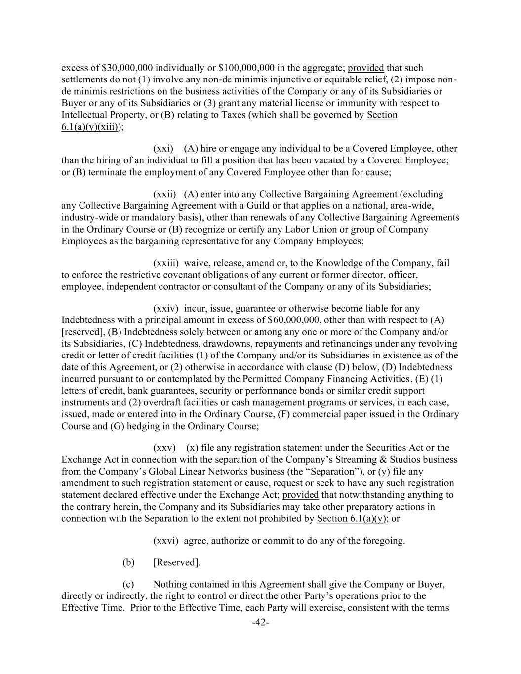 -42- excess of $30,000,000 individually or $100,000,000 in the aggregate; provided that such settlements do not (1) involve any non-de minimis injunctive or equitable relief, (2) impose non- de minimis restrictions on the business activities of the Company or any of its Subsidiaries or Buyer or any of its Subsidiaries or (3) grant any material license or immunity with respect to Intellectual Property, or (B) relating to Taxes (which shall be governed by Section 6.1(a)(y)(xiii)); (xxi) (A) hire or engage any individual to be a Covered Employee, other than the hiring of an individual to fill a position that has been vacated by a Covered Employee; or (B) terminate the employment of any Covered Employee other than for cause; (xxii) (A) enter into any Collective Bargaining Agreement (excluding any Collective Bargaining Agreement with a Guild or that applies on a national, area-wide, industry-wide or mandatory basis), other than renewals of any Collective Bargaining Agreements in the Ordinary Course or (B) recognize or certify any Labor Union or group of Company Employees as the bargaining representative for any Company Employees; (xxiii) waive, release, amend or, to the Knowledge of the Company, fail to enforce the restrictive covenant obligations of any current or former director, officer, employee, independent contractor or consultant of the Company or any of its Subsidiaries; (xxiv) incur, issue, guarantee or otherwise become liable for any Indebtedness with a principal amount in excess of $60,000,000, other than with respect to (A) [reserved], (B) Indebtedness solely between or among any one or more of the Company and/or its Subsidiaries, (C) Indebtedness, drawdowns, repayments and refinancings under any revolving credit or letter of credit facilities (1) of the Company and/or its Subsidiaries in existence as of the date of this Agreement, or (2) otherwise in accordance with clause (D) below, (D) Indebtedness incurred pursuant to or contemplated by the Permitted Company Financing Activities, (E) (1) letters of credit, bank guarantees, security or performance bonds or similar credit support instruments and (2) overdraft facilities or cash management programs or services, in each case, issued, made or entered into in the Ordinary Course, (F) commercial paper issued in the Ordinary Course and (G) hedging in the Ordinary Course; (xxv) (x) file any registration statement under the Securities Act or the Exchange Act in connection with the separation of the Company’s Streaming & Studios business from the Company’s Global Linear Networks business (the “Separation”), or (y) file any amendment to such registration statement or cause, request or seek to have any such registration statement declared effective under the Exchange Act; provided that notwithstanding anything to the contrary herein, the Company and its Subsidiaries may take other preparatory actions in connection with the Separation to the extent not prohibited by Section 6.1(a)(y); or (xxvi) agree, authorize or commit to do any of the foregoing. (b) [Reserved]. (c) Nothing contained in this Agreement shall give the Company or Buyer, directly or indirectly, the right to control or direct the other Party’s operations prior to the Effective Time. Prior to the Effective Time, each Party will exercise, consistent with the terms