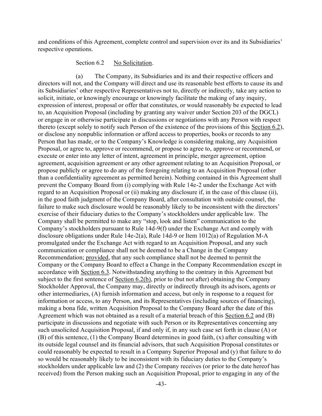 -43- and conditions of this Agreement, complete control and supervision over its and its Subsidiaries’ respective operations. Section 6.2 No Solicitation. (a) The Company, its Subsidiaries and its and their respective officers and directors will not, and the Company will direct and use its reasonable best efforts to cause its and its Subsidiaries’ other respective Representatives not to, directly or indirectly, take any action to solicit, initiate, or knowingly encourage or knowingly facilitate the making of any inquiry, expression of interest, proposal or offer that constitutes, or would reasonably be expected to lead to, an Acquisition Proposal (including by granting any waiver under Section 203 of the DGCL) or engage in or otherwise participate in discussions or negotiations with any Person with respect thereto (except solely to notify such Person of the existence of the provisions of this Section 6.2), or disclose any nonpublic information or afford access to properties, books or records to any Person that has made, or to the Company’s Knowledge is considering making, any Acquisition Proposal, or agree to, approve or recommend, or propose to agree to, approve or recommend, or execute or enter into any letter of intent, agreement in principle, merger agreement, option agreement, acquisition agreement or any other agreement relating to an Acquisition Proposal, or propose publicly or agree to do any of the foregoing relating to an Acquisition Proposal (other than a confidentiality agreement as permitted herein). Nothing contained in this Agreement shall prevent the Company Board from (i) complying with Rule 14e-2 under the Exchange Act with regard to an Acquisition Proposal or (ii) making any disclosure if, in the case of this clause (ii), in the good faith judgment of the Company Board, after consultation with outside counsel, the failure to make such disclosure would be reasonably likely to be inconsistent with the directors’ exercise of their fiduciary duties to the Company’s stockholders under applicable law. The Company shall be permitted to make any “stop, look and listen” communication to the Company’s stockholders pursuant to Rule 14d-9(f) under the Exchange Act and comply with disclosure obligations under Rule 14e-2(a), Rule 14d-9 or Item 1012(a) of Regulation M-A promulgated under the Exchange Act with regard to an Acquisition Proposal, and any such communication or compliance shall not be deemed to be a Change in the Company Recommendation; provided, that any such compliance shall not be deemed to permit the Company or the Company Board to effect a Change in the Company Recommendation except in accordance with Section 6.3. Notwithstanding anything to the contrary in this Agreement but subject to the first sentence of Section 6.2(b), prior to (but not after) obtaining the Company Stockholder Approval, the Company may, directly or indirectly through its advisors, agents or other intermediaries, (A) furnish information and access, but only in response to a request for information or access, to any Person, and its Representatives (including sources of financing), making a bona fide, written Acquisition Proposal to the Company Board after the date of this Agreement which was not obtained as a result of a material breach of this Section 6.2 and (B) participate in discussions and negotiate with such Person or its Representatives concerning any such unsolicited Acquisition Proposal, if and only if, in any such case set forth in clause (A) or (B) of this sentence, (1) the Company Board determines in good faith, (x) after consulting with its outside legal counsel and its financial advisors, that such Acquisition Proposal constitutes or could reasonably be expected to result in a Company Superior Proposal and (y) that failure to do so would be reasonably likely to be inconsistent with its fiduciary duties to the Company’s stockholders under applicable law and (2) the Company receives (or prior to the date hereof has received) from the Person making such an Acquisition Proposal, prior to engaging in any of the