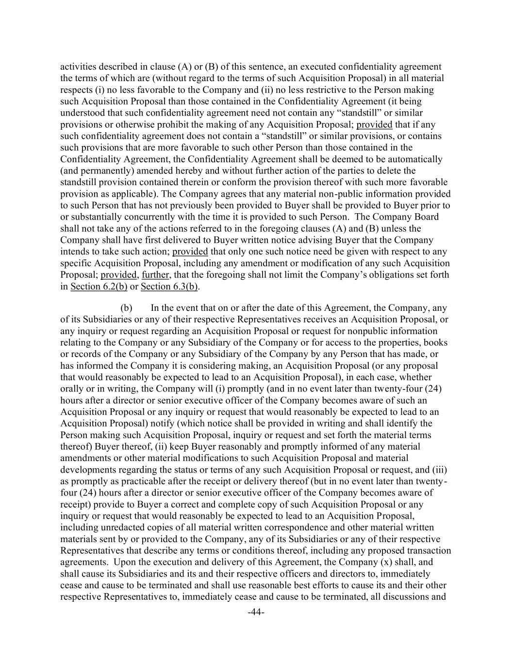 -44- activities described in clause (A) or (B) of this sentence, an executed confidentiality agreement the terms of which are (without regard to the terms of such Acquisition Proposal) in all material respects (i) no less favorable to the Company and (ii) no less restrictive to the Person making such Acquisition Proposal than those contained in the Confidentiality Agreement (it being understood that such confidentiality agreement need not contain any “standstill” or similar provisions or otherwise prohibit the making of any Acquisition Proposal; provided that if any such confidentiality agreement does not contain a “standstill” or similar provisions, or contains such provisions that are more favorable to such other Person than those contained in the Confidentiality Agreement, the Confidentiality Agreement shall be deemed to be automatically (and permanently) amended hereby and without further action of the parties to delete the standstill provision contained therein or conform the provision thereof with such more favorable provision as applicable). The Company agrees that any material non-public information provided to such Person that has not previously been provided to Buyer shall be provided to Buyer prior to or substantially concurrently with the time it is provided to such Person. The Company Board shall not take any of the actions referred to in the foregoing clauses (A) and (B) unless the Company shall have first delivered to Buyer written notice advising Buyer that the Company intends to take such action; provided that only one such notice need be given with respect to any specific Acquisition Proposal, including any amendment or modification of any such Acquisition Proposal; provided, further, that the foregoing shall not limit the Company’s obligations set forth in Section 6.2(b) or Section 6.3(b). (b) In the event that on or after the date of this Agreement, the Company, any of its Subsidiaries or any of their respective Representatives receives an Acquisition Proposal, or any inquiry or request regarding an Acquisition Proposal or request for nonpublic information relating to the Company or any Subsidiary of the Company or for access to the properties, books or records of the Company or any Subsidiary of the Company by any Person that has made, or has informed the Company it is considering making, an Acquisition Proposal (or any proposal that would reasonably be expected to lead to an Acquisition Proposal), in each case, whether orally or in writing, the Company will (i) promptly (and in no event later than twenty-four (24) hours after a director or senior executive officer of the Company becomes aware of such an Acquisition Proposal or any inquiry or request that would reasonably be expected to lead to an Acquisition Proposal) notify (which notice shall be provided in writing and shall identify the Person making such Acquisition Proposal, inquiry or request and set forth the material terms thereof) Buyer thereof, (ii) keep Buyer reasonably and promptly informed of any material amendments or other material modifications to such Acquisition Proposal and material developments regarding the status or terms of any such Acquisition Proposal or request, and (iii) as promptly as practicable after the receipt or delivery thereof (but in no event later than twenty- four (24) hours after a director or senior executive officer of the Company becomes aware of receipt) provide to Buyer a correct and complete copy of such Acquisition Proposal or any inquiry or request that would reasonably be expected to lead to an Acquisition Proposal, including unredacted copies of all material written correspondence and other material written materials sent by or provided to the Company, any of its Subsidiaries or any of their respective Representatives that describe any terms or conditions thereof, including any proposed transaction agreements. Upon the execution and delivery of this Agreement, the Company (x) shall, and shall cause its Subsidiaries and its and their respective officers and directors to, immediately cease and cause to be terminated and shall use reasonable best efforts to cause its and their other respective Representatives to, immediately cease and cause to be terminated, all discussions and