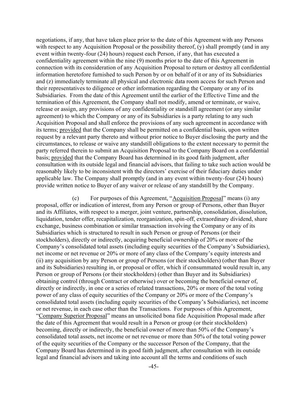 -45- negotiations, if any, that have taken place prior to the date of this Agreement with any Persons with respect to any Acquisition Proposal or the possibility thereof, (y) shall promptly (and in any event within twenty-four (24) hours) request each Person, if any, that has executed a confidentiality agreement within the nine (9) months prior to the date of this Agreement in connection with its consideration of any Acquisition Proposal to return or destroy all confidential information heretofore furnished to such Person by or on behalf of it or any of its Subsidiaries and (z) immediately terminate all physical and electronic data room access for such Person and their representatives to diligence or other information regarding the Company or any of its Subsidiaries. From the date of this Agreement until the earlier of the Effective Time and the termination of this Agreement, the Company shall not modify, amend or terminate, or waive, release or assign, any provisions of any confidentiality or standstill agreement (or any similar agreement) to which the Company or any of its Subsidiaries is a party relating to any such Acquisition Proposal and shall enforce the provisions of any such agreement in accordance with its terms; provided that the Company shall be permitted on a confidential basis, upon written request by a relevant party thereto and without prior notice to Buyer disclosing the party and the circumstances, to release or waive any standstill obligations to the extent necessary to permit the party referred therein to submit an Acquisition Proposal to the Company Board on a confidential basis; provided that the Company Board has determined in its good faith judgment, after consultation with its outside legal and financial advisors, that failing to take such action would be reasonably likely to be inconsistent with the directors’ exercise of their fiduciary duties under applicable law. The Company shall promptly (and in any event within twenty-four (24) hours) provide written notice to Buyer of any waiver or release of any standstill by the Company. (c) For purposes of this Agreement, “Acquisition Proposal” means (i) any proposal, offer or indication of interest, from any Person or group of Persons, other than Buyer and its Affiliates, with respect to a merger, joint venture, partnership, consolidation, dissolution, liquidation, tender offer, recapitalization, reorganization, spin-off, extraordinary dividend, share exchange, business combination or similar transaction involving the Company or any of its Subsidiaries which is structured to result in such Person or group of Persons (or their stockholders), directly or indirectly, acquiring beneficial ownership of 20% or more of the Company’s consolidated total assets (including equity securities of the Company’s Subsidiaries), net income or net revenue or 20% or more of any class of the Company’s equity interests and (ii) any acquisition by any Person or group of Persons (or their stockholders) (other than Buyer and its Subsidiaries) resulting in, or proposal or offer, which if consummated would result in, any Person or group of Persons (or their stockholders) (other than Buyer and its Subsidiaries) obtaining control (through Contract or otherwise) over or becoming the beneficial owner of, directly or indirectly, in one or a series of related transactions, 20% or more of the total voting power of any class of equity securities of the Company or 20% or more of the Company’s consolidated total assets (including equity securities of the Company’s Subsidiaries), net income or net revenue, in each case other than the Transactions. For purposes of this Agreement, “Company Superior Proposal” means an unsolicited bona fide Acquisition Proposal made after the date of this Agreement that would result in a Person or group (or their stockholders) becoming, directly or indirectly, the beneficial owner of more than 50% of the Company’s consolidated total assets, net income or net revenue or more than 50% of the total voting power of the equity securities of the Company or the successor Person of the Company, that the Company Board has determined in its good faith judgment, after consultation with its outside legal and financial advisors and taking into account all the terms and conditions of such