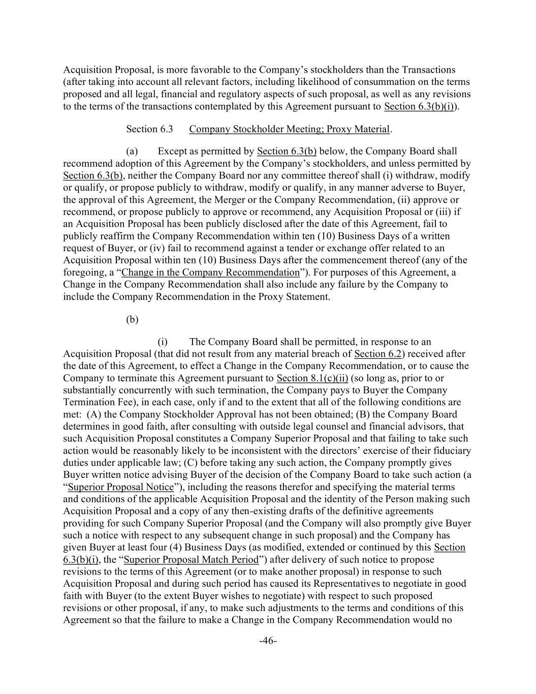 -46- Acquisition Proposal, is more favorable to the Company’s stockholders than the Transactions (after taking into account all relevant factors, including likelihood of consummation on the terms proposed and all legal, financial and regulatory aspects of such proposal, as well as any revisions to the terms of the transactions contemplated by this Agreement pursuant to Section 6.3(b)(i)). Section 6.3 Company Stockholder Meeting; Proxy Material. (a) Except as permitted by Section 6.3(b) below, the Company Board shall recommend adoption of this Agreement by the Company’s stockholders, and unless permitted by Section 6.3(b), neither the Company Board nor any committee thereof shall (i) withdraw, modify or qualify, or propose publicly to withdraw, modify or qualify, in any manner adverse to Buyer, the approval of this Agreement, the Merger or the Company Recommendation, (ii) approve or recommend, or propose publicly to approve or recommend, any Acquisition Proposal or (iii) if an Acquisition Proposal has been publicly disclosed after the date of this Agreement, fail to publicly reaffirm the Company Recommendation within ten (10) Business Days of a written request of Buyer, or (iv) fail to recommend against a tender or exchange offer related to an Acquisition Proposal within ten (10) Business Days after the commencement thereof (any of the foregoing, a “Change in the Company Recommendation”). For purposes of this Agreement, a Change in the Company Recommendation shall also include any failure by the Company to include the Company Recommendation in the Proxy Statement. (b) (i) The Company Board shall be permitted, in response to an Acquisition Proposal (that did not result from any material breach of Section 6.2) received after the date of this Agreement, to effect a Change in the Company Recommendation, or to cause the Company to terminate this Agreement pursuant to Section 8.1(c)(ii) (so long as, prior to or substantially concurrently with such termination, the Company pays to Buyer the Company Termination Fee), in each case, only if and to the extent that all of the following conditions are met: (A) the Company Stockholder Approval has not been obtained; (B) the Company Board determines in good faith, after consulting with outside legal counsel and financial advisors, that such Acquisition Proposal constitutes a Company Superior Proposal and that failing to take such action would be reasonably likely to be inconsistent with the directors’ exercise of their fiduciary duties under applicable law; (C) before taking any such action, the Company promptly gives Buyer written notice advising Buyer of the decision of the Company Board to take such action (a “Superior Proposal Notice”), including the reasons therefor and specifying the material terms and conditions of the applicable Acquisition Proposal and the identity of the Person making such Acquisition Proposal and a copy of any then-existing drafts of the definitive agreements providing for such Company Superior Proposal (and the Company will also promptly give Buyer such a notice with respect to any subsequent change in such proposal) and the Company has given Buyer at least four (4) Business Days (as modified, extended or continued by this Section 6.3(b)(i), the “Superior Proposal Match Period”) after delivery of such notice to propose revisions to the terms of this Agreement (or to make another proposal) in response to such Acquisition Proposal and during such period has caused its Representatives to negotiate in good faith with Buyer (to the extent Buyer wishes to negotiate) with respect to such proposed revisions or other proposal, if any, to make such adjustments to the terms and conditions of this Agreement so that the failure to make a Change in the Company Recommendation would no