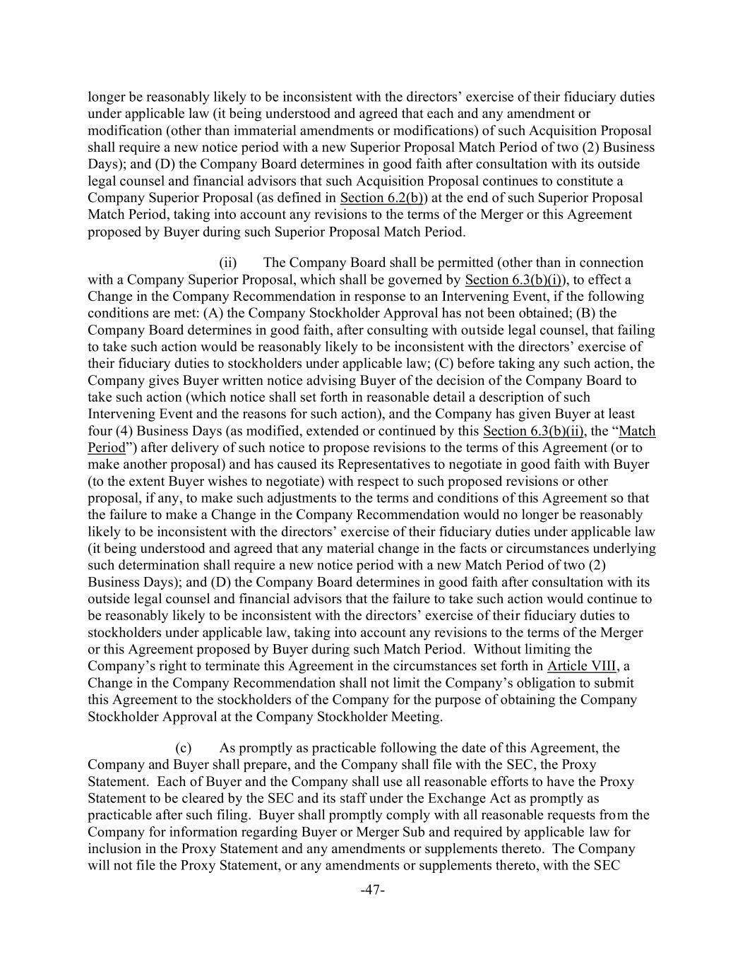 -47- longer be reasonably likely to be inconsistent with the directors’ exercise of their fiduciary duties under applicable law (it being understood and agreed that each and any amendment or modification (other than immaterial amendments or modifications) of such Acquisition Proposal shall require a new notice period with a new Superior Proposal Match Period of two (2) Business Days); and (D) the Company Board determines in good faith after consultation with its outside legal counsel and financial advisors that such Acquisition Proposal continues to constitute a Company Superior Proposal (as defined in Section 6.2(b)) at the end of such Superior Proposal Match Period, taking into account any revisions to the terms of the Merger or this Agreement proposed by Buyer during such Superior Proposal Match Period. (ii) The Company Board shall be permitted (other than in connection with a Company Superior Proposal, which shall be governed by Section 6.3(b)(i)), to effect a Change in the Company Recommendation in response to an Intervening Event, if the following conditions are met: (A) the Company Stockholder Approval has not been obtained; (B) the Company Board determines in good faith, after consulting with outside legal counsel, that failing to take such action would be reasonably likely to be inconsistent with the directors’ exercise of their fiduciary duties to stockholders under applicable law; (C) before taking any such action, the Company gives Buyer written notice advising Buyer of the decision of the Company Board to take such action (which notice shall set forth in reasonable detail a description of such Intervening Event and the reasons for such action), and the Company has given Buyer at least four (4) Business Days (as modified, extended or continued by this Section 6.3(b)(ii), the “Match Period”) after delivery of such notice to propose revisions to the terms of this Agreement (or to make another proposal) and has caused its Representatives to negotiate in good faith with Buyer (to the extent Buyer wishes to negotiate) with respect to such proposed revisions or other proposal, if any, to make such adjustments to the terms and conditions of this Agreement so that the failure to make a Change in the Company Recommendation would no longer be reasonably likely to be inconsistent with the directors’ exercise of their fiduciary duties under applicable law (it being understood and agreed that any material change in the facts or circumstances underlying such determination shall require a new notice period with a new Match Period of two (2) Business Days); and (D) the Company Board determines in good faith after consultation with its outside legal counsel and financial advisors that the failure to take such action would continue to be reasonably likely to be inconsistent with the directors’ exercise of their fiduciary duties to stockholders under applicable law, taking into account any revisions to the terms of the Merger or this Agreement proposed by Buyer during such Match Period. Without limiting the Company’s right to terminate this Agreement in the circumstances set forth in Article VIII, a Change in the Company Recommendation shall not limit the Company’s obligation to submit this Agreement to the stockholders of the Company for the purpose of obtaining the Company Stockholder Approval at the Company Stockholder Meeting. (c) As promptly as practicable following the date of this Agreement, the Company and Buyer shall prepare, and the Company shall file with the SEC, the Proxy Statement. Each of Buyer and the Company shall use all reasonable efforts to have the Proxy Statement to be cleared by the SEC and its staff under the Exchange Act as promptly as practicable after such filing. Buyer shall promptly comply with all reasonable requests from the Company for information regarding Buyer or Merger Sub and required by applicable law for inclusion in the Proxy Statement and any amendments or supplements thereto. The Company will not file the Proxy Statement, or any amendments or supplements thereto, with the SEC