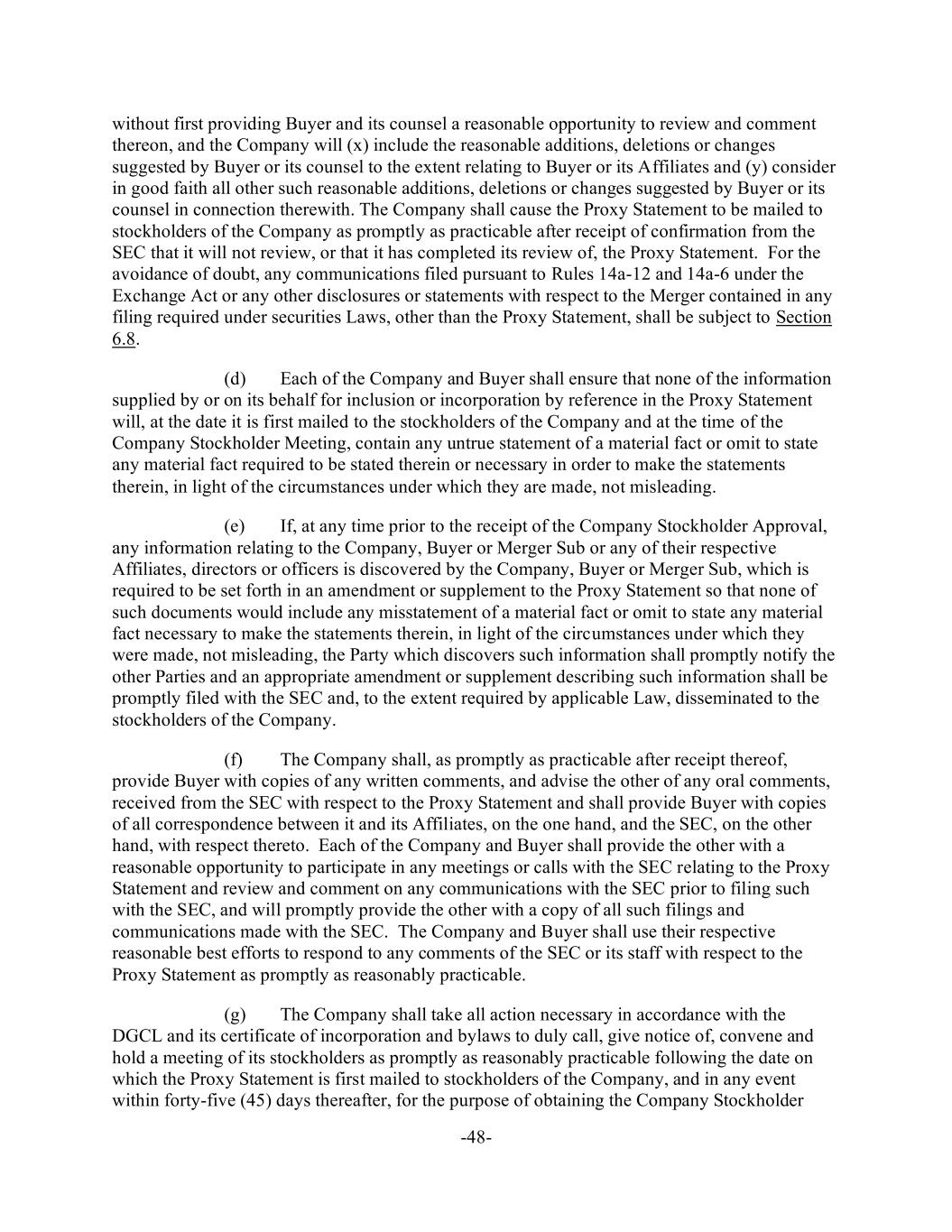 -48- without first providing Buyer and its counsel a reasonable opportunity to review and comment thereon, and the Company will (x) include the reasonable additions, deletions or changes suggested by Buyer or its counsel to the extent relating to Buyer or its Affiliates and (y) consider in good faith all other such reasonable additions, deletions or changes suggested by Buyer or its counsel in connection therewith. The Company shall cause the Proxy Statement to be mailed to stockholders of the Company as promptly as practicable after receipt of confirmation from the SEC that it will not review, or that it has completed its review of, the Proxy Statement. For the avoidance of doubt, any communications filed pursuant to Rules 14a-12 and 14a-6 under the Exchange Act or any other disclosures or statements with respect to the Merger contained in any filing required under securities Laws, other than the Proxy Statement, shall be subject to Section 6.8. (d) Each of the Company and Buyer shall ensure that none of the information supplied by or on its behalf for inclusion or incorporation by reference in the Proxy Statement will, at the date it is first mailed to the stockholders of the Company and at the time of the Company Stockholder Meeting, contain any untrue statement of a material fact or omit to state any material fact required to be stated therein or necessary in order to make the statements therein, in light of the circumstances under which they are made, not misleading. (e) If, at any time prior to the receipt of the Company Stockholder Approval, any information relating to the Company, Buyer or Merger Sub or any of their respective Affiliates, directors or officers is discovered by the Company, Buyer or Merger Sub, which is required to be set forth in an amendment or supplement to the Proxy Statement so that none of such documents would include any misstatement of a material fact or omit to state any material fact necessary to make the statements therein, in light of the circumstances under which they were made, not misleading, the Party which discovers such information shall promptly notify the other Parties and an appropriate amendment or supplement describing such information shall be promptly filed with the SEC and, to the extent required by applicable Law, disseminated to the stockholders of the Company. (f) The Company shall, as promptly as practicable after receipt thereof, provide Buyer with copies of any written comments, and advise the other of any oral comments, received from the SEC with respect to the Proxy Statement and shall provide Buyer with copies of all correspondence between it and its Affiliates, on the one hand, and the SEC, on the other hand, with respect thereto. Each of the Company and Buyer shall provide the other with a reasonable opportunity to participate in any meetings or calls with the SEC relating to the Proxy Statement and review and comment on any communications with the SEC prior to filing such with the SEC, and will promptly provide the other with a copy of all such filings and communications made with the SEC. The Company and Buyer shall use their respective reasonable best efforts to respond to any comments of the SEC or its staff with respect to the Proxy Statement as promptly as reasonably practicable. (g) The Company shall take all action necessary in accordance with the DGCL and its certificate of incorporation and bylaws to duly call, give notice of, convene and hold a meeting of its stockholders as promptly as reasonably practicable following the date on which the Proxy Statement is first mailed to stockholders of the Company, and in any event within forty-five (45) days thereafter, for the purpose of obtaining the Company Stockholder