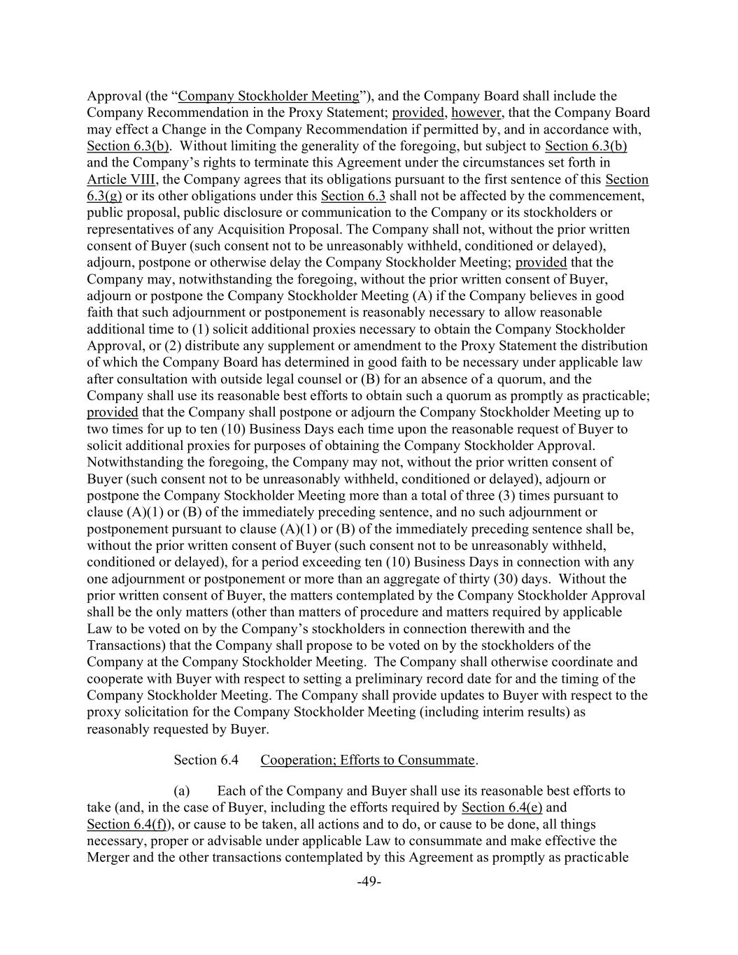 -49- Approval (the “Company Stockholder Meeting”), and the Company Board shall include the Company Recommendation in the Proxy Statement; provided, however, that the Company Board may effect a Change in the Company Recommendation if permitted by, and in accordance with, Section 6.3(b). Without limiting the generality of the foregoing, but subject to Section 6.3(b) and the Company’s rights to terminate this Agreement under the circumstances set forth in Article VIII, the Company agrees that its obligations pursuant to the first sentence of this Section 6.3(g) or its other obligations under this Section 6.3 shall not be affected by the commencement, public proposal, public disclosure or communication to the Company or its stockholders or representatives of any Acquisition Proposal. The Company shall not, without the prior written consent of Buyer (such consent not to be unreasonably withheld, conditioned or delayed), adjourn, postpone or otherwise delay the Company Stockholder Meeting; provided that the Company may, notwithstanding the foregoing, without the prior written consent of Buyer, adjourn or postpone the Company Stockholder Meeting (A) if the Company believes in good faith that such adjournment or postponement is reasonably necessary to allow reasonable additional time to (1) solicit additional proxies necessary to obtain the Company Stockholder Approval, or (2) distribute any supplement or amendment to the Proxy Statement the distribution of which the Company Board has determined in good faith to be necessary under applicable law after consultation with outside legal counsel or (B) for an absence of a quorum, and the Company shall use its reasonable best efforts to obtain such a quorum as promptly as practicable; provided that the Company shall postpone or adjourn the Company Stockholder Meeting up to two times for up to ten (10) Business Days each time upon the reasonable request of Buyer to solicit additional proxies for purposes of obtaining the Company Stockholder Approval. Notwithstanding the foregoing, the Company may not, without the prior written consent of Buyer (such consent not to be unreasonably withheld, conditioned or delayed), adjourn or postpone the Company Stockholder Meeting more than a total of three (3) times pursuant to clause (A)(1) or (B) of the immediately preceding sentence, and no such adjournment or postponement pursuant to clause (A)(1) or (B) of the immediately preceding sentence shall be, without the prior written consent of Buyer (such consent not to be unreasonably withheld, conditioned or delayed), for a period exceeding ten (10) Business Days in connection with any one adjournment or postponement or more than an aggregate of thirty (30) days. Without the prior written consent of Buyer, the matters contemplated by the Company Stockholder Approval shall be the only matters (other than matters of procedure and matters required by applicable Law to be voted on by the Company’s stockholders in connection therewith and the Transactions) that the Company shall propose to be voted on by the stockholders of the Company at the Company Stockholder Meeting. The Company shall otherwise coordinate and cooperate with Buyer with respect to setting a preliminary record date for and the timing of the Company Stockholder Meeting. The Company shall provide updates to Buyer with respect to the proxy solicitation for the Company Stockholder Meeting (including interim results) as reasonably requested by Buyer. Section 6.4 Cooperation; Efforts to Consummate. (a) Each of the Company and Buyer shall use its reasonable best efforts to take (and, in the case of Buyer, including the efforts required by Section 6.4(e) and Section 6.4(f)), or cause to be taken, all actions and to do, or cause to be done, all things necessary, proper or advisable under applicable Law to consummate and make effective the Merger and the other transactions contemplated by this Agreement as promptly as practicable