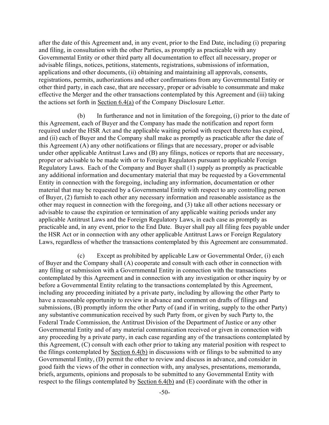 -50- after the date of this Agreement and, in any event, prior to the End Date, including (i) preparing and filing, in consultation with the other Parties, as promptly as practicable with any Governmental Entity or other third party all documentation to effect all necessary, proper or advisable filings, notices, petitions, statements, registrations, submissions of information, applications and other documents, (ii) obtaining and maintaining all approvals, consents, registrations, permits, authorizations and other confirmations from any Governmental Entity or other third party, in each case, that are necessary, proper or advisable to consummate and make effective the Merger and the other transactions contemplated by this Agreement and (iii) taking the actions set forth in Section 6.4(a) of the Company Disclosure Letter. (b) In furtherance and not in limitation of the foregoing, (i) prior to the date of this Agreement, each of Buyer and the Company has made the notification and report form required under the HSR Act and the applicable waiting period with respect thereto has expired, and (ii) each of Buyer and the Company shall make as promptly as practicable after the date of this Agreement (A) any other notifications or filings that are necessary, proper or advisable under other applicable Antitrust Laws and (B) any filings, notices or reports that are necessary, proper or advisable to be made with or to Foreign Regulators pursuant to applicable Foreign Regulatory Laws. Each of the Company and Buyer shall (1) supply as promptly as practicable any additional information and documentary material that may be requested by a Governmental Entity in connection with the foregoing, including any information, documentation or other material that may be requested by a Governmental Entity with respect to any controlling person of Buyer, (2) furnish to each other any necessary information and reasonable assistance as the other may request in connection with the foregoing, and (3) take all other actions necessary or advisable to cause the expiration or termination of any applicable waiting periods under any applicable Antitrust Laws and the Foreign Regulatory Laws, in each case as promptly as practicable and, in any event, prior to the End Date. Buyer shall pay all filing fees payable under the HSR Act or in connection with any other applicable Antitrust Laws or Foreign Regulatory Laws, regardless of whether the transactions contemplated by this Agreement are consummated. (c) Except as prohibited by applicable Law or Governmental Order, (i) each of Buyer and the Company shall (A) cooperate and consult with each other in connection with any filing or submission with a Governmental Entity in connection with the transactions contemplated by this Agreement and in connection with any investigation or other inquiry by or before a Governmental Entity relating to the transactions contemplated by this Agreement, including any proceeding initiated by a private party, including by allowing the other Party to have a reasonable opportunity to review in advance and comment on drafts of filings and submissions, (B) promptly inform the other Party of (and if in writing, supply to the other Party) any substantive communication received by such Party from, or given by such Party to, the Federal Trade Commission, the Antitrust Division of the Department of Justice or any other Governmental Entity and of any material communication received or given in connection with any proceeding by a private party, in each case regarding any of the transactions contemplated by this Agreement, (C) consult with each other prior to taking any material position with respect to the filings contemplated by Section 6.4(b) in discussions with or filings to be submitted to any Governmental Entity, (D) permit the other to review and discuss in advance, and consider in good faith the views of the other in connection with, any analyses, presentations, memoranda, briefs, arguments, opinions and proposals to be submitted to any Governmental Entity with respect to the filings contemplated by Section 6.4(b) and (E) coordinate with the other in