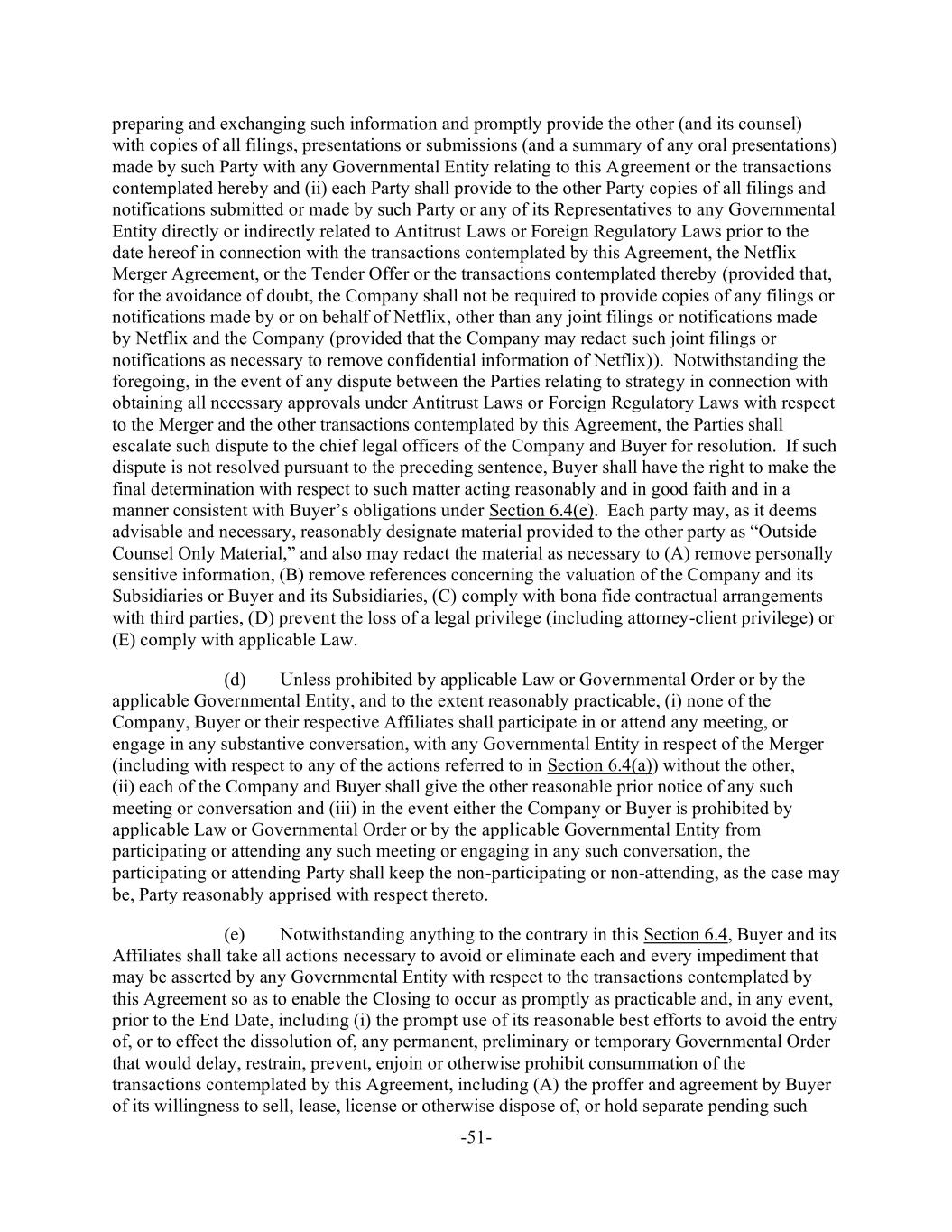 -51- preparing and exchanging such information and promptly provide the other (and its counsel) with copies of all filings, presentations or submissions (and a summary of any oral presentations) made by such Party with any Governmental Entity relating to this Agreement or the transactions contemplated hereby and (ii) each Party shall provide to the other Party copies of all filings and notifications submitted or made by such Party or any of its Representatives to any Governmental Entity directly or indirectly related to Antitrust Laws or Foreign Regulatory Laws prior to the date hereof in connection with the transactions contemplated by this Agreement, the Netflix Merger Agreement, or the Tender Offer or the transactions contemplated thereby (provided that, for the avoidance of doubt, the Company shall not be required to provide copies of any filings or notifications made by or on behalf of Netflix, other than any joint filings or notifications made by Netflix and the Company (provided that the Company may redact such joint filings or notifications as necessary to remove confidential information of Netflix)). Notwithstanding the foregoing, in the event of any dispute between the Parties relating to strategy in connection with obtaining all necessary approvals under Antitrust Laws or Foreign Regulatory Laws with respect to the Merger and the other transactions contemplated by this Agreement, the Parties shall escalate such dispute to the chief legal officers of the Company and Buyer for resolution. If such dispute is not resolved pursuant to the preceding sentence, Buyer shall have the right to make the final determination with respect to such matter acting reasonably and in good faith and in a manner consistent with Buyer’s obligations under Section 6.4(e). Each party may, as it deems advisable and necessary, reasonably designate material provided to the other party as “Outside Counsel Only Material,” and also may redact the material as necessary to (A) remove personally sensitive information, (B) remove references concerning the valuation of the Company and its Subsidiaries or Buyer and its Subsidiaries, (C) comply with bona fide contractual arrangements with third parties, (D) prevent the loss of a legal privilege (including attorney-client privilege) or (E) comply with applicable Law. (d) Unless prohibited by applicable Law or Governmental Order or by the applicable Governmental Entity, and to the extent reasonably practicable, (i) none of the Company, Buyer or their respective Affiliates shall participate in or attend any meeting, or engage in any substantive conversation, with any Governmental Entity in respect of the Merger (including with respect to any of the actions referred to in Section 6.4(a)) without the other, (ii) each of the Company and Buyer shall give the other reasonable prior notice of any such meeting or conversation and (iii) in the event either the Company or Buyer is prohibited by applicable Law or Governmental Order or by the applicable Governmental Entity from participating or attending any such meeting or engaging in any such conversation, the participating or attending Party shall keep the non-participating or non-attending, as the case may be, Party reasonably apprised with respect thereto. (e) Notwithstanding anything to the contrary in this Section 6.4, Buyer and its Affiliates shall take all actions necessary to avoid or eliminate each and every impediment that may be asserted by any Governmental Entity with respect to the transactions contemplated by this Agreement so as to enable the Closing to occur as promptly as practicable and, in any event, prior to the End Date, including (i) the prompt use of its reasonable best efforts to avoid the entry of, or to effect the dissolution of, any permanent, preliminary or temporary Governmental Order that would delay, restrain, prevent, enjoin or otherwise prohibit consummation of the transactions contemplated by this Agreement, including (A) the proffer and agreement by Buyer of its willingness to sell, lease, license or otherwise dispose of, or hold separate pending such