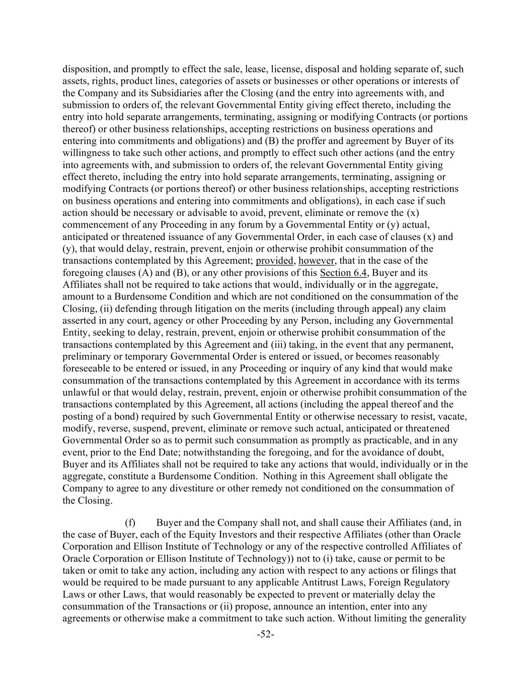 -52- disposition, and promptly to effect the sale, lease, license, disposal and holding separate of, such assets, rights, product lines, categories of assets or businesses or other operations or interests of the Company and its Subsidiaries after the Closing (and the entry into agreements with, and submission to orders of, the relevant Governmental Entity giving effect thereto, including the entry into hold separate arrangements, terminating, assigning or modifying Contracts (or portions thereof) or other business relationships, accepting restrictions on business operations and entering into commitments and obligations) and (B) the proffer and agreement by Buyer of its willingness to take such other actions, and promptly to effect such other actions (and the entry into agreements with, and submission to orders of, the relevant Governmental Entity giving effect thereto, including the entry into hold separate arrangements, terminating, assigning or modifying Contracts (or portions thereof) or other business relationships, accepting restrictions on business operations and entering into commitments and obligations), in each case if such action should be necessary or advisable to avoid, prevent, eliminate or remove the (x) commencement of any Proceeding in any forum by a Governmental Entity or (y) actual, anticipated or threatened issuance of any Governmental Order, in each case of clauses (x) and (y), that would delay, restrain, prevent, enjoin or otherwise prohibit consummation of the transactions contemplated by this Agreement; provided, however, that in the case of the foregoing clauses (A) and (B), or any other provisions of this Section 6.4, Buyer and its Affiliates shall not be required to take actions that would, individually or in the aggregate, amount to a Burdensome Condition and which are not conditioned on the consummation of the Closing, (ii) defending through litigation on the merits (including through appeal) any claim asserted in any court, agency or other Proceeding by any Person, including any Governmental Entity, seeking to delay, restrain, prevent, enjoin or otherwise prohibit consummation of the transactions contemplated by this Agreement and (iii) taking, in the event that any permanent, preliminary or temporary Governmental Order is entered or issued, or becomes reasonably foreseeable to be entered or issued, in any Proceeding or inquiry of any kind that would make consummation of the transactions contemplated by this Agreement in accordance with its terms unlawful or that would delay, restrain, prevent, enjoin or otherwise prohibit consummation of the transactions contemplated by this Agreement, all actions (including the appeal thereof and the posting of a bond) required by such Governmental Entity or otherwise necessary to resist, vacate, modify, reverse, suspend, prevent, eliminate or remove such actual, anticipated or threatened Governmental Order so as to permit such consummation as promptly as practicable, and in any event, prior to the End Date; notwithstanding the foregoing, and for the avoidance of doubt, Buyer and its Affiliates shall not be required to take any actions that would, individually or in the aggregate, constitute a Burdensome Condition. Nothing in this Agreement shall obligate the Company to agree to any divestiture or other remedy not conditioned on the consummation of the Closing. (f) Buyer and the Company shall not, and shall cause their Affiliates (and, in the case of Buyer, each of the Equity Investors and their respective Affiliates (other than Oracle Corporation and Ellison Institute of Technology or any of the respective controlled Affiliates of Oracle Corporation or Ellison Institute of Technology)) not to (i) take, cause or permit to be taken or omit to take any action, including any action with respect to any actions or filings that would be required to be made pursuant to any applicable Antitrust Laws, Foreign Regulatory Laws or other Laws, that would reasonably be expected to prevent or materially delay the consummation of the Transactions or (ii) propose, announce an intention, enter into any agreements or otherwise make a commitment to take such action. Without limiting the generality
