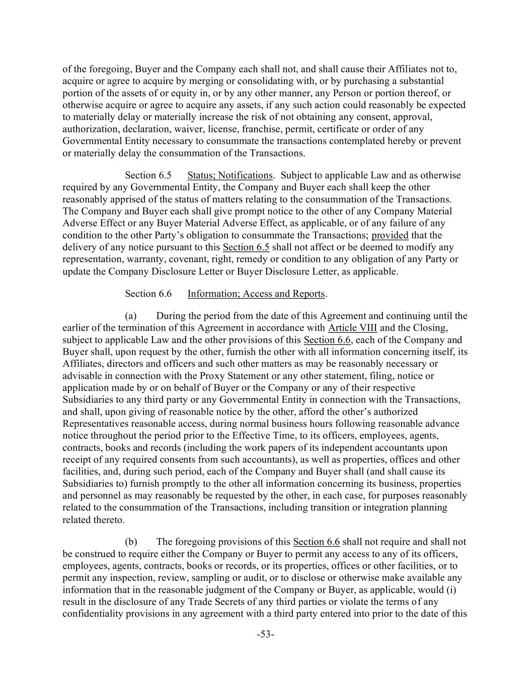 -53- of the foregoing, Buyer and the Company each shall not, and shall cause their Affiliates not to, acquire or agree to acquire by merging or consolidating with, or by purchasing a substantial portion of the assets of or equity in, or by any other manner, any Person or portion thereof, or otherwise acquire or agree to acquire any assets, if any such action could reasonably be expected to materially delay or materially increase the risk of not obtaining any consent, approval, authorization, declaration, waiver, license, franchise, permit, certificate or order of any Governmental Entity necessary to consummate the transactions contemplated hereby or prevent or materially delay the consummation of the Transactions. Section 6.5 Status; Notifications. Subject to applicable Law and as otherwise required by any Governmental Entity, the Company and Buyer each shall keep the other reasonably apprised of the status of matters relating to the consummation of the Transactions. The Company and Buyer each shall give prompt notice to the other of any Company Material Adverse Effect or any Buyer Material Adverse Effect, as applicable, or of any failure of any condition to the other Party’s obligation to consummate the Transactions; provided that the delivery of any notice pursuant to this Section 6.5 shall not affect or be deemed to modify any representation, warranty, covenant, right, remedy or condition to any obligation of any Party or update the Company Disclosure Letter or Buyer Disclosure Letter, as applicable. Section 6.6 Information; Access and Reports. (a) During the period from the date of this Agreement and continuing until the earlier of the termination of this Agreement in accordance with Article VIII and the Closing, subject to applicable Law and the other provisions of this Section 6.6, each of the Company and Buyer shall, upon request by the other, furnish the other with all information concerning itself, its Affiliates, directors and officers and such other matters as may be reasonably necessary or advisable in connection with the Proxy Statement or any other statement, filing, notice or application made by or on behalf of Buyer or the Company or any of their respective Subsidiaries to any third party or any Governmental Entity in connection with the Transactions, and shall, upon giving of reasonable notice by the other, afford the other’s authorized Representatives reasonable access, during normal business hours following reasonable advance notice throughout the period prior to the Effective Time, to its officers, employees, agents, contracts, books and records (including the work papers of its independent accountants upon receipt of any required consents from such accountants), as well as properties, offices and other facilities, and, during such period, each of the Company and Buyer shall (and shall cause its Subsidiaries to) furnish promptly to the other all information concerning its business, properties and personnel as may reasonably be requested by the other, in each case, for purposes reasonably related to the consummation of the Transactions, including transition or integration planning related thereto. (b) The foregoing provisions of this Section 6.6 shall not require and shall not be construed to require either the Company or Buyer to permit any access to any of its officers, employees, agents, contracts, books or records, or its properties, offices or other facilities, or to permit any inspection, review, sampling or audit, or to disclose or otherwise make available any information that in the reasonable judgment of the Company or Buyer, as applicable, would (i) result in the disclosure of any Trade Secrets of any third parties or violate the terms of any confidentiality provisions in any agreement with a third party entered into prior to the date of this