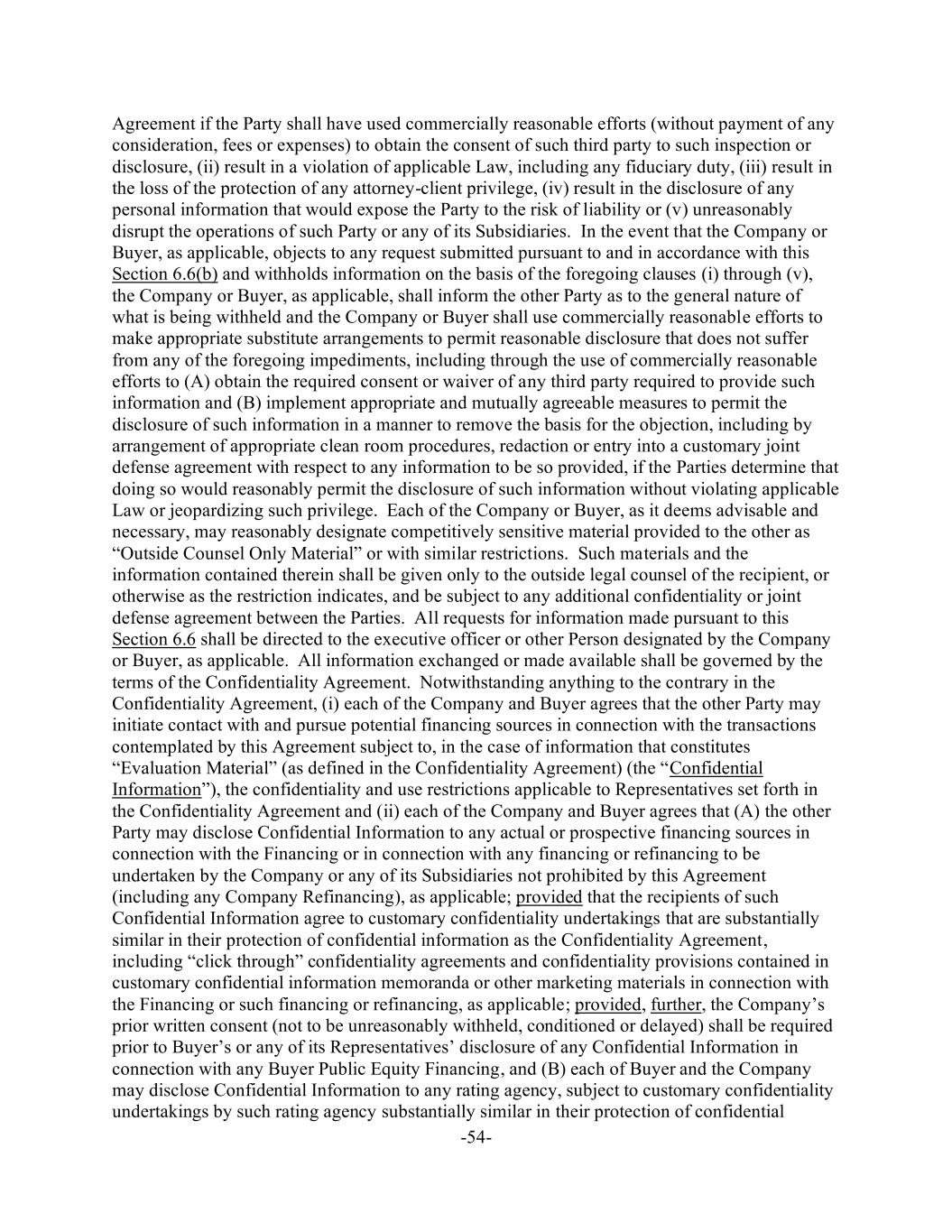 -54- Agreement if the Party shall have used commercially reasonable efforts (without payment of any consideration, fees or expenses) to obtain the consent of such third party to such inspection or disclosure, (ii) result in a violation of applicable Law, including any fiduciary duty, (iii) result in the loss of the protection of any attorney-client privilege, (iv) result in the disclosure of any personal information that would expose the Party to the risk of liability or (v) unreasonably disrupt the operations of such Party or any of its Subsidiaries. In the event that the Company or Buyer, as applicable, objects to any request submitted pursuant to and in accordance with this Section 6.6(b) and withholds information on the basis of the foregoing clauses (i) through (v), the Company or Buyer, as applicable, shall inform the other Party as to the general nature of what is being withheld and the Company or Buyer shall use commercially reasonable efforts to make appropriate substitute arrangements to permit reasonable disclosure that does not suffer from any of the foregoing impediments, including through the use of commercially reasonable efforts to (A) obtain the required consent or waiver of any third party required to provide such information and (B) implement appropriate and mutually agreeable measures to permit the disclosure of such information in a manner to remove the basis for the objection, including by arrangement of appropriate clean room procedures, redaction or entry into a customary joint defense agreement with respect to any information to be so provided, if the Parties determine that doing so would reasonably permit the disclosure of such information without violating applicable Law or jeopardizing such privilege. Each of the Company or Buyer, as it deems advisable and necessary, may reasonably designate competitively sensitive material provided to the other as “Outside Counsel Only Material” or with similar restrictions. Such materials and the information contained therein shall be given only to the outside legal counsel of the recipient, or otherwise as the restriction indicates, and be subject to any additional confidentiality or joint defense agreement between the Parties. All requests for information made pursuant to this Section 6.6 shall be directed to the executive officer or other Person designated by the Company or Buyer, as applicable. All information exchanged or made available shall be governed by the terms of the Confidentiality Agreement. Notwithstanding anything to the contrary in the Confidentiality Agreement, (i) each of the Company and Buyer agrees that the other Party may initiate contact with and pursue potential financing sources in connection with the transactions contemplated by this Agreement subject to, in the case of information that constitutes “Evaluation Material” (as defined in the Confidentiality Agreement) (the “Confidential Information”), the confidentiality and use restrictions applicable to Representatives set forth in the Confidentiality Agreement and (ii) each of the Company and Buyer agrees that (A) the other Party may disclose Confidential Information to any actual or prospective financing sources in connection with the Financing or in connection with any financing or refinancing to be undertaken by the Company or any of its Subsidiaries not prohibited by this Agreement (including any Company Refinancing), as applicable; provided that the recipients of such Confidential Information agree to customary confidentiality undertakings that are substantially similar in their protection of confidential information as the Confidentiality Agreement, including “click through” confidentiality agreements and confidentiality provisions contained in customary confidential information memoranda or other marketing materials in connection with the Financing or such financing or refinancing, as applicable; provided, further, the Company’s prior written consent (not to be unreasonably withheld, conditioned or delayed) shall be required prior to Buyer’s or any of its Representatives’ disclosure of any Confidential Information in connection with any Buyer Public Equity Financing, and (B) each of Buyer and the Company may disclose Confidential Information to any rating agency, subject to customary confidentiality undertakings by such rating agency substantially similar in their protection of confidential