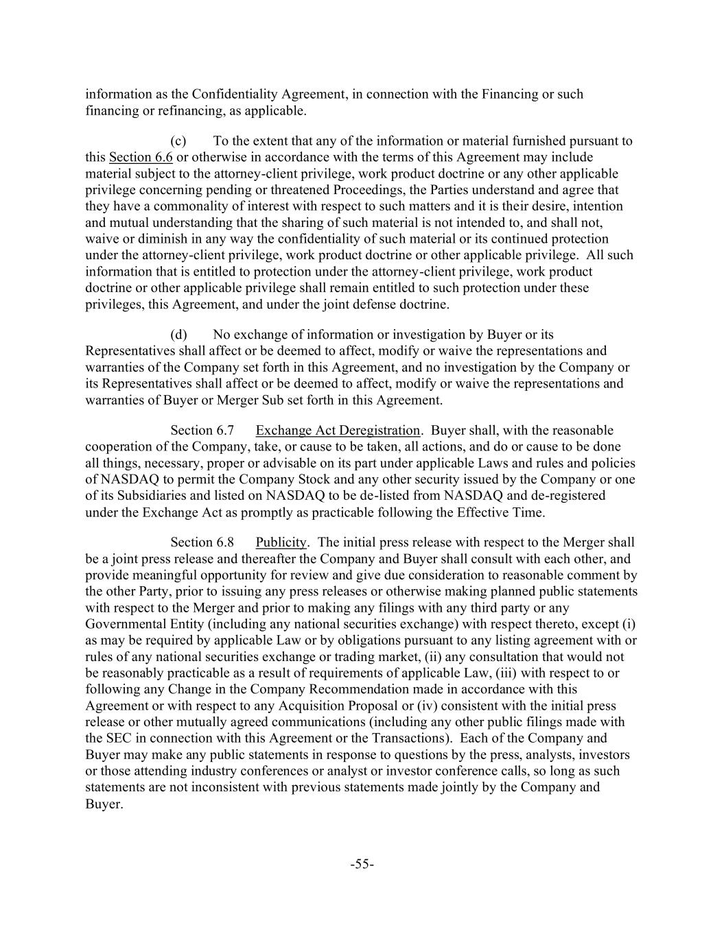 -55- information as the Confidentiality Agreement, in connection with the Financing or such financing or refinancing, as applicable. (c) To the extent that any of the information or material furnished pursuant to this Section 6.6 or otherwise in accordance with the terms of this Agreement may include material subject to the attorney-client privilege, work product doctrine or any other applicable privilege concerning pending or threatened Proceedings, the Parties understand and agree that they have a commonality of interest with respect to such matters and it is their desire, intention and mutual understanding that the sharing of such material is not intended to, and shall not, waive or diminish in any way the confidentiality of such material or its continued protection under the attorney-client privilege, work product doctrine or other applicable privilege. All such information that is entitled to protection under the attorney-client privilege, work product doctrine or other applicable privilege shall remain entitled to such protection under these privileges, this Agreement, and under the joint defense doctrine. (d) No exchange of information or investigation by Buyer or its Representatives shall affect or be deemed to affect, modify or waive the representations and warranties of the Company set forth in this Agreement, and no investigation by the Company or its Representatives shall affect or be deemed to affect, modify or waive the representations and warranties of Buyer or Merger Sub set forth in this Agreement. Section 6.7 Exchange Act Deregistration. Buyer shall, with the reasonable cooperation of the Company, take, or cause to be taken, all actions, and do or cause to be done all things, necessary, proper or advisable on its part under applicable Laws and rules and policies of NASDAQ to permit the Company Stock and any other security issued by the Company or one of its Subsidiaries and listed on NASDAQ to be de-listed from NASDAQ and de-registered under the Exchange Act as promptly as practicable following the Effective Time. Section 6.8 Publicity. The initial press release with respect to the Merger shall be a joint press release and thereafter the Company and Buyer shall consult with each other, and provide meaningful opportunity for review and give due consideration to reasonable comment by the other Party, prior to issuing any press releases or otherwise making planned public statements with respect to the Merger and prior to making any filings with any third party or any Governmental Entity (including any national securities exchange) with respect thereto, except (i) as may be required by applicable Law or by obligations pursuant to any listing agreement with or rules of any national securities exchange or trading market, (ii) any consultation that would not be reasonably practicable as a result of requirements of applicable Law, (iii) with respect to or following any Change in the Company Recommendation made in accordance with this Agreement or with respect to any Acquisition Proposal or (iv) consistent with the initial press release or other mutually agreed communications (including any other public filings made with the SEC in connection with this Agreement or the Transactions). Each of the Company and Buyer may make any public statements in response to questions by the press, analysts, investors or those attending industry conferences or analyst or investor conference calls, so long as such statements are not inconsistent with previous statements made jointly by the Company and Buyer.
