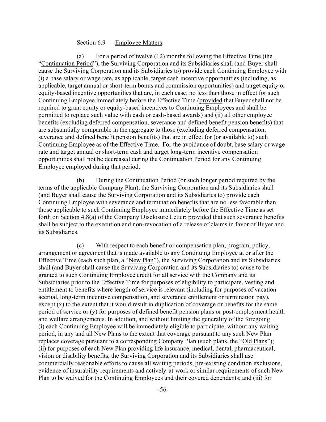 -56- Section 6.9 Employee Matters. (a) For a period of twelve (12) months following the Effective Time (the “Continuation Period”), the Surviving Corporation and its Subsidiaries shall (and Buyer shall cause the Surviving Corporation and its Subsidiaries to) provide each Continuing Employee with (i) a base salary or wage rate, as applicable, target cash incentive opportunities (including, as applicable, target annual or short-term bonus and commission opportunities) and target equity or equity-based incentive opportunities that are, in each case, no less than those in effect for such Continuing Employee immediately before the Effective Time (provided that Buyer shall not be required to grant equity or equity-based incentives to Continuing Employees and shall be permitted to replace such value with cash or cash-based awards) and (ii) all other employee benefits (excluding deferred compensation, severance and defined benefit pension benefits) that are substantially comparable in the aggregate to those (excluding deferred compensation, severance and defined benefit pension benefits) that are in effect for (or available to) such Continuing Employee as of the Effective Time. For the avoidance of doubt, base salary or wage rate and target annual or short-term cash and target long-term incentive compensation opportunities shall not be decreased during the Continuation Period for any Continuing Employee employed during that period. (b) During the Continuation Period (or such longer period required by the terms of the applicable Company Plan), the Surviving Corporation and its Subsidiaries shall (and Buyer shall cause the Surviving Corporation and its Subsidiaries to) provide each Continuing Employee with severance and termination benefits that are no less favorable than those applicable to such Continuing Employee immediately before the Effective Time as set forth on Section 4.8(a) of the Company Disclosure Letter; provided that such severance benefits shall be subject to the execution and non-revocation of a release of claims in favor of Buyer and its Subsidiaries. (c) With respect to each benefit or compensation plan, program, policy, arrangement or agreement that is made available to any Continuing Employee at or after the Effective Time (each such plan, a “New Plan”), the Surviving Corporation and its Subsidiaries shall (and Buyer shall cause the Surviving Corporation and its Subsidiaries to) cause to be granted to such Continuing Employee credit for all service with the Company and its Subsidiaries prior to the Effective Time for purposes of eligibility to participate, vesting and entitlement to benefits where length of service is relevant (including for purposes of vacation accrual, long-term incentive compensation, and severance entitlement or termination pay), except (x) to the extent that it would result in duplication of coverage or benefits for the same period of service or (y) for purposes of defined benefit pension plans or post-employment health and welfare arrangements. In addition, and without limiting the generality of the foregoing: (i) each Continuing Employee will be immediately eligible to participate, without any waiting period, in any and all New Plans to the extent that coverage pursuant to any such New Plan replaces coverage pursuant to a corresponding Company Plan (such plans, the “Old Plans”); (ii) for purposes of each New Plan providing life insurance, medical, dental, pharmaceutical, vision or disability benefits, the Surviving Corporation and its Subsidiaries shall use commercially reasonable efforts to cause all waiting periods, pre-existing condition exclusions, evidence of insurability requirements and actively-at-work or similar requirements of such New Plan to be waived for the Continuing Employees and their covered dependents; and (iii) for