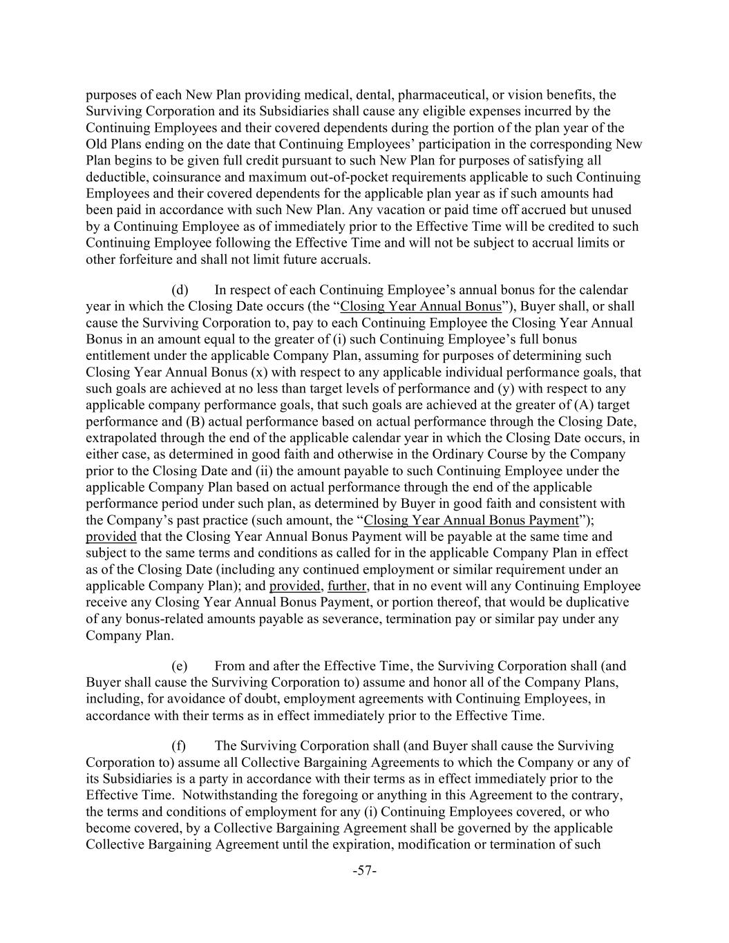 -57- purposes of each New Plan providing medical, dental, pharmaceutical, or vision benefits, the Surviving Corporation and its Subsidiaries shall cause any eligible expenses incurred by the Continuing Employees and their covered dependents during the portion of the plan year of the Old Plans ending on the date that Continuing Employees’ participation in the corresponding New Plan begins to be given full credit pursuant to such New Plan for purposes of satisfying all deductible, coinsurance and maximum out-of-pocket requirements applicable to such Continuing Employees and their covered dependents for the applicable plan year as if such amounts had been paid in accordance with such New Plan. Any vacation or paid time off accrued but unused by a Continuing Employee as of immediately prior to the Effective Time will be credited to such Continuing Employee following the Effective Time and will not be subject to accrual limits or other forfeiture and shall not limit future accruals. (d) In respect of each Continuing Employee’s annual bonus for the calendar year in which the Closing Date occurs (the “Closing Year Annual Bonus”), Buyer shall, or shall cause the Surviving Corporation to, pay to each Continuing Employee the Closing Year Annual Bonus in an amount equal to the greater of (i) such Continuing Employee’s full bonus entitlement under the applicable Company Plan, assuming for purposes of determining such Closing Year Annual Bonus (x) with respect to any applicable individual performance goals, that such goals are achieved at no less than target levels of performance and (y) with respect to any applicable company performance goals, that such goals are achieved at the greater of (A) target performance and (B) actual performance based on actual performance through the Closing Date, extrapolated through the end of the applicable calendar year in which the Closing Date occurs, in either case, as determined in good faith and otherwise in the Ordinary Course by the Company prior to the Closing Date and (ii) the amount payable to such Continuing Employee under the applicable Company Plan based on actual performance through the end of the applicable performance period under such plan, as determined by Buyer in good faith and consistent with the Company’s past practice (such amount, the “Closing Year Annual Bonus Payment”); provided that the Closing Year Annual Bonus Payment will be payable at the same time and subject to the same terms and conditions as called for in the applicable Company Plan in effect as of the Closing Date (including any continued employment or similar requirement under an applicable Company Plan); and provided, further, that in no event will any Continuing Employee receive any Closing Year Annual Bonus Payment, or portion thereof, that would be duplicative of any bonus-related amounts payable as severance, termination pay or similar pay under any Company Plan. (e) From and after the Effective Time, the Surviving Corporation shall (and Buyer shall cause the Surviving Corporation to) assume and honor all of the Company Plans, including, for avoidance of doubt, employment agreements with Continuing Employees, in accordance with their terms as in effect immediately prior to the Effective Time. (f) The Surviving Corporation shall (and Buyer shall cause the Surviving Corporation to) assume all Collective Bargaining Agreements to which the Company or any of its Subsidiaries is a party in accordance with their terms as in effect immediately prior to the Effective Time. Notwithstanding the foregoing or anything in this Agreement to the contrary, the terms and conditions of employment for any (i) Continuing Employees covered, or who become covered, by a Collective Bargaining Agreement shall be governed by the applicable Collective Bargaining Agreement until the expiration, modification or termination of such