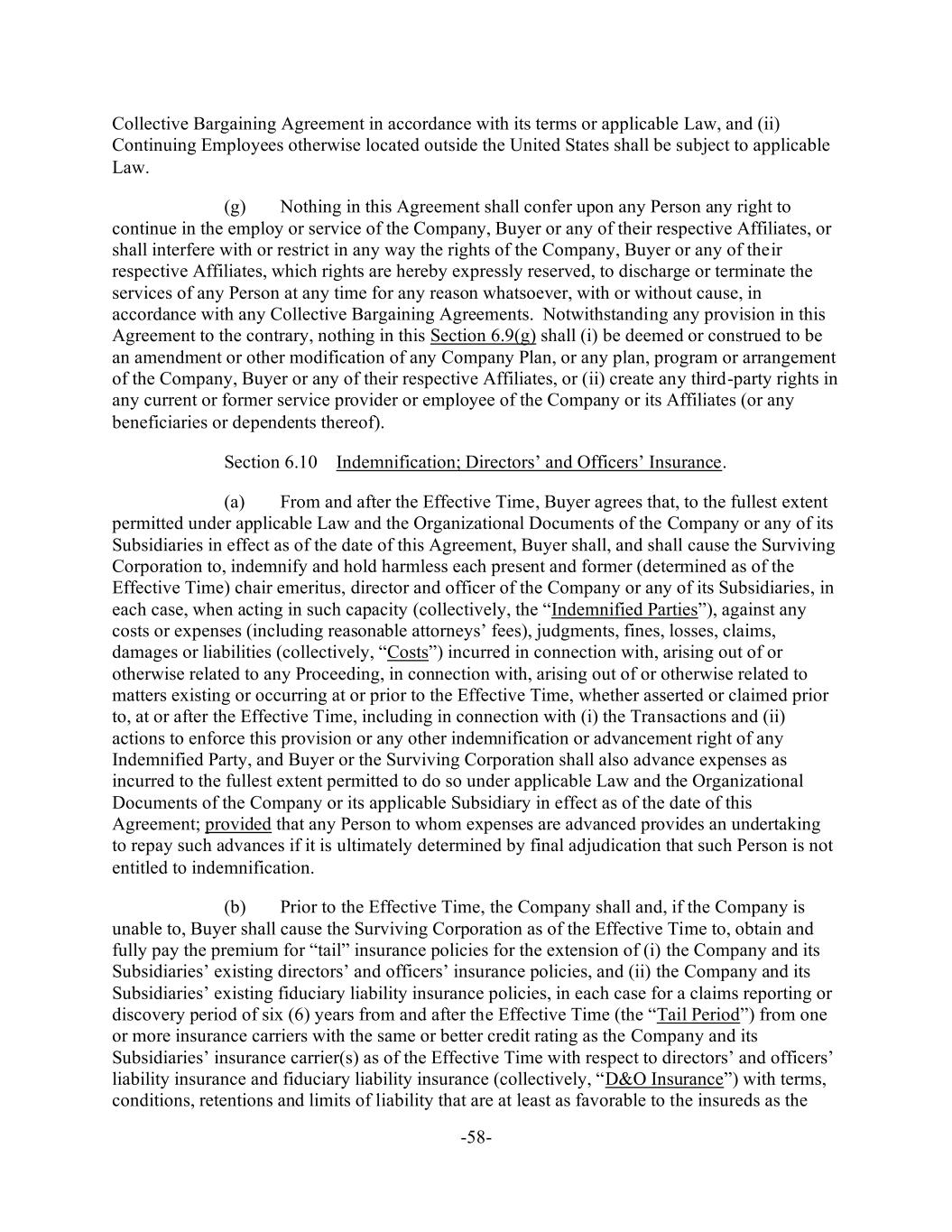 -58- Collective Bargaining Agreement in accordance with its terms or applicable Law, and (ii) Continuing Employees otherwise located outside the United States shall be subject to applicable Law. (g) Nothing in this Agreement shall confer upon any Person any right to continue in the employ or service of the Company, Buyer or any of their respective Affiliates, or shall interfere with or restrict in any way the rights of the Company, Buyer or any of their respective Affiliates, which rights are hereby expressly reserved, to discharge or terminate the services of any Person at any time for any reason whatsoever, with or without cause, in accordance with any Collective Bargaining Agreements. Notwithstanding any provision in this Agreement to the contrary, nothing in this Section 6.9(g) shall (i) be deemed or construed to be an amendment or other modification of any Company Plan, or any plan, program or arrangement of the Company, Buyer or any of their respective Affiliates, or (ii) create any third-party rights in any current or former service provider or employee of the Company or its Affiliates (or any beneficiaries or dependents thereof). Section 6.10 Indemnification; Directors’ and Officers’ Insurance. (a) From and after the Effective Time, Buyer agrees that, to the fullest extent permitted under applicable Law and the Organizational Documents of the Company or any of its Subsidiaries in effect as of the date of this Agreement, Buyer shall, and shall cause the Surviving Corporation to, indemnify and hold harmless each present and former (determined as of the Effective Time) chair emeritus, director and officer of the Company or any of its Subsidiaries, in each case, when acting in such capacity (collectively, the “Indemnified Parties”), against any costs or expenses (including reasonable attorneys’ fees), judgments, fines, losses, claims, damages or liabilities (collectively, “Costs”) incurred in connection with, arising out of or otherwise related to any Proceeding, in connection with, arising out of or otherwise related to matters existing or occurring at or prior to the Effective Time, whether asserted or claimed prior to, at or after the Effective Time, including in connection with (i) the Transactions and (ii) actions to enforce this provision or any other indemnification or advancement right of any Indemnified Party, and Buyer or the Surviving Corporation shall also advance expenses as incurred to the fullest extent permitted to do so under applicable Law and the Organizational Documents of the Company or its applicable Subsidiary in effect as of the date of this Agreement; provided that any Person to whom expenses are advanced provides an undertaking to repay such advances if it is ultimately determined by final adjudication that such Person is not entitled to indemnification. (b) Prior to the Effective Time, the Company shall and, if the Company is unable to, Buyer shall cause the Surviving Corporation as of the Effective Time to, obtain and fully pay the premium for “tail” insurance policies for the extension of (i) the Company and its Subsidiaries’ existing directors’ and officers’ insurance policies, and (ii) the Company and its Subsidiaries’ existing fiduciary liability insurance policies, in each case for a claims reporting or discovery period of six (6) years from and after the Effective Time (the “Tail Period”) from one or more insurance carriers with the same or better credit rating as the Company and its Subsidiaries’ insurance carrier(s) as of the Effective Time with respect to directors’ and officers’ liability insurance and fiduciary liability insurance (collectively, “D&O Insurance”) with terms, conditions, retentions and limits of liability that are at least as favorable to the insureds as the