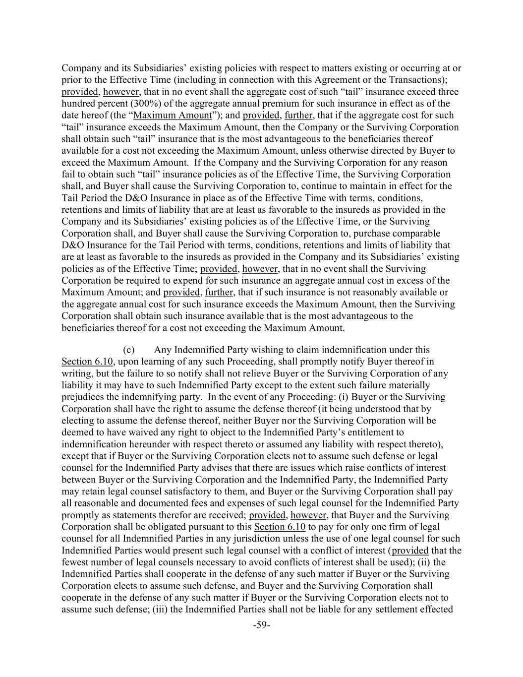 -59- Company and its Subsidiaries’ existing policies with respect to matters existing or occurring at or prior to the Effective Time (including in connection with this Agreement or the Transactions); provided, however, that in no event shall the aggregate cost of such “tail” insurance exceed three hundred percent (300%) of the aggregate annual premium for such insurance in effect as of the date hereof (the “Maximum Amount”); and provided, further, that if the aggregate cost for such “tail” insurance exceeds the Maximum Amount, then the Company or the Surviving Corporation shall obtain such “tail” insurance that is the most advantageous to the beneficiaries thereof available for a cost not exceeding the Maximum Amount, unless otherwise directed by Buyer to exceed the Maximum Amount. If the Company and the Surviving Corporation for any reason fail to obtain such “tail” insurance policies as of the Effective Time, the Surviving Corporation shall, and Buyer shall cause the Surviving Corporation to, continue to maintain in effect for the Tail Period the D&O Insurance in place as of the Effective Time with terms, conditions, retentions and limits of liability that are at least as favorable to the insureds as provided in the Company and its Subsidiaries’ existing policies as of the Effective Time, or the Surviving Corporation shall, and Buyer shall cause the Surviving Corporation to, purchase comparable D&O Insurance for the Tail Period with terms, conditions, retentions and limits of liability that are at least as favorable to the insureds as provided in the Company and its Subsidiaries’ existing policies as of the Effective Time; provided, however, that in no event shall the Surviving Corporation be required to expend for such insurance an aggregate annual cost in excess of the Maximum Amount; and provided, further, that if such insurance is not reasonably available or the aggregate annual cost for such insurance exceeds the Maximum Amount, then the Surviving Corporation shall obtain such insurance available that is the most advantageous to the beneficiaries thereof for a cost not exceeding the Maximum Amount. (c) Any Indemnified Party wishing to claim indemnification under this Section 6.10, upon learning of any such Proceeding, shall promptly notify Buyer thereof in writing, but the failure to so notify shall not relieve Buyer or the Surviving Corporation of any liability it may have to such Indemnified Party except to the extent such failure materially prejudices the indemnifying party. In the event of any Proceeding: (i) Buyer or the Surviving Corporation shall have the right to assume the defense thereof (it being understood that by electing to assume the defense thereof, neither Buyer nor the Surviving Corporation will be deemed to have waived any right to object to the Indemnified Party’s entitlement to indemnification hereunder with respect thereto or assumed any liability with respect thereto), except that if Buyer or the Surviving Corporation elects not to assume such defense or legal counsel for the Indemnified Party advises that there are issues which raise conflicts of interest between Buyer or the Surviving Corporation and the Indemnified Party, the Indemnified Party may retain legal counsel satisfactory to them, and Buyer or the Surviving Corporation shall pay all reasonable and documented fees and expenses of such legal counsel for the Indemnified Party promptly as statements therefor are received; provided, however, that Buyer and the Surviving Corporation shall be obligated pursuant to this Section 6.10 to pay for only one firm of legal counsel for all Indemnified Parties in any jurisdiction unless the use of one legal counsel for such Indemnified Parties would present such legal counsel with a conflict of interest (provided that the fewest number of legal counsels necessary to avoid conflicts of interest shall be used); (ii) the Indemnified Parties shall cooperate in the defense of any such matter if Buyer or the Surviving Corporation elects to assume such defense, and Buyer and the Surviving Corporation shall cooperate in the defense of any such matter if Buyer or the Surviving Corporation elects not to assume such defense; (iii) the Indemnified Parties shall not be liable for any settlement effected