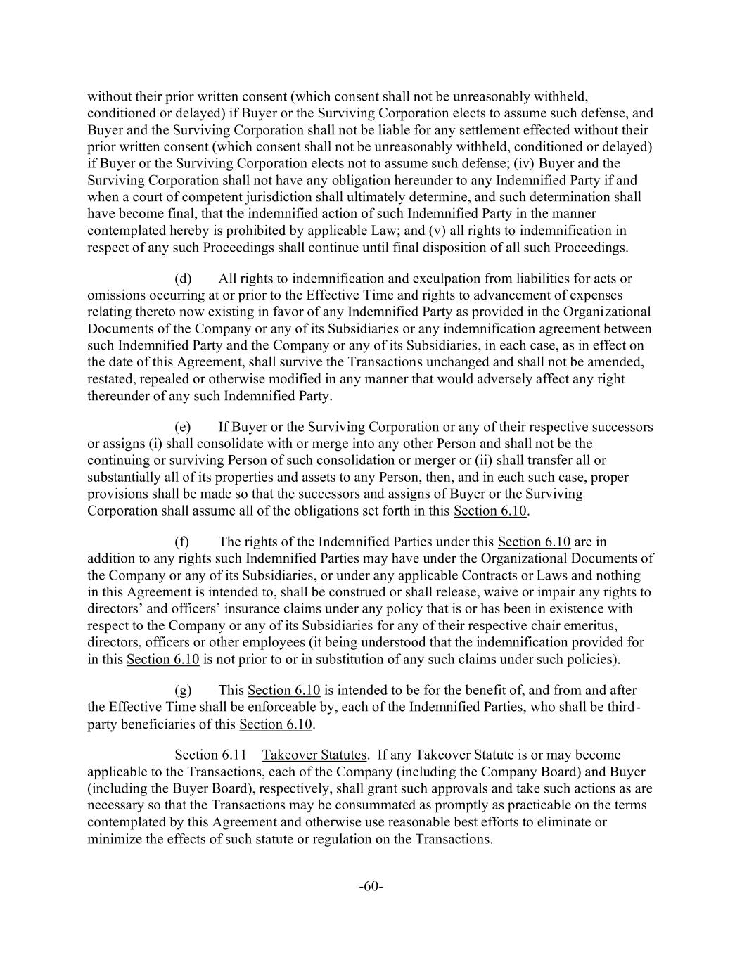 -60- without their prior written consent (which consent shall not be unreasonably withheld, conditioned or delayed) if Buyer or the Surviving Corporation elects to assume such defense, and Buyer and the Surviving Corporation shall not be liable for any settlement effected without their prior written consent (which consent shall not be unreasonably withheld, conditioned or delayed) if Buyer or the Surviving Corporation elects not to assume such defense; (iv) Buyer and the Surviving Corporation shall not have any obligation hereunder to any Indemnified Party if and when a court of competent jurisdiction shall ultimately determine, and such determination shall have become final, that the indemnified action of such Indemnified Party in the manner contemplated hereby is prohibited by applicable Law; and (v) all rights to indemnification in respect of any such Proceedings shall continue until final disposition of all such Proceedings. (d) All rights to indemnification and exculpation from liabilities for acts or omissions occurring at or prior to the Effective Time and rights to advancement of expenses relating thereto now existing in favor of any Indemnified Party as provided in the Organizational Documents of the Company or any of its Subsidiaries or any indemnification agreement between such Indemnified Party and the Company or any of its Subsidiaries, in each case, as in effect on the date of this Agreement, shall survive the Transactions unchanged and shall not be amended, restated, repealed or otherwise modified in any manner that would adversely affect any right thereunder of any such Indemnified Party. (e) If Buyer or the Surviving Corporation or any of their respective successors or assigns (i) shall consolidate with or merge into any other Person and shall not be the continuing or surviving Person of such consolidation or merger or (ii) shall transfer all or substantially all of its properties and assets to any Person, then, and in each such case, proper provisions shall be made so that the successors and assigns of Buyer or the Surviving Corporation shall assume all of the obligations set forth in this Section 6.10. (f) The rights of the Indemnified Parties under this Section 6.10 are in addition to any rights such Indemnified Parties may have under the Organizational Documents of the Company or any of its Subsidiaries, or under any applicable Contracts or Laws and nothing in this Agreement is intended to, shall be construed or shall release, waive or impair any rights to directors’ and officers’ insurance claims under any policy that is or has been in existence with respect to the Company or any of its Subsidiaries for any of their respective chair emeritus, directors, officers or other employees (it being understood that the indemnification provided for in this Section 6.10 is not prior to or in substitution of any such claims under such policies). (g) This Section 6.10 is intended to be for the benefit of, and from and after the Effective Time shall be enforceable by, each of the Indemnified Parties, who shall be third- party beneficiaries of this Section 6.10. Section 6.11 Takeover Statutes. If any Takeover Statute is or may become applicable to the Transactions, each of the Company (including the Company Board) and Buyer (including the Buyer Board), respectively, shall grant such approvals and take such actions as are necessary so that the Transactions may be consummated as promptly as practicable on the terms contemplated by this Agreement and otherwise use reasonable best efforts to eliminate or minimize the effects of such statute or regulation on the Transactions.