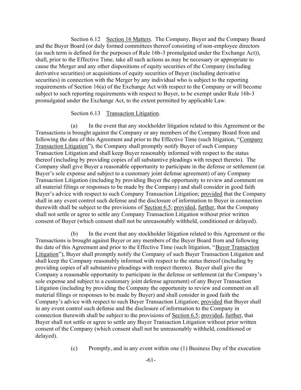 -61- Section 6.12 Section 16 Matters. The Company, Buyer and the Company Board and the Buyer Board (or duly formed committees thereof consisting of non-employee directors (as such term is defined for the purposes of Rule 16b-3 promulgated under the Exchange Act)), shall, prior to the Effective Time, take all such actions as may be necessary or appropriate to cause the Merger and any other dispositions of equity securities of the Company (including derivative securities) or acquisitions of equity securities of Buyer (including derivative securities) in connection with the Merger by any individual who is subject to the reporting requirements of Section 16(a) of the Exchange Act with respect to the Company or will become subject to such reporting requirements with respect to Buyer, to be exempt under Rule 16b-3 promulgated under the Exchange Act, to the extent permitted by applicable Law. Section 6.13 Transaction Litigation. (a) In the event that any stockholder litigation related to this Agreement or the Transactions is brought against the Company or any members of the Company Board from and following the date of this Agreement and prior to the Effective Time (such litigation, “Company Transaction Litigation”), the Company shall promptly notify Buyer of such Company Transaction Litigation and shall keep Buyer reasonably informed with respect to the status thereof (including by providing copies of all substantive pleadings with respect thereto). The Company shall give Buyer a reasonable opportunity to participate in the defense or settlement (at Buyer’s sole expense and subject to a customary joint defense agreement) of any Company Transaction Litigation (including by providing Buyer the opportunity to review and comment on all material filings or responses to be made by the Company) and shall consider in good faith Buyer’s advice with respect to such Company Transaction Litigation; provided that the Company shall in any event control such defense and the disclosure of information to Buyer in connection therewith shall be subject to the provisions of Section 6.5; provided, further, that the Company shall not settle or agree to settle any Company Transaction Litigation without prior written consent of Buyer (which consent shall not be unreasonably withheld, conditioned or delayed). (b) In the event that any stockholder litigation related to this Agreement or the Transactions is brought against Buyer or any members of the Buyer Board from and following the date of this Agreement and prior to the Effective Time (such litigation, “Buyer Transaction Litigation”), Buyer shall promptly notify the Company of such Buyer Transaction Litigation and shall keep the Company reasonably informed with respect to the status thereof (including by providing copies of all substantive pleadings with respect thereto). Buyer shall give the Company a reasonable opportunity to participate in the defense or settlement (at the Company’s sole expense and subject to a customary joint defense agreement) of any Buyer Transaction Litigation (including by providing the Company the opportunity to review and comment on all material filings or responses to be made by Buyer) and shall consider in good faith the Company’s advice with respect to such Buyer Transaction Litigation; provided that Buyer shall in any event control such defense and the disclosure of information to the Company in connection therewith shall be subject to the provisions of Section 6.5; provided, further, that Buyer shall not settle or agree to settle any Buyer Transaction Litigation without prior written consent of the Company (which consent shall not be unreasonably withheld, conditioned or delayed). (c) Promptly, and in any event within one (1) Business Day of the execution