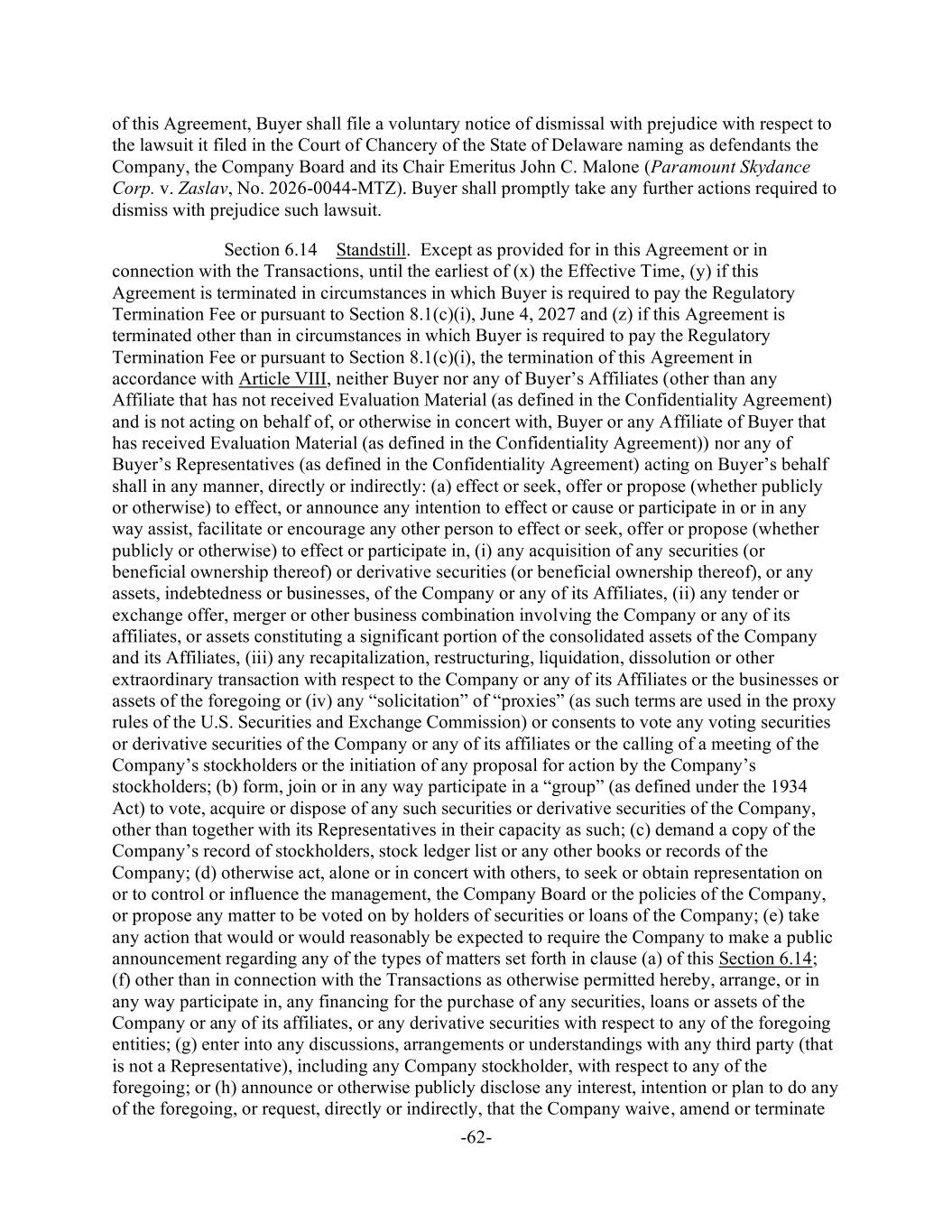 -62- of this Agreement, Buyer shall file a voluntary notice of dismissal with prejudice with respect to the lawsuit it filed in the Court of Chancery of the State of Delaware naming as defendants the Company, the Company Board and its Chair Emeritus John C. Malone (Paramount Skydance Corp. v. Zaslav, No. 2026-0044-MTZ). Buyer shall promptly take any further actions required to dismiss with prejudice such lawsuit. Section 6.14 Standstill. Except as provided for in this Agreement or in connection with the Transactions, until the earliest of (x) the Effective Time, (y) if this Agreement is terminated in circumstances in which Buyer is required to pay the Regulatory Termination Fee or pursuant to Section 8.1(c)(i), June 4, 2027 and (z) if this Agreement is terminated other than in circumstances in which Buyer is required to pay the Regulatory Termination Fee or pursuant to Section 8.1(c)(i), the termination of this Agreement in accordance with Article VIII, neither Buyer nor any of Buyer’s Affiliates (other than any Affiliate that has not received Evaluation Material (as defined in the Confidentiality Agreement) and is not acting on behalf of, or otherwise in concert with, Buyer or any Affiliate of Buyer that has received Evaluation Material (as defined in the Confidentiality Agreement)) nor any of Buyer’s Representatives (as defined in the Confidentiality Agreement) acting on Buyer’s behalf shall in any manner, directly or indirectly: (a) effect or seek, offer or propose (whether publicly or otherwise) to effect, or announce any intention to effect or cause or participate in or in any way assist, facilitate or encourage any other person to effect or seek, offer or propose (whether publicly or otherwise) to effect or participate in, (i) any acquisition of any securities (or beneficial ownership thereof) or derivative securities (or beneficial ownership thereof), or any assets, indebtedness or businesses, of the Company or any of its Affiliates, (ii) any tender or exchange offer, merger or other business combination involving the Company or any of its affiliates, or assets constituting a significant portion of the consolidated assets of the Company and its Affiliates, (iii) any recapitalization, restructuring, liquidation, dissolution or other extraordinary transaction with respect to the Company or any of its Affiliates or the businesses or assets of the foregoing or (iv) any “solicitation” of “proxies” (as such terms are used in the proxy rules of the U.S. Securities and Exchange Commission) or consents to vote any voting securities or derivative securities of the Company or any of its affiliates or the calling of a meeting of the Company’s stockholders or the initiation of any proposal for action by the Company’s stockholders; (b) form, join or in any way participate in a “group” (as defined under the 1934 Act) to vote, acquire or dispose of any such securities or derivative securities of the Company, other than together with its Representatives in their capacity as such; (c) demand a copy of the Company’s record of stockholders, stock ledger list or any other books or records of the Company; (d) otherwise act, alone or in concert with others, to seek or obtain representation on or to control or influence the management, the Company Board or the policies of the Company, or propose any matter to be voted on by holders of securities or loans of the Company; (e) take any action that would or would reasonably be expected to require the Company to make a public announcement regarding any of the types of matters set forth in clause (a) of this Section 6.14; (f) other than in connection with the Transactions as otherwise permitted hereby, arrange, or in any way participate in, any financing for the purchase of any securities, loans or assets of the Company or any of its affiliates, or any derivative securities with respect to any of the foregoing entities; (g) enter into any discussions, arrangements or understandings with any third party (that is not a Representative), including any Company stockholder, with respect to any of the foregoing; or (h) announce or otherwise publicly disclose any interest, intention or plan to do any of the foregoing, or request, directly or indirectly, that the Company waive, amend or terminate