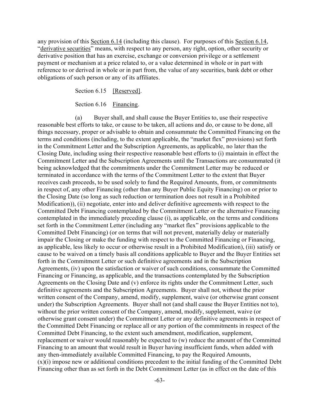 -63- any provision of this Section 6.14 (including this clause). For purposes of this Section 6.14, “derivative securities” means, with respect to any person, any right, option, other security or derivative position that has an exercise, exchange or conversion privilege or a settlement payment or mechanism at a price related to, or a value determined in whole or in part with reference to or derived in whole or in part from, the value of any securities, bank debt or other obligations of such person or any of its affiliates. Section 6.15 [Reserved]. Section 6.16 Financing. (a) Buyer shall, and shall cause the Buyer Entities to, use their respective reasonable best efforts to take, or cause to be taken, all actions and do, or cause to be done, all things necessary, proper or advisable to obtain and consummate the Committed Financing on the terms and conditions (including, to the extent applicable, the “market flex” provisions) set forth in the Commitment Letter and the Subscription Agreements, as applicable, no later than the Closing Date, including using their respective reasonable best efforts to (i) maintain in effect the Commitment Letter and the Subscription Agreements until the Transactions are consummated (it being acknowledged that the commitments under the Commitment Letter may be reduced or terminated in accordance with the terms of the Commitment Letter to the extent that Buyer receives cash proceeds, to be used solely to fund the Required Amounts, from, or commitments in respect of, any other Financing (other than any Buyer Public Equity Financing) on or prior to the Closing Date (so long as such reduction or termination does not result in a Prohibited Modification)), (ii) negotiate, enter into and deliver definitive agreements with respect to the Committed Debt Financing contemplated by the Commitment Letter or the alternative Financing contemplated in the immediately preceding clause (i), as applicable, on the terms and conditions set forth in the Commitment Letter (including any “market flex” provisions applicable to the Committed Debt Financing) (or on terms that will not prevent, materially delay or materially impair the Closing or make the funding with respect to the Committed Financing or Financing, as applicable, less likely to occur or otherwise result in a Prohibited Modification), (iii) satisfy or cause to be waived on a timely basis all conditions applicable to Buyer and the Buyer Entities set forth in the Commitment Letter or such definitive agreements and in the Subscription Agreements, (iv) upon the satisfaction or waiver of such conditions, consummate the Committed Financing or Financing, as applicable, and the transactions contemplated by the Subscription Agreements on the Closing Date and (v) enforce its rights under the Commitment Letter, such definitive agreements and the Subscription Agreements. Buyer shall not, without the prior written consent of the Company, amend, modify, supplement, waive (or otherwise grant consent under) the Subscription Agreements. Buyer shall not (and shall cause the Buyer Entities not to), without the prior written consent of the Company, amend, modify, supplement, waive (or otherwise grant consent under) the Commitment Letter or any definitive agreements in respect of the Committed Debt Financing or replace all or any portion of the commitments in respect of the Committed Debt Financing, to the extent such amendment, modification, supplement, replacement or waiver would reasonably be expected to (w) reduce the amount of the Committed Financing to an amount that would result in Buyer having insufficient funds, when added with any then-immediately available Committed Financing, to pay the Required Amounts, (x)(i) impose new or additional conditions precedent to the initial funding of the Committed Debt Financing other than as set forth in the Debt Commitment Letter (as in effect on the date of this