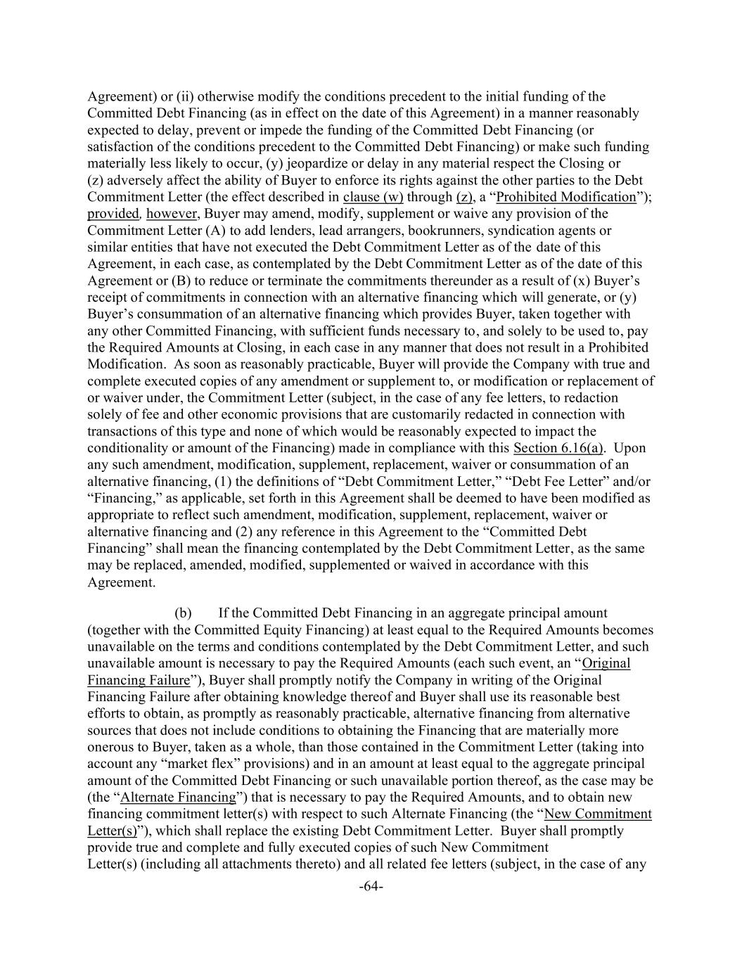 -64- Agreement) or (ii) otherwise modify the conditions precedent to the initial funding of the Committed Debt Financing (as in effect on the date of this Agreement) in a manner reasonably expected to delay, prevent or impede the funding of the Committed Debt Financing (or satisfaction of the conditions precedent to the Committed Debt Financing) or make such funding materially less likely to occur, (y) jeopardize or delay in any material respect the Closing or (z) adversely affect the ability of Buyer to enforce its rights against the other parties to the Debt Commitment Letter (the effect described in clause (w) through (z), a “Prohibited Modification”); provided, however, Buyer may amend, modify, supplement or waive any provision of the Commitment Letter (A) to add lenders, lead arrangers, bookrunners, syndication agents or similar entities that have not executed the Debt Commitment Letter as of the date of this Agreement, in each case, as contemplated by the Debt Commitment Letter as of the date of this Agreement or (B) to reduce or terminate the commitments thereunder as a result of (x) Buyer’s receipt of commitments in connection with an alternative financing which will generate, or (y) Buyer’s consummation of an alternative financing which provides Buyer, taken together with any other Committed Financing, with sufficient funds necessary to, and solely to be used to, pay the Required Amounts at Closing, in each case in any manner that does not result in a Prohibited Modification. As soon as reasonably practicable, Buyer will provide the Company with true and complete executed copies of any amendment or supplement to, or modification or replacement of or waiver under, the Commitment Letter (subject, in the case of any fee letters, to redaction solely of fee and other economic provisions that are customarily redacted in connection with transactions of this type and none of which would be reasonably expected to impact the conditionality or amount of the Financing) made in compliance with this Section 6.16(a). Upon any such amendment, modification, supplement, replacement, waiver or consummation of an alternative financing, (1) the definitions of “Debt Commitment Letter,” “Debt Fee Letter” and/or “Financing,” as applicable, set forth in this Agreement shall be deemed to have been modified as appropriate to reflect such amendment, modification, supplement, replacement, waiver or alternative financing and (2) any reference in this Agreement to the “Committed Debt Financing” shall mean the financing contemplated by the Debt Commitment Letter, as the same may be replaced, amended, modified, supplemented or waived in accordance with this Agreement. (b) If the Committed Debt Financing in an aggregate principal amount (together with the Committed Equity Financing) at least equal to the Required Amounts becomes unavailable on the terms and conditions contemplated by the Debt Commitment Letter, and such unavailable amount is necessary to pay the Required Amounts (each such event, an “Original Financing Failure”), Buyer shall promptly notify the Company in writing of the Original Financing Failure after obtaining knowledge thereof and Buyer shall use its reasonable best efforts to obtain, as promptly as reasonably practicable, alternative financing from alternative sources that does not include conditions to obtaining the Financing that are materially more onerous to Buyer, taken as a whole, than those contained in the Commitment Letter (taking into account any “market flex” provisions) and in an amount at least equal to the aggregate principal amount of the Committed Debt Financing or such unavailable portion thereof, as the case may be (the “Alternate Financing”) that is necessary to pay the Required Amounts, and to obtain new financing commitment letter(s) with respect to such Alternate Financing (the “New Commitment Letter(s)”), which shall replace the existing Debt Commitment Letter. Buyer shall promptly provide true and complete and fully executed copies of such New Commitment Letter(s) (including all attachments thereto) and all related fee letters (subject, in the case of any