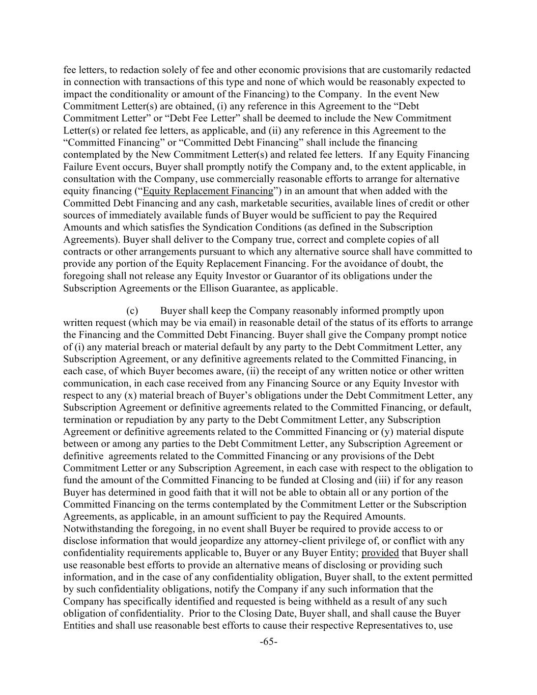 -65- fee letters, to redaction solely of fee and other economic provisions that are customarily redacted in connection with transactions of this type and none of which would be reasonably expected to impact the conditionality or amount of the Financing) to the Company. In the event New Commitment Letter(s) are obtained, (i) any reference in this Agreement to the “Debt Commitment Letter” or “Debt Fee Letter” shall be deemed to include the New Commitment Letter(s) or related fee letters, as applicable, and (ii) any reference in this Agreement to the “Committed Financing” or “Committed Debt Financing” shall include the financing contemplated by the New Commitment Letter(s) and related fee letters. If any Equity Financing Failure Event occurs, Buyer shall promptly notify the Company and, to the extent applicable, in consultation with the Company, use commercially reasonable efforts to arrange for alternative equity financing (“Equity Replacement Financing”) in an amount that when added with the Committed Debt Financing and any cash, marketable securities, available lines of credit or other sources of immediately available funds of Buyer would be sufficient to pay the Required Amounts and which satisfies the Syndication Conditions (as defined in the Subscription Agreements). Buyer shall deliver to the Company true, correct and complete copies of all contracts or other arrangements pursuant to which any alternative source shall have committed to provide any portion of the Equity Replacement Financing. For the avoidance of doubt, the foregoing shall not release any Equity Investor or Guarantor of its obligations under the Subscription Agreements or the Ellison Guarantee, as applicable. (c)  Buyer shall keep the Company reasonably informed promptly upon written request (which may be via email) in reasonable detail of the status of its efforts to arrange the Financing and the Committed Debt Financing. Buyer shall give the Company prompt notice of (i) any material breach or material default by any party to the Debt Commitment Letter, any Subscription Agreement, or any definitive agreements related to the Committed Financing, in each case, of which Buyer becomes aware, (ii) the receipt of any written notice or other written communication, in each case received from any Financing Source or any Equity Investor with respect to any (x) material breach of Buyer’s obligations under the Debt Commitment Letter, any Subscription Agreement or definitive agreements related to the Committed Financing, or default, termination or repudiation by any party to the Debt Commitment Letter, any Subscription Agreement or definitive agreements related to the Committed Financing or (y) material dispute between or among any parties to the Debt Commitment Letter, any Subscription Agreement or definitive agreements related to the Committed Financing or any provisions of the Debt Commitment Letter or any Subscription Agreement, in each case with respect to the obligation to fund the amount of the Committed Financing to be funded at Closing and (iii) if for any reason Buyer has determined in good faith that it will not be able to obtain all or any portion of the Committed Financing on the terms contemplated by the Commitment Letter or the Subscription Agreements, as applicable, in an amount sufficient to pay the Required Amounts. Notwithstanding the foregoing, in no event shall Buyer be required to provide access to or disclose information that would jeopardize any attorney-client privilege of, or conflict with any confidentiality requirements applicable to, Buyer or any Buyer Entity; provided that Buyer shall use reasonable best efforts to provide an alternative means of disclosing or providing such information, and in the case of any confidentiality obligation, Buyer shall, to the extent permitted by such confidentiality obligations, notify the Company if any such information that the Company has specifically identified and requested is being withheld as a result of any such obligation of confidentiality. Prior to the Closing Date, Buyer shall, and shall cause the Buyer Entities and shall use reasonable best efforts to cause their respective Representatives to, use