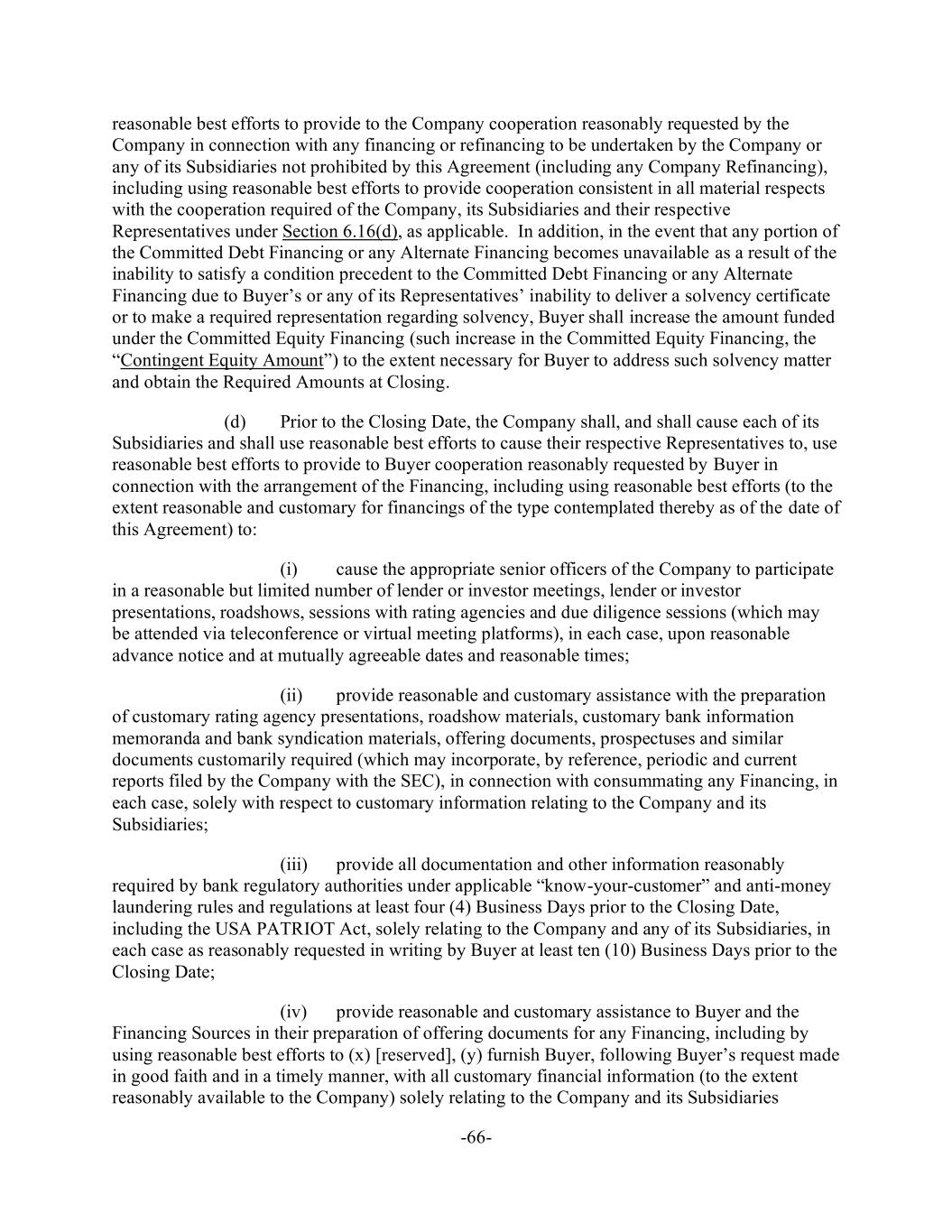 -66- reasonable best efforts to provide to the Company cooperation reasonably requested by the Company in connection with any financing or refinancing to be undertaken by the Company or any of its Subsidiaries not prohibited by this Agreement (including any Company Refinancing), including using reasonable best efforts to provide cooperation consistent in all material respects with the cooperation required of the Company, its Subsidiaries and their respective Representatives under Section 6.16(d), as applicable. In addition, in the event that any portion of the Committed Debt Financing or any Alternate Financing becomes unavailable as a result of the inability to satisfy a condition precedent to the Committed Debt Financing or any Alternate Financing due to Buyer’s or any of its Representatives’ inability to deliver a solvency certificate or to make a required representation regarding solvency, Buyer shall increase the amount funded under the Committed Equity Financing (such increase in the Committed Equity Financing, the “Contingent Equity Amount”) to the extent necessary for Buyer to address such solvency matter and obtain the Required Amounts at Closing. (d) Prior to the Closing Date, the Company shall, and shall cause each of its Subsidiaries and shall use reasonable best efforts to cause their respective Representatives to, use reasonable best efforts to provide to Buyer cooperation reasonably requested by Buyer in connection with the arrangement of the Financing, including using reasonable best efforts (to the extent reasonable and customary for financings of the type contemplated thereby as of the date of this Agreement) to: (i) cause the appropriate senior officers of the Company to participate in a reasonable but limited number of lender or investor meetings, lender or investor presentations, roadshows, sessions with rating agencies and due diligence sessions (which may be attended via teleconference or virtual meeting platforms), in each case, upon reasonable advance notice and at mutually agreeable dates and reasonable times; (ii) provide reasonable and customary assistance with the preparation of customary rating agency presentations, roadshow materials, customary bank information memoranda and bank syndication materials, offering documents, prospectuses and similar documents customarily required (which may incorporate, by reference, periodic and current reports filed by the Company with the SEC), in connection with consummating any Financing, in each case, solely with respect to customary information relating to the Company and its Subsidiaries; (iii) provide all documentation and other information reasonably required by bank regulatory authorities under applicable “know-your-customer” and anti-money laundering rules and regulations at least four (4) Business Days prior to the Closing Date, including the USA PATRIOT Act, solely relating to the Company and any of its Subsidiaries, in each case as reasonably requested in writing by Buyer at least ten (10) Business Days prior to the Closing Date; (iv) provide reasonable and customary assistance to Buyer and the Financing Sources in their preparation of offering documents for any Financing, including by using reasonable best efforts to (x) [reserved], (y) furnish Buyer, following Buyer’s request made in good faith and in a timely manner, with all customary financial information (to the extent reasonably available to the Company) solely relating to the Company and its Subsidiaries