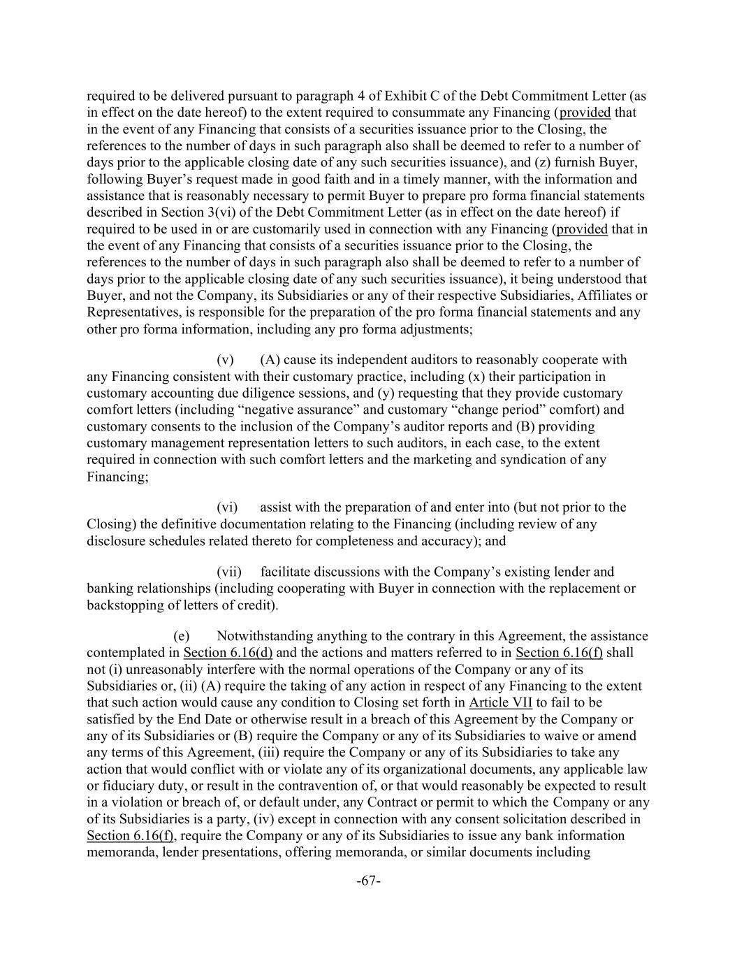 -67- required to be delivered pursuant to paragraph 4 of Exhibit C of the Debt Commitment Letter (as in effect on the date hereof) to the extent required to consummate any Financing (provided that in the event of any Financing that consists of a securities issuance prior to the Closing, the references to the number of days in such paragraph also shall be deemed to refer to a number of days prior to the applicable closing date of any such securities issuance), and (z) furnish Buyer, following Buyer’s request made in good faith and in a timely manner, with the information and assistance that is reasonably necessary to permit Buyer to prepare pro forma financial statements described in Section 3(vi) of the Debt Commitment Letter (as in effect on the date hereof) if required to be used in or are customarily used in connection with any Financing (provided that in the event of any Financing that consists of a securities issuance prior to the Closing, the references to the number of days in such paragraph also shall be deemed to refer to a number of days prior to the applicable closing date of any such securities issuance), it being understood that Buyer, and not the Company, its Subsidiaries or any of their respective Subsidiaries, Affiliates or Representatives, is responsible for the preparation of the pro forma financial statements and any other pro forma information, including any pro forma adjustments; (v) (A) cause its independent auditors to reasonably cooperate with any Financing consistent with their customary practice, including (x) their participation in customary accounting due diligence sessions, and (y) requesting that they provide customary comfort letters (including “negative assurance” and customary “change period” comfort) and customary consents to the inclusion of the Company’s auditor reports and (B) providing customary management representation letters to such auditors, in each case, to the extent required in connection with such comfort letters and the marketing and syndication of any Financing; (vi) assist with the preparation of and enter into (but not prior to the Closing) the definitive documentation relating to the Financing (including review of any disclosure schedules related thereto for completeness and accuracy); and (vii) facilitate discussions with the Company’s existing lender and banking relationships (including cooperating with Buyer in connection with the replacement or backstopping of letters of credit). (e) Notwithstanding anything to the contrary in this Agreement, the assistance contemplated in Section 6.16(d) and the actions and matters referred to in Section 6.16(f) shall not (i) unreasonably interfere with the normal operations of the Company or any of its Subsidiaries or, (ii) (A) require the taking of any action in respect of any Financing to the extent that such action would cause any condition to Closing set forth in Article VII to fail to be satisfied by the End Date or otherwise result in a breach of this Agreement by the Company or any of its Subsidiaries or (B) require the Company or any of its Subsidiaries to waive or amend any terms of this Agreement, (iii) require the Company or any of its Subsidiaries to take any action that would conflict with or violate any of its organizational documents, any applicable law or fiduciary duty, or result in the contravention of, or that would reasonably be expected to result in a violation or breach of, or default under, any Contract or permit to which the Company or any of its Subsidiaries is a party, (iv) except in connection with any consent solicitation described in Section 6.16(f), require the Company or any of its Subsidiaries to issue any bank information memoranda, lender presentations, offering memoranda, or similar documents including