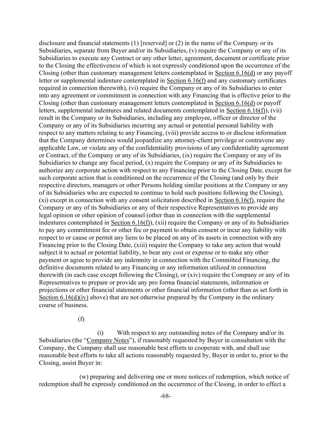 -68- disclosure and financial statements (1) [reserved] or (2) in the name of the Company or its Subsidiaries, separate from Buyer and/or its Subsidiaries, (v) require the Company or any of its Subsidiaries to execute any Contract or any other letter, agreement, document or certificate prior to the Closing the effectiveness of which is not expressly conditioned upon the occurrence of the Closing (other than customary management letters contemplated in Section 6.16(d) or any payoff letter or supplemental indenture contemplated in Section 6.16(f) and any customary certificates required in connection therewith), (vi) require the Company or any of its Subsidiaries to enter into any agreement or commitment in connection with any Financing that is effective prior to the Closing (other than customary management letters contemplated in Section 6.16(d) or payoff letters, supplemental indentures and related documents contemplated in Section 6.16(f)), (vii) result in the Company or its Subsidiaries, including any employee, officer or director of the Company or any of its Subsidiaries incurring any actual or potential personal liability with respect to any matters relating to any Financing, (viii) provide access to or disclose information that the Company determines would jeopardize any attorney-client privilege or contravene any applicable Law, or violate any of the confidentiality provisions of any confidentiality agreement or Contract, of the Company or any of its Subsidiaries, (ix) require the Company or any of its Subsidiaries to change any fiscal period, (x) require the Company or any of its Subsidiaries to authorize any corporate action with respect to any Financing prior to the Closing Date, except for such corporate action that is conditioned on the occurrence of the Closing (and only by their respective directors, managers or other Persons holding similar positions at the Company or any of its Subsidiaries who are expected to continue to hold such positions following the Closing), (xi) except in connection with any consent solicitation described in Section 6.16(f), require the Company or any of its Subsidiaries or any of their respective Representatives to provide any legal opinion or other opinion of counsel (other than in connection with the supplemental indentures contemplated in Section 6.16(f)), (xii) require the Company or any of its Subsidiaries to pay any commitment fee or other fee or payment to obtain consent or incur any liability with respect to or cause or permit any liens to be placed on any of its assets in connection with any Financing prior to the Closing Date, (xiii) require the Company to take any action that would subject it to actual or potential liability, to bear any cost or expense or to make any other payment or agree to provide any indemnity in connection with the Committed Financing, the definitive documents related to any Financing or any information utilized in connection therewith (in each case except following the Closing), or (xiv) require the Company or any of its Representatives to prepare or provide any pro forma financial statements, information or projections or other financial statements or other financial information (other than as set forth in Section 6.16(d)(iv) above) that are not otherwise prepared by the Company in the ordinary course of business. (f) (i) With respect to any outstanding notes of the Company and/or its Subsidiaries (the “Company Notes”), if reasonably requested by Buyer in consultation with the Company, the Company shall use reasonable best efforts to cooperate with, and shall use reasonable best efforts to take all actions reasonably requested by, Buyer in order to, prior to the Closing, assist Buyer in: (w) preparing and delivering one or more notices of redemption, which notice of redemption shall be expressly conditioned on the occurrence of the Closing, in order to effect a