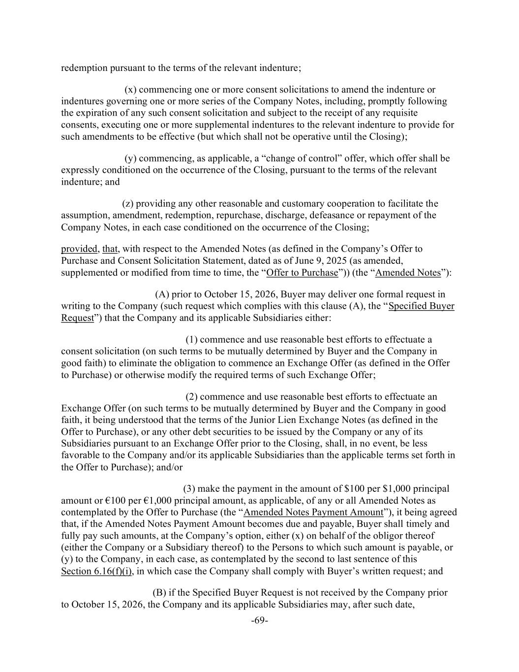 -69- redemption pursuant to the terms of the relevant indenture; (x) commencing one or more consent solicitations to amend the indenture or indentures governing one or more series of the Company Notes, including, promptly following the expiration of any such consent solicitation and subject to the receipt of any requisite consents, executing one or more supplemental indentures to the relevant indenture to provide for such amendments to be effective (but which shall not be operative until the Closing); (y) commencing, as applicable, a “change of control” offer, which offer shall be expressly conditioned on the occurrence of the Closing, pursuant to the terms of the relevant indenture; and (z) providing any other reasonable and customary cooperation to facilitate the assumption, amendment, redemption, repurchase, discharge, defeasance or repayment of the Company Notes, in each case conditioned on the occurrence of the Closing; provided, that, with respect to the Amended Notes (as defined in the Company’s Offer to Purchase and Consent Solicitation Statement, dated as of June 9, 2025 (as amended, supplemented or modified from time to time, the “Offer to Purchase”)) (the “Amended Notes”): (A) prior to October 15, 2026, Buyer may deliver one formal request in writing to the Company (such request which complies with this clause (A), the “Specified Buyer Request”) that the Company and its applicable Subsidiaries either: (1) commence and use reasonable best efforts to effectuate a consent solicitation (on such terms to be mutually determined by Buyer and the Company in good faith) to eliminate the obligation to commence an Exchange Offer (as defined in the Offer to Purchase) or otherwise modify the required terms of such Exchange Offer; (2) commence and use reasonable best efforts to effectuate an Exchange Offer (on such terms to be mutually determined by Buyer and the Company in good faith, it being understood that the terms of the Junior Lien Exchange Notes (as defined in the Offer to Purchase), or any other debt securities to be issued by the Company or any of its Subsidiaries pursuant to an Exchange Offer prior to the Closing, shall, in no event, be less favorable to the Company and/or its applicable Subsidiaries than the applicable terms set forth in the Offer to Purchase); and/or (3) make the payment in the amount of $100 per $1,000 principal amount or €100 per €1,000 principal amount, as applicable, of any or all Amended Notes as contemplated by the Offer to Purchase (the “Amended Notes Payment Amount”), it being agreed that, if the Amended Notes Payment Amount becomes due and payable, Buyer shall timely and fully pay such amounts, at the Company’s option, either (x) on behalf of the obligor thereof (either the Company or a Subsidiary thereof) to the Persons to which such amount is payable, or (y) to the Company, in each case, as contemplated by the second to last sentence of this Section 6.16(f)(i), in which case the Company shall comply with Buyer’s written request; and (B) if the Specified Buyer Request is not received by the Company prior to October 15, 2026, the Company and its applicable Subsidiaries may, after such date,