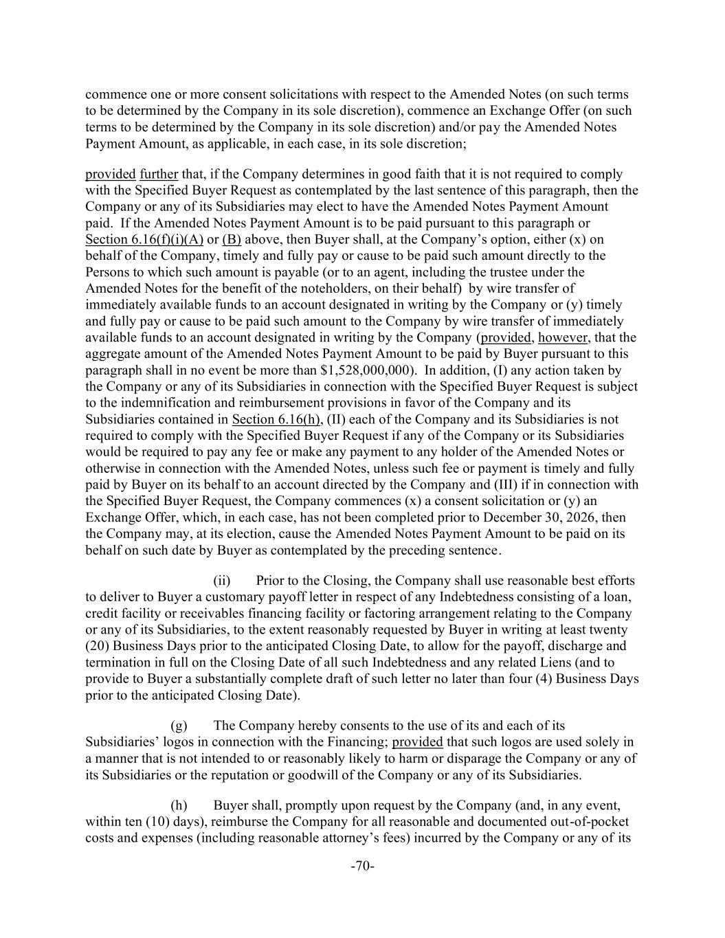 -70- commence one or more consent solicitations with respect to the Amended Notes (on such terms to be determined by the Company in its sole discretion), commence an Exchange Offer (on such terms to be determined by the Company in its sole discretion) and/or pay the Amended Notes Payment Amount, as applicable, in each case, in its sole discretion; provided further that, if the Company determines in good faith that it is not required to comply with the Specified Buyer Request as contemplated by the last sentence of this paragraph, then the Company or any of its Subsidiaries may elect to have the Amended Notes Payment Amount paid. If the Amended Notes Payment Amount is to be paid pursuant to this paragraph or Section 6.16(f)(i)(A) or (B) above, then Buyer shall, at the Company’s option, either (x) on behalf of the Company, timely and fully pay or cause to be paid such amount directly to the Persons to which such amount is payable (or to an agent, including the trustee under the Amended Notes for the benefit of the noteholders, on their behalf) by wire transfer of immediately available funds to an account designated in writing by the Company or (y) timely and fully pay or cause to be paid such amount to the Company by wire transfer of immediately available funds to an account designated in writing by the Company (provided, however, that the aggregate amount of the Amended Notes Payment Amount to be paid by Buyer pursuant to this paragraph shall in no event be more than $1,528,000,000). In addition, (I) any action taken by the Company or any of its Subsidiaries in connection with the Specified Buyer Request is subject to the indemnification and reimbursement provisions in favor of the Company and its Subsidiaries contained in Section 6.16(h), (II) each of the Company and its Subsidiaries is not required to comply with the Specified Buyer Request if any of the Company or its Subsidiaries would be required to pay any fee or make any payment to any holder of the Amended Notes or otherwise in connection with the Amended Notes, unless such fee or payment is timely and fully paid by Buyer on its behalf to an account directed by the Company and (III) if in connection with the Specified Buyer Request, the Company commences (x) a consent solicitation or (y) an Exchange Offer, which, in each case, has not been completed prior to December 30, 2026, then the Company may, at its election, cause the Amended Notes Payment Amount to be paid on its behalf on such date by Buyer as contemplated by the preceding sentence. (ii) Prior to the Closing, the Company shall use reasonable best efforts to deliver to Buyer a customary payoff letter in respect of any Indebtedness consisting of a loan, credit facility or receivables financing facility or factoring arrangement relating to the Company or any of its Subsidiaries, to the extent reasonably requested by Buyer in writing at least twenty (20) Business Days prior to the anticipated Closing Date, to allow for the payoff, discharge and termination in full on the Closing Date of all such Indebtedness and any related Liens (and to provide to Buyer a substantially complete draft of such letter no later than four (4) Business Days prior to the anticipated Closing Date). (g) The Company hereby consents to the use of its and each of its Subsidiaries’ logos in connection with the Financing; provided that such logos are used solely in a manner that is not intended to or reasonably likely to harm or disparage the Company or any of its Subsidiaries or the reputation or goodwill of the Company or any of its Subsidiaries. (h) Buyer shall, promptly upon request by the Company (and, in any event, within ten (10) days), reimburse the Company for all reasonable and documented out-of-pocket costs and expenses (including reasonable attorney’s fees) incurred by the Company or any of its