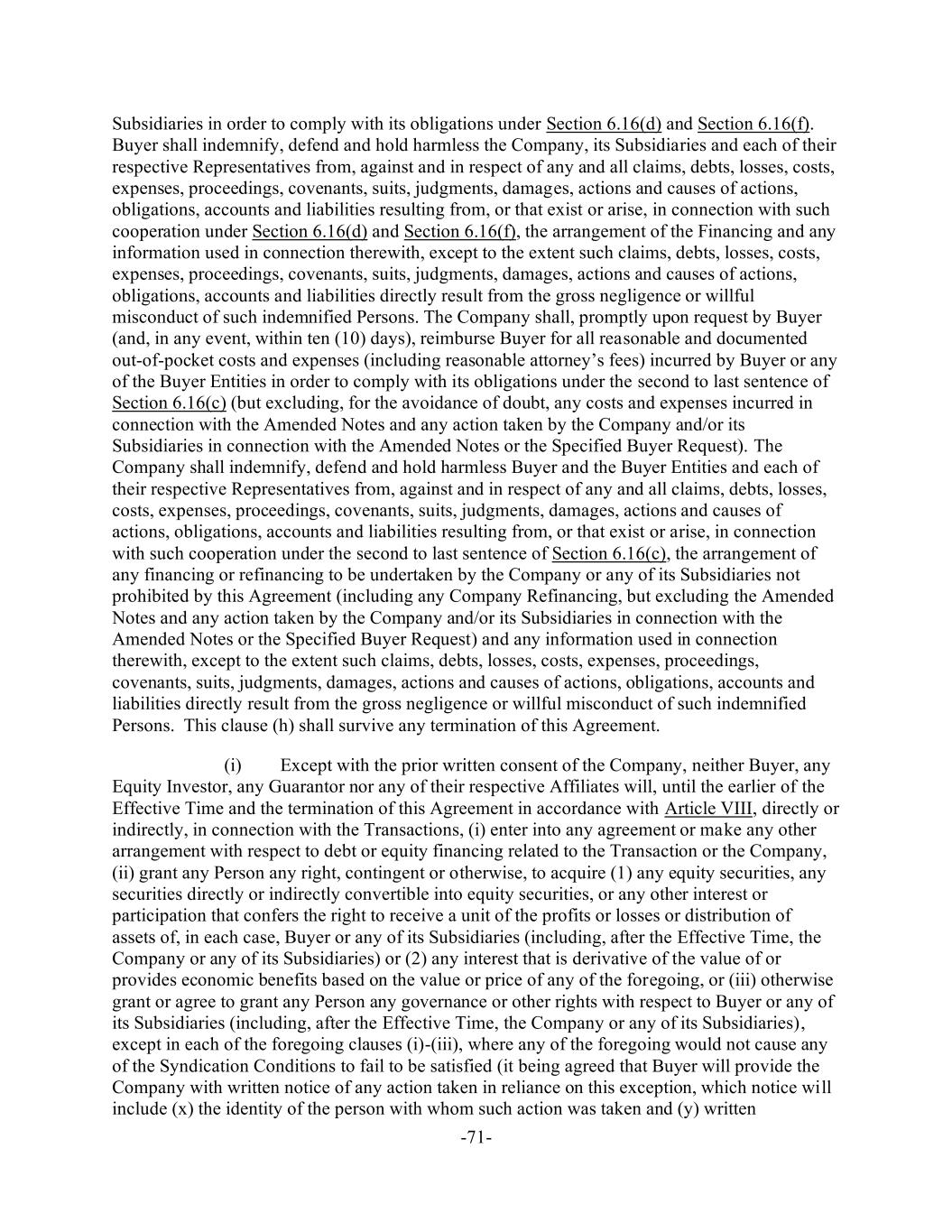 -71- Subsidiaries in order to comply with its obligations under Section 6.16(d) and Section 6.16(f). Buyer shall indemnify, defend and hold harmless the Company, its Subsidiaries and each of their respective Representatives from, against and in respect of any and all claims, debts, losses, costs, expenses, proceedings, covenants, suits, judgments, damages, actions and causes of actions, obligations, accounts and liabilities resulting from, or that exist or arise, in connection with such cooperation under Section 6.16(d) and Section 6.16(f), the arrangement of the Financing and any information used in connection therewith, except to the extent such claims, debts, losses, costs, expenses, proceedings, covenants, suits, judgments, damages, actions and causes of actions, obligations, accounts and liabilities directly result from the gross negligence or willful misconduct of such indemnified Persons. The Company shall, promptly upon request by Buyer (and, in any event, within ten (10) days), reimburse Buyer for all reasonable and documented out-of-pocket costs and expenses (including reasonable attorney’s fees) incurred by Buyer or any of the Buyer Entities in order to comply with its obligations under the second to last sentence of Section 6.16(c) (but excluding, for the avoidance of doubt, any costs and expenses incurred in connection with the Amended Notes and any action taken by the Company and/or its Subsidiaries in connection with the Amended Notes or the Specified Buyer Request). The Company shall indemnify, defend and hold harmless Buyer and the Buyer Entities and each of their respective Representatives from, against and in respect of any and all claims, debts, losses, costs, expenses, proceedings, covenants, suits, judgments, damages, actions and causes of actions, obligations, accounts and liabilities resulting from, or that exist or arise, in connection with such cooperation under the second to last sentence of Section 6.16(c), the arrangement of any financing or refinancing to be undertaken by the Company or any of its Subsidiaries not prohibited by this Agreement (including any Company Refinancing, but excluding the Amended Notes and any action taken by the Company and/or its Subsidiaries in connection with the Amended Notes or the Specified Buyer Request) and any information used in connection therewith, except to the extent such claims, debts, losses, costs, expenses, proceedings, covenants, suits, judgments, damages, actions and causes of actions, obligations, accounts and liabilities directly result from the gross negligence or willful misconduct of such indemnified Persons. This clause (h) shall survive any termination of this Agreement. (i) Except with the prior written consent of the Company, neither Buyer, any Equity Investor, any Guarantor nor any of their respective Affiliates will, until the earlier of the Effective Time and the termination of this Agreement in accordance with Article VIII, directly or indirectly, in connection with the Transactions, (i) enter into any agreement or make any other arrangement with respect to debt or equity financing related to the Transaction or the Company, (ii) grant any Person any right, contingent or otherwise, to acquire (1) any equity securities, any securities directly or indirectly convertible into equity securities, or any other interest or participation that confers the right to receive a unit of the profits or losses or distribution of assets of, in each case, Buyer or any of its Subsidiaries (including, after the Effective Time, the Company or any of its Subsidiaries) or (2) any interest that is derivative of the value of or provides economic benefits based on the value or price of any of the foregoing, or (iii) otherwise grant or agree to grant any Person any governance or other rights with respect to Buyer or any of its Subsidiaries (including, after the Effective Time, the Company or any of its Subsidiaries), except in each of the foregoing clauses (i)-(iii), where any of the foregoing would not cause any of the Syndication Conditions to fail to be satisfied (it being agreed that Buyer will provide the Company with written notice of any action taken in reliance on this exception, which notice will include (x) the identity of the person with whom such action was taken and (y) written