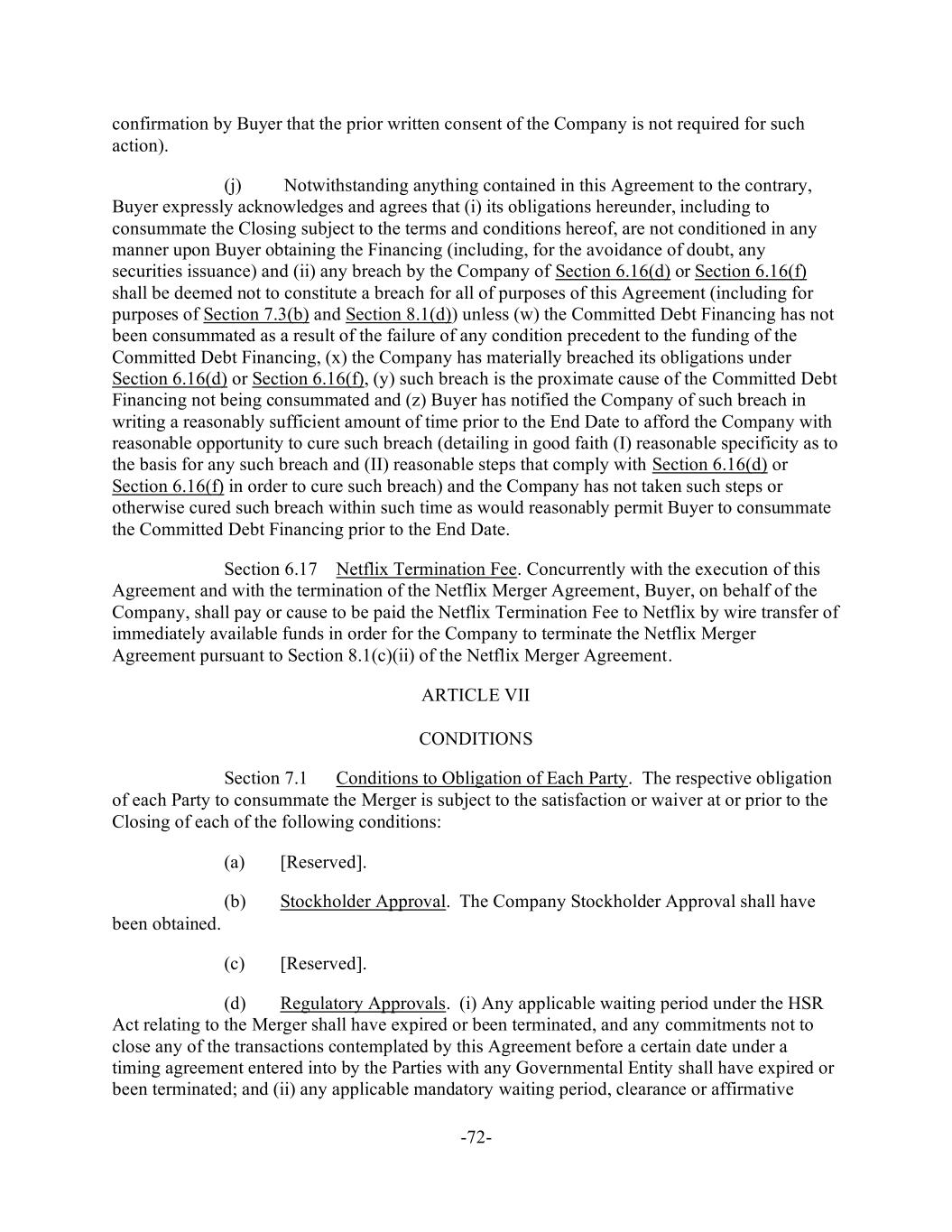 -72- confirmation by Buyer that the prior written consent of the Company is not required for such action). (j)  Notwithstanding anything contained in this Agreement to the contrary, Buyer expressly acknowledges and agrees that (i) its obligations hereunder, including to consummate the Closing subject to the terms and conditions hereof, are not conditioned in any manner upon Buyer obtaining the Financing (including, for the avoidance of doubt, any securities issuance) and (ii) any breach by the Company of Section 6.16(d) or Section 6.16(f) shall be deemed not to constitute a breach for all of purposes of this Agreement (including for purposes of Section 7.3(b) and Section 8.1(d)) unless (w) the Committed Debt Financing has not been consummated as a result of the failure of any condition precedent to the funding of the Committed Debt Financing, (x) the Company has materially breached its obligations under Section 6.16(d) or Section 6.16(f), (y) such breach is the proximate cause of the Committed Debt Financing not being consummated and (z) Buyer has notified the Company of such breach in writing a reasonably sufficient amount of time prior to the End Date to afford the Company with reasonable opportunity to cure such breach (detailing in good faith (I) reasonable specificity as to the basis for any such breach and (II) reasonable steps that comply with Section 6.16(d) or Section 6.16(f) in order to cure such breach) and the Company has not taken such steps or otherwise cured such breach within such time as would reasonably permit Buyer to consummate the Committed Debt Financing prior to the End Date. Section 6.17 Netflix Termination Fee. Concurrently with the execution of this Agreement and with the termination of the Netflix Merger Agreement, Buyer, on behalf of the Company, shall pay or cause to be paid the Netflix Termination Fee to Netflix by wire transfer of immediately available funds in order for the Company to terminate the Netflix Merger Agreement pursuant to Section 8.1(c)(ii) of the Netflix Merger Agreement. ARTICLE VII CONDITIONS Section 7.1 Conditions to Obligation of Each Party. The respective obligation of each Party to consummate the Merger is subject to the satisfaction or waiver at or prior to the Closing of each of the following conditions: (a) [Reserved]. (b) Stockholder Approval. The Company Stockholder Approval shall have been obtained. (c) [Reserved]. (d) Regulatory Approvals. (i) Any applicable waiting period under the HSR Act relating to the Merger shall have expired or been terminated, and any commitments not to close any of the transactions contemplated by this Agreement before a certain date under a timing agreement entered into by the Parties with any Governmental Entity shall have expired or been terminated; and (ii) any applicable mandatory waiting period, clearance or affirmative