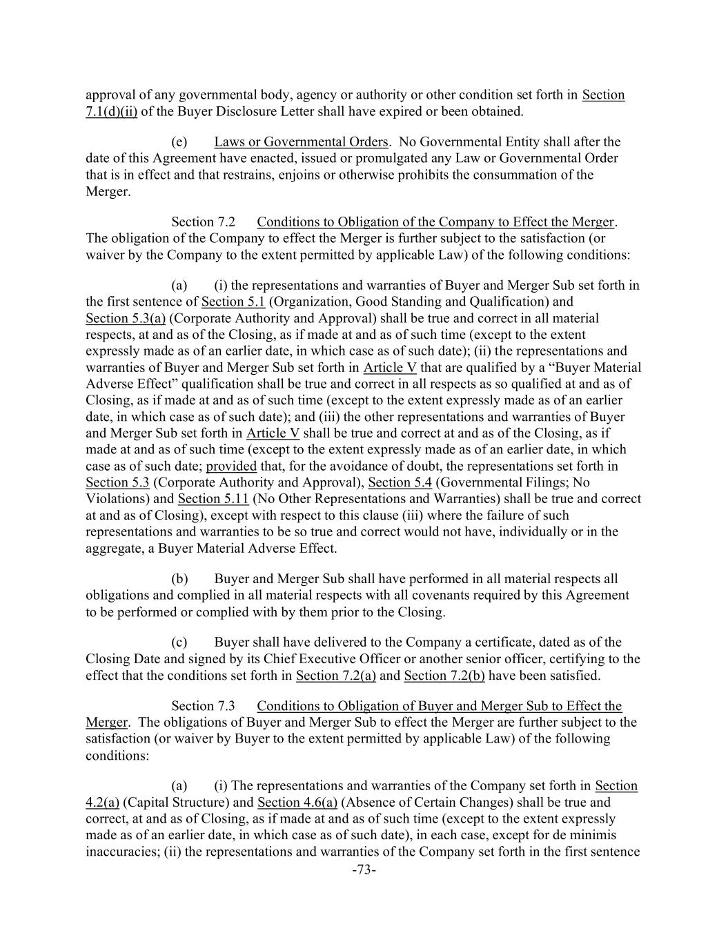 -73- approval of any governmental body, agency or authority or other condition set forth in Section 7.1(d)(ii) of the Buyer Disclosure Letter shall have expired or been obtained. (e) Laws or Governmental Orders. No Governmental Entity shall after the date of this Agreement have enacted, issued or promulgated any Law or Governmental Order that is in effect and that restrains, enjoins or otherwise prohibits the consummation of the Merger. Section 7.2 Conditions to Obligation of the Company to Effect the Merger. The obligation of the Company to effect the Merger is further subject to the satisfaction (or waiver by the Company to the extent permitted by applicable Law) of the following conditions: (a) (i) the representations and warranties of Buyer and Merger Sub set forth in the first sentence of Section 5.1 (Organization, Good Standing and Qualification) and Section 5.3(a) (Corporate Authority and Approval) shall be true and correct in all material respects, at and as of the Closing, as if made at and as of such time (except to the extent expressly made as of an earlier date, in which case as of such date); (ii) the representations and warranties of Buyer and Merger Sub set forth in Article V that are qualified by a “Buyer Material Adverse Effect” qualification shall be true and correct in all respects as so qualified at and as of Closing, as if made at and as of such time (except to the extent expressly made as of an earlier date, in which case as of such date); and (iii) the other representations and warranties of Buyer and Merger Sub set forth in Article V shall be true and correct at and as of the Closing, as if made at and as of such time (except to the extent expressly made as of an earlier date, in which case as of such date; provided that, for the avoidance of doubt, the representations set forth in Section 5.3 (Corporate Authority and Approval), Section 5.4 (Governmental Filings; No Violations) and Section 5.11 (No Other Representations and Warranties) shall be true and correct at and as of Closing), except with respect to this clause (iii) where the failure of such representations and warranties to be so true and correct would not have, individually or in the aggregate, a Buyer Material Adverse Effect. (b) Buyer and Merger Sub shall have performed in all material respects all obligations and complied in all material respects with all covenants required by this Agreement to be performed or complied with by them prior to the Closing. (c) Buyer shall have delivered to the Company a certificate, dated as of the Closing Date and signed by its Chief Executive Officer or another senior officer, certifying to the effect that the conditions set forth in Section 7.2(a) and Section 7.2(b) have been satisfied. Section 7.3 Conditions to Obligation of Buyer and Merger Sub to Effect the Merger. The obligations of Buyer and Merger Sub to effect the Merger are further subject to the satisfaction (or waiver by Buyer to the extent permitted by applicable Law) of the following conditions: (a) (i) The representations and warranties of the Company set forth in Section 4.2(a) (Capital Structure) and Section 4.6(a) (Absence of Certain Changes) shall be true and correct, at and as of Closing, as if made at and as of such time (except to the extent expressly made as of an earlier date, in which case as of such date), in each case, except for de minimis inaccuracies; (ii) the representations and warranties of the Company set forth in the first sentence